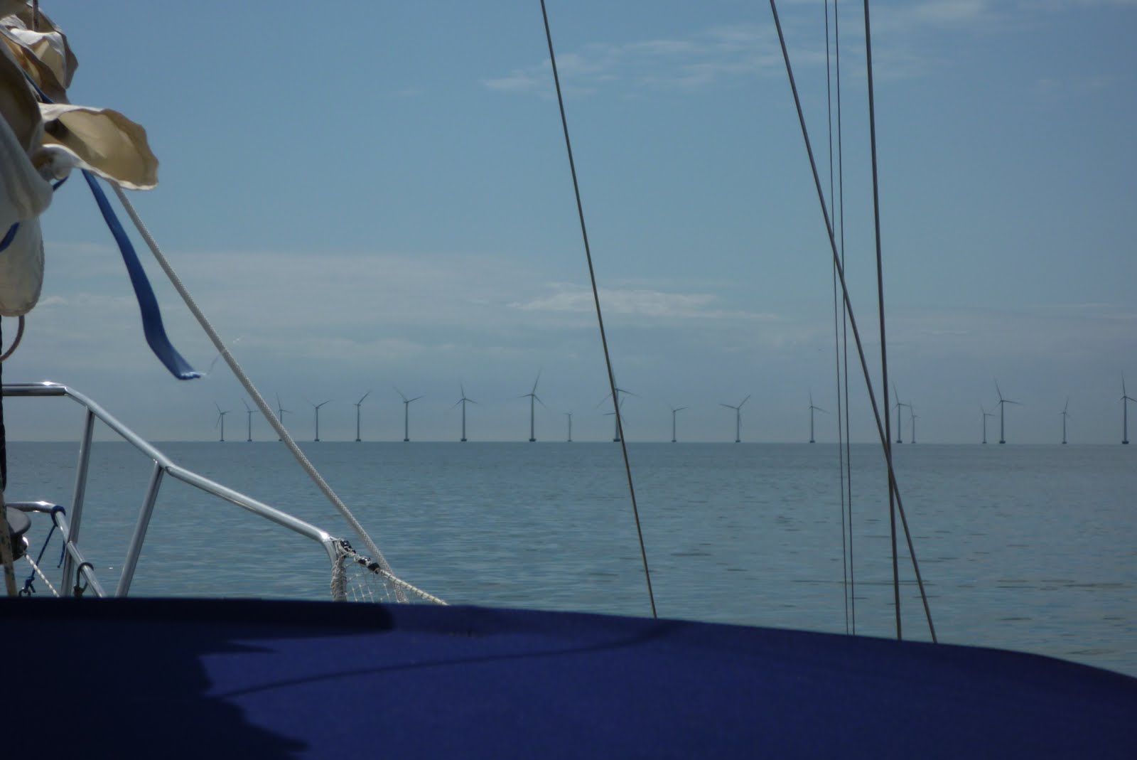 … auf Sturm folgt Flaute und so geht´s unter Motor durch den Windpark über die Ostsee zurück nach Warnemünde…