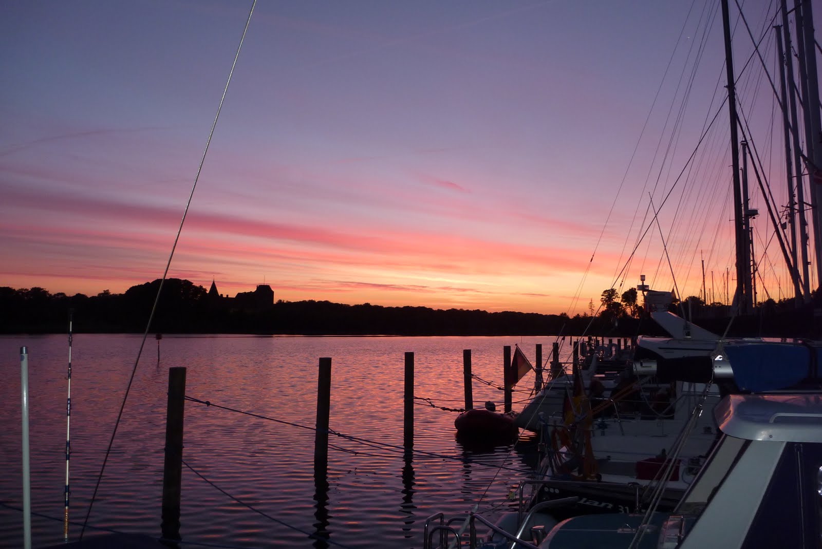 …und herrliche Sonnenuntergänge mit Blick auf die Mittelalterburg von Nysted…