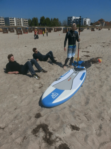 Ab Freitag stellte sich dann die vorhergesagte Ostwindlage ein. Blauer Himmel von Sonnenauf- bis Sonnenuntergang. Vormittags machten wir einen Ausflug nach Burg und stöberten durch die Surfshops und stärkten uns mit Fischbrötchen. Nachmittags frischte der Wind dann kräftig auf und da wir nicht sicher waren, ob am Südstrand gekitet werden darf, bauten wir zunächst am Binnensee beim Surfcenter auf. Mit 9er Kite surfte ich bei böigem Wind über die Lagune. Holger versuchte sich mit Windsurfen. Der Spot war durch fehlenden Anlandeplatz und Nähe zum Yachthafen nicht optimal und auch der böige Wind nicht. Außerdem erinnerte mich ein Kitelehrer auf der Lagune, dass hier Schulungsgebiet ist. Holger zog ab zum Südstrand und ich hatte erstmal genug. Chillten dann lieber noch am Strand und sahen dort den Kitern zu. Denn offenbar durfte man während des Festival hier auch Kiten. Toll – Material lag schon wieder an Bord. Also dann am nächsten Tag. Außerdem wollten wir ja noch Grillen und später zur Party.