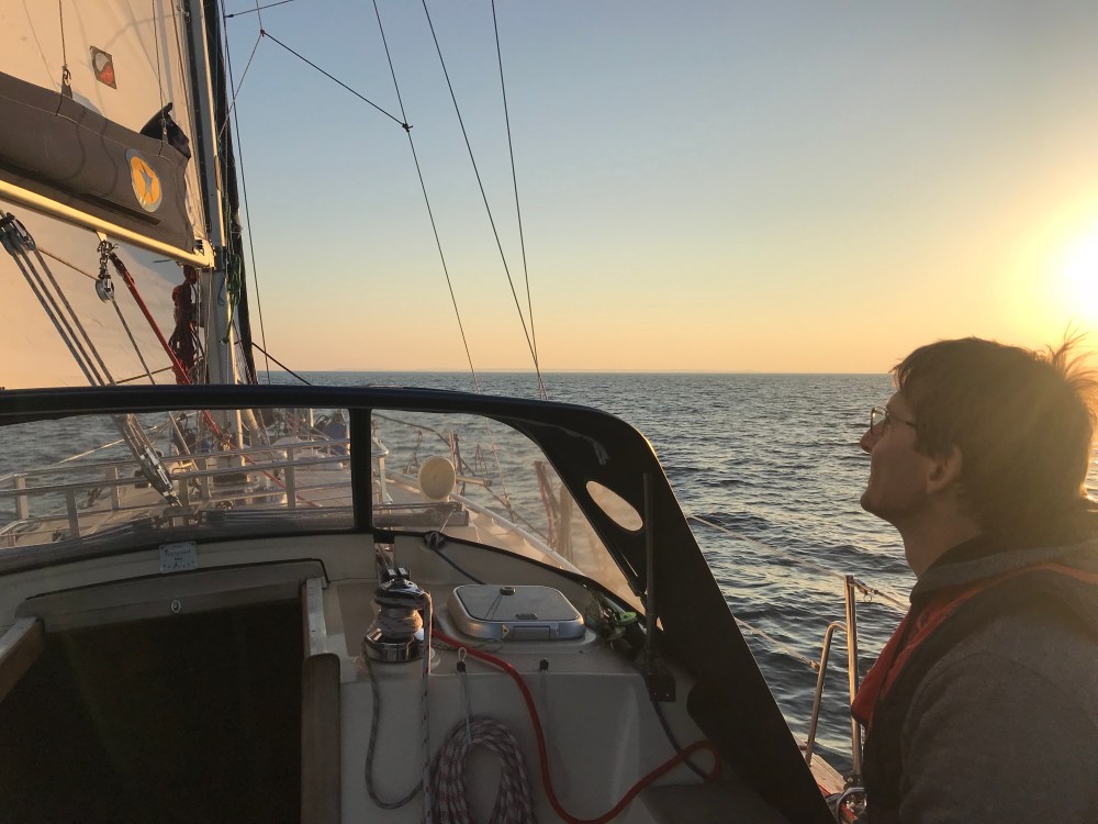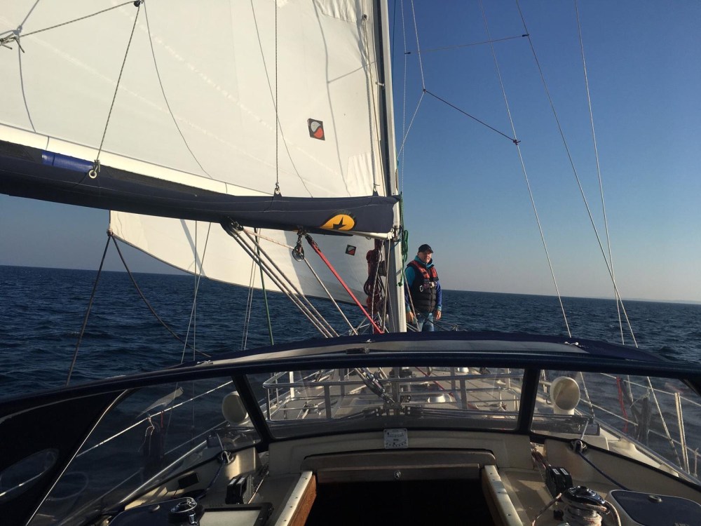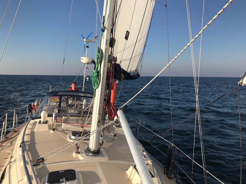 Kurz nach 8 Uhr lösten wir die Leinen und setzten bei Halbwindkurs die Segel. Frühstück gab es unterwegs und reichlich Sonne ebenfalls. Perfekte Bedingungen mit ablandigem Südostwind bescherten uns wenig Welle und rauschende Fahrt. Bei 5-6 Beaufort rutschte die Logge nie unter 5 Knoten. Meist waren es 6, 7 oder sogar 8 Knoten. Schon um 14 Uhr passierten wir die Molenköpfe von Warnemünde. Ein gelungener Segelgenuss mit T-Shirt tauglichen Temperaturen mitten im Oktober. Warum muss bloß der Winter hierzulande die Saison unterbrechen.