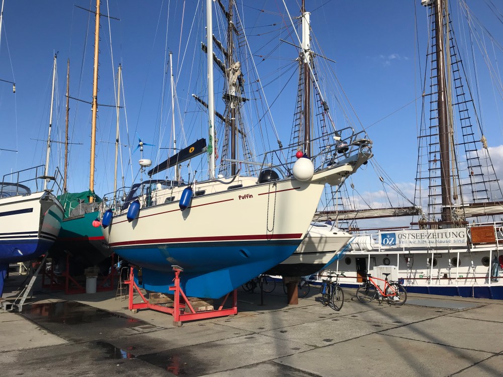 Der erste Nachtfrost hatte sich schon blicken lassen. Am Wochenende waren wir noch im Stadthafen beim Schiff. Das Trinkwassersystem musste entleert werden, das Schlauchboot zusammen gepackt und das Großsegel noch abgeschlagen werden.