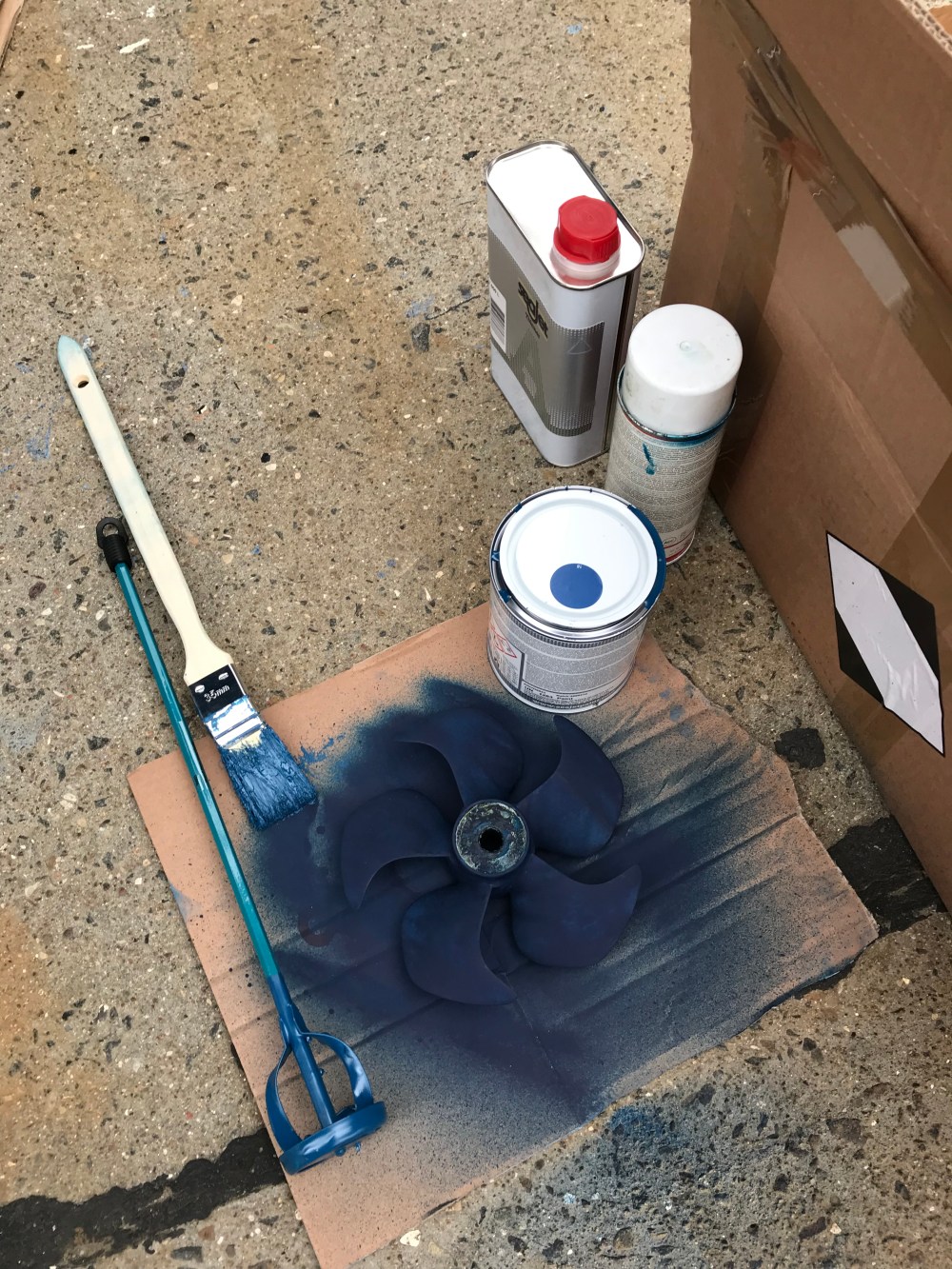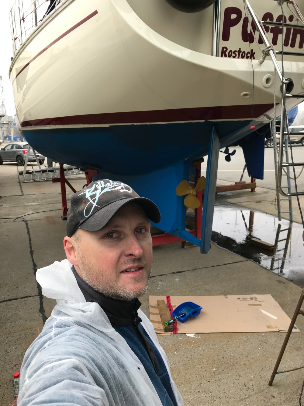 Die Muskeln schmerzen in jeder Faser. Nach fast 6 Stunden Schleifen, Abkleben und vor allem Streichen war es gestern gegen 18 Uhr endlich geschafft. Das Unterwasserschiff ist nun mit einer frischen navi-blauen Schicht Antifouling überzogen. Zumindest fast überall. In die Lieferung meiner Farbtöpfe hatte sich ein Topf mid-blue gemogelt. Natürlich war es gleich die erste Dose, die ich im Einsatz hatte. Also musste ich zum Schluss nochmal ein Viertel des Schiffs mit einer zweiten Schicht überdecken. Wenigstens erstreckt sich der Muskelkater über den ganzen Körper. Gutes Workout. Zum Glück nur einmal pro Jahr in dieser Form. Nun kann jedenfalls die neue Saison kommen.