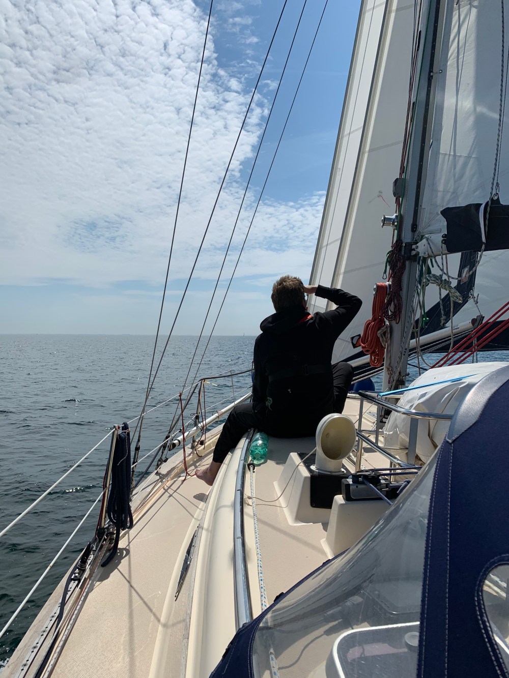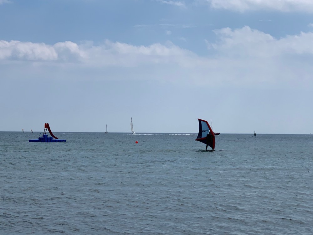 Legten uns in Burgtiefe am Binnensee an einen Stegkopf mit Blick auf die Kiteschüler in der Lagune. Erstmal ein Anlegebierchen. Hatten bei dem Wellengang draußen Luft ins Druckwassersystem gezogen. Jedenfalls lief die Pumpe, ohne das Wasser aus dem Hahn kam. Mit diesem kleinen Problem hatten wir gut zu tun. Die Lösung brachte erst der nächste Tag mit kräftigem Blasen in den Ansaugschlauch zwischen Wassertank und Pumpe nachdem wir vorher sogar schon die Pumpe zerlegt und den Wasserschlauch vom Steg unter Deck angeschlossen hatten.