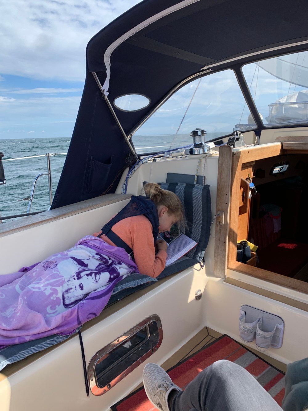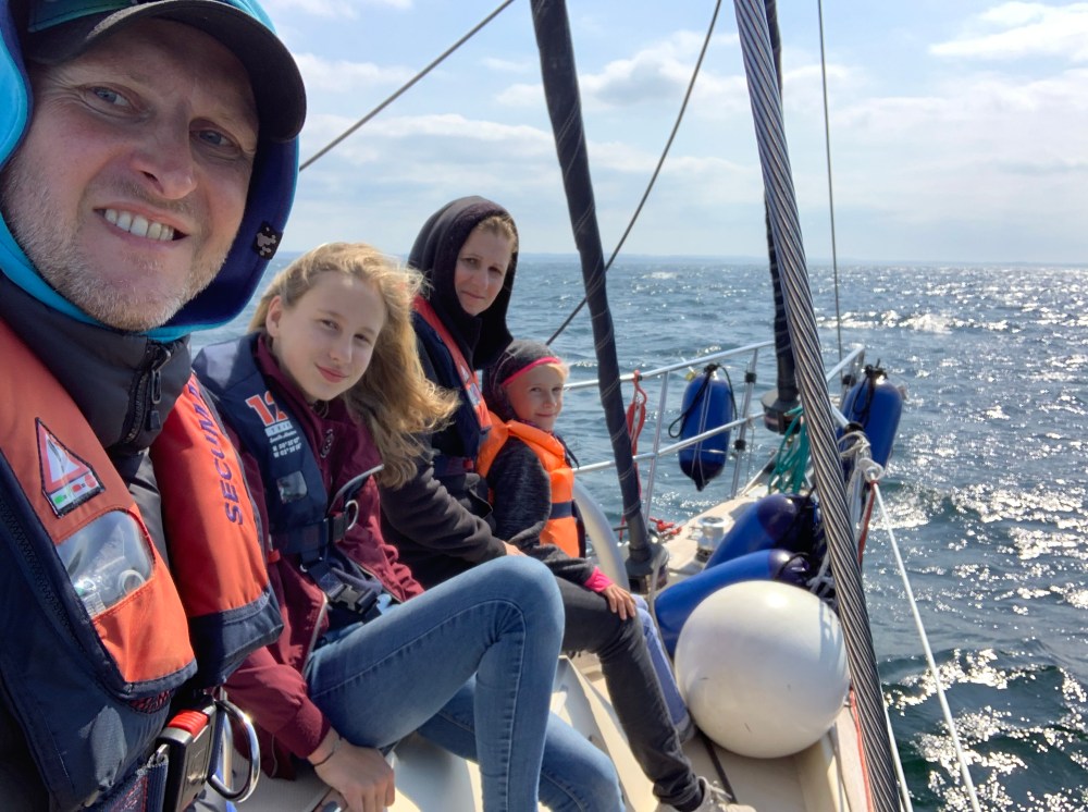 Samstag weht es mit 6 Windstärken und zwar für uns von hinten. Während unsere Freunde mühsam mit Motorkraft gegen Wellenberge anknüppeln, rauschen wir mit Rekordgeschwindigkeit nur unter Genua unserem Ziel entgegen. In weniger als 4 Stunden sind die 24 Seemeilen geschafft. Der Hafen ist kurz nach 13 Uhr schon proppenvoll. Wir ergattern den letzten Boxenplatz. Der ganze Längsseitssteg ist für eine ankommende Regatta reserviert. Als die Yuendumu sich endlich auch zum Hafen gekämpft hat, bleibt schließlich nur noch ein Platz am hohen Steg zwischen den Kuttern. Die Kinder sind traurig, das wir nun nicht nebeneinander liegen. Dafür wassere ich unser Schlauchboot und nehme unseren neuen Außenbordmotor in Betrieb. Nun haben wir ein Shuttle.