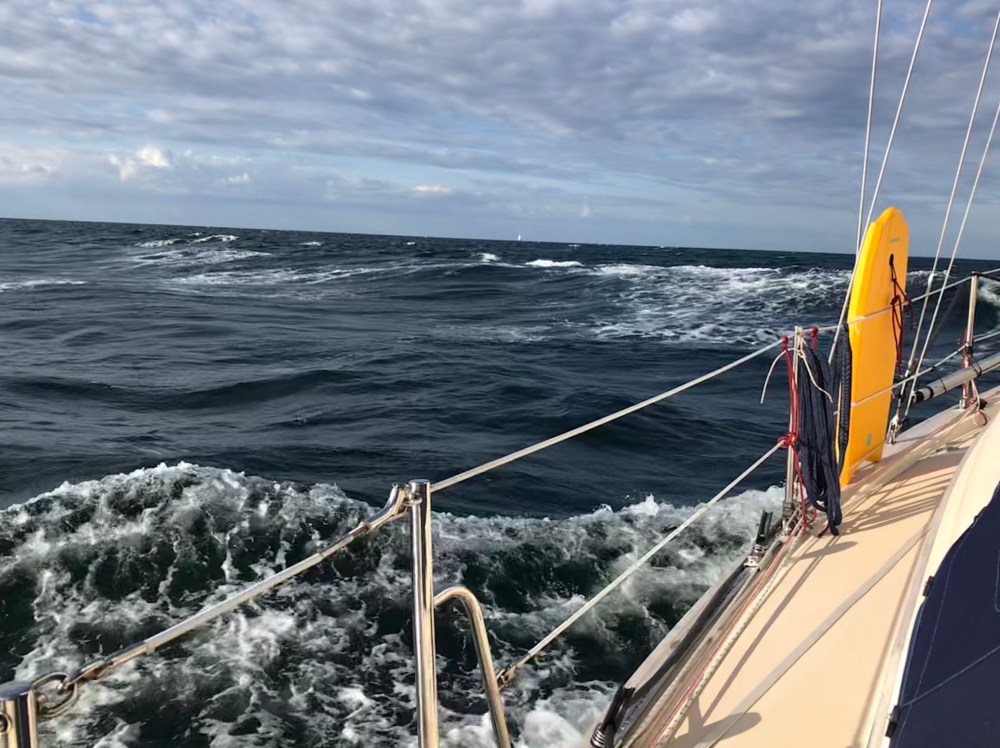 Unsere Freunde von der Yuendumu starteten von Rostock mit rund 15 Seemeilen Vorsprung. Mit ab Kühlungsborn einem Reff im Großsegel starteten wir die Verfolgungsjagd. Bis 2,5 Meter Welle schüttelte und dabei von der Seite durch. Beide Kinder fütterten mehrfach die Fische.