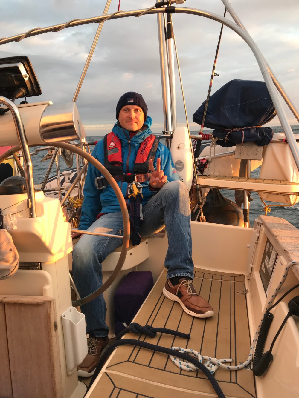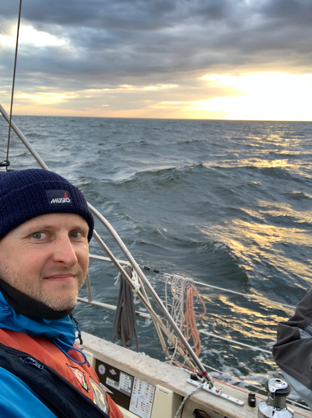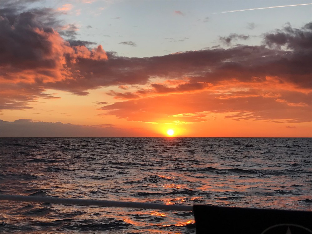 Doch es frischte sogar wieder etwas auf und reichlich angepowert jagte ich mit bis über 7 Knoten durch die Nacht. Mit Sundowner Mix aus der Bose-Box. Um halb 4 löste mich mit dem Morgenlicht Jeannette ab. Konnte nur kurz Dösen.