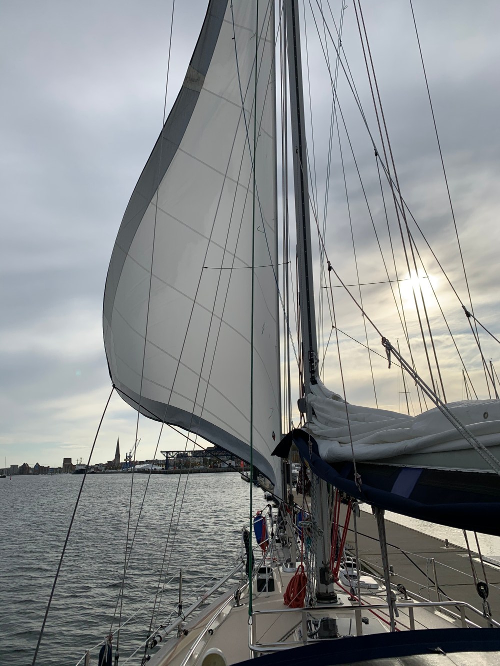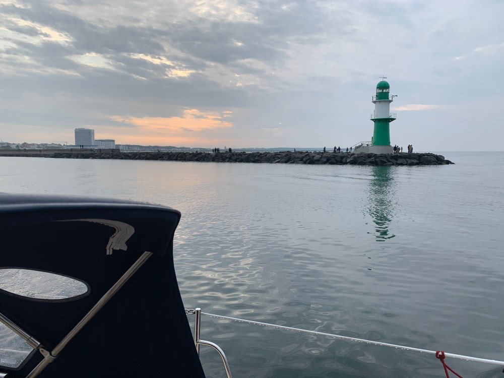 Morgens war dann doch der Schädel ziemlich schwer und statt um 8 Uhr verließen wir den Hafen erst um 9:40 Uhr. Der Himmel grau und diesig. Nässe liegt in der Luft. Nachts hatte es geregnet. Kurz vor Timmendorf standen alle Segel und mit mehr als 5 Knoten schob uns der SSO hoch am Wind die Küste entlang. Die Chillout-Bässe aus der Box locken ganz langsam wieder Farbe in unsere Gesichter. Der Autopilot sorgt für Entlastung um Ruder.