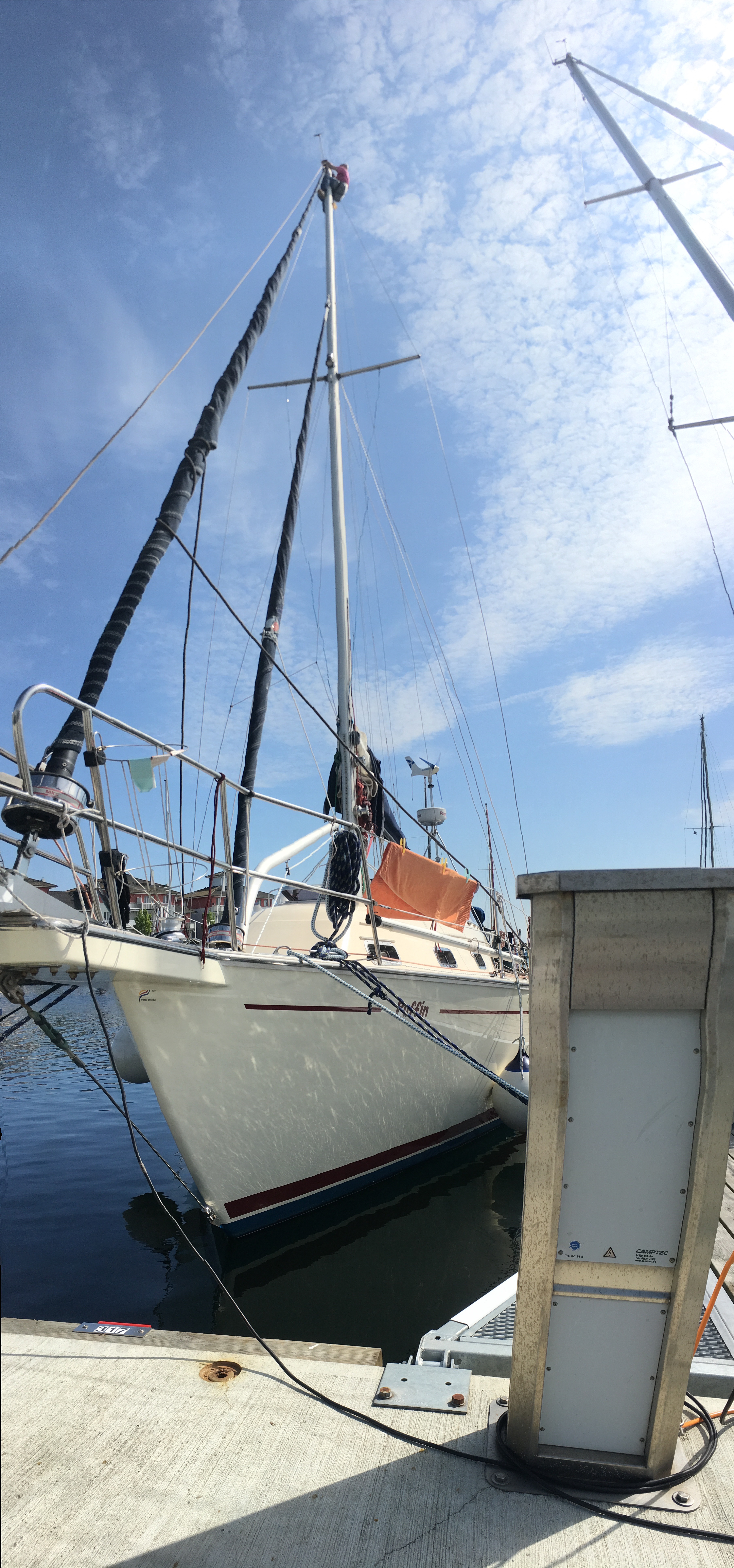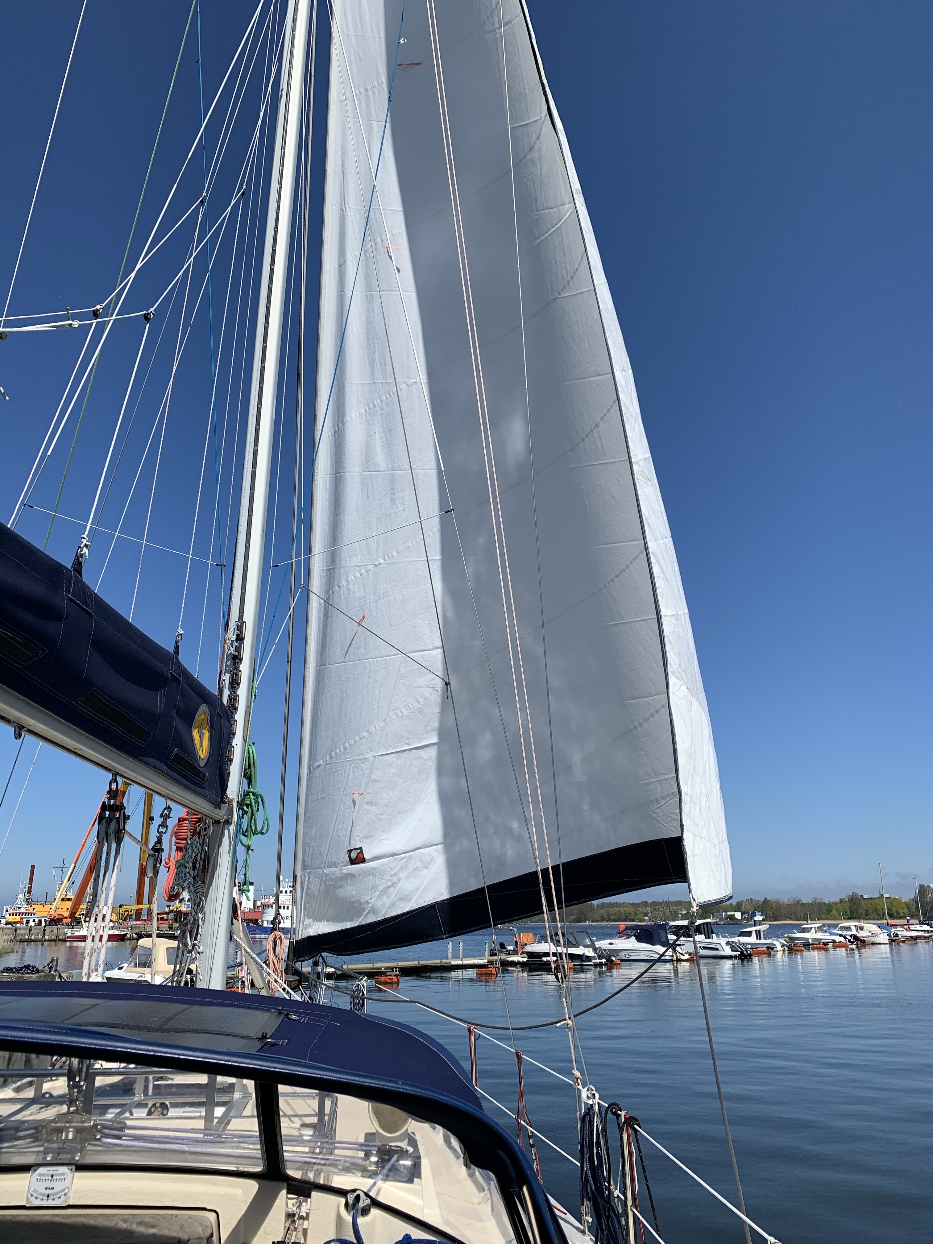 Alles klappte planmäßig. Nur den Liegeplatz für die Nacht wollte man uns zunächst verwehren, da angeblich kein Platz war. Darum motorten wir bis zum Stadthafen, wo wir nach dem Anlegen ebenfalls abgewiesen wurden. Angeblich noch wegen der Corona-Verbote. Also fuhren wir zurück und ein Telefonat später bekamen wir beim Winterlager doch noch einen Platz an der Kaimauer. Dort war es schön geschützt und perfekt, um die Segel anzubauen.