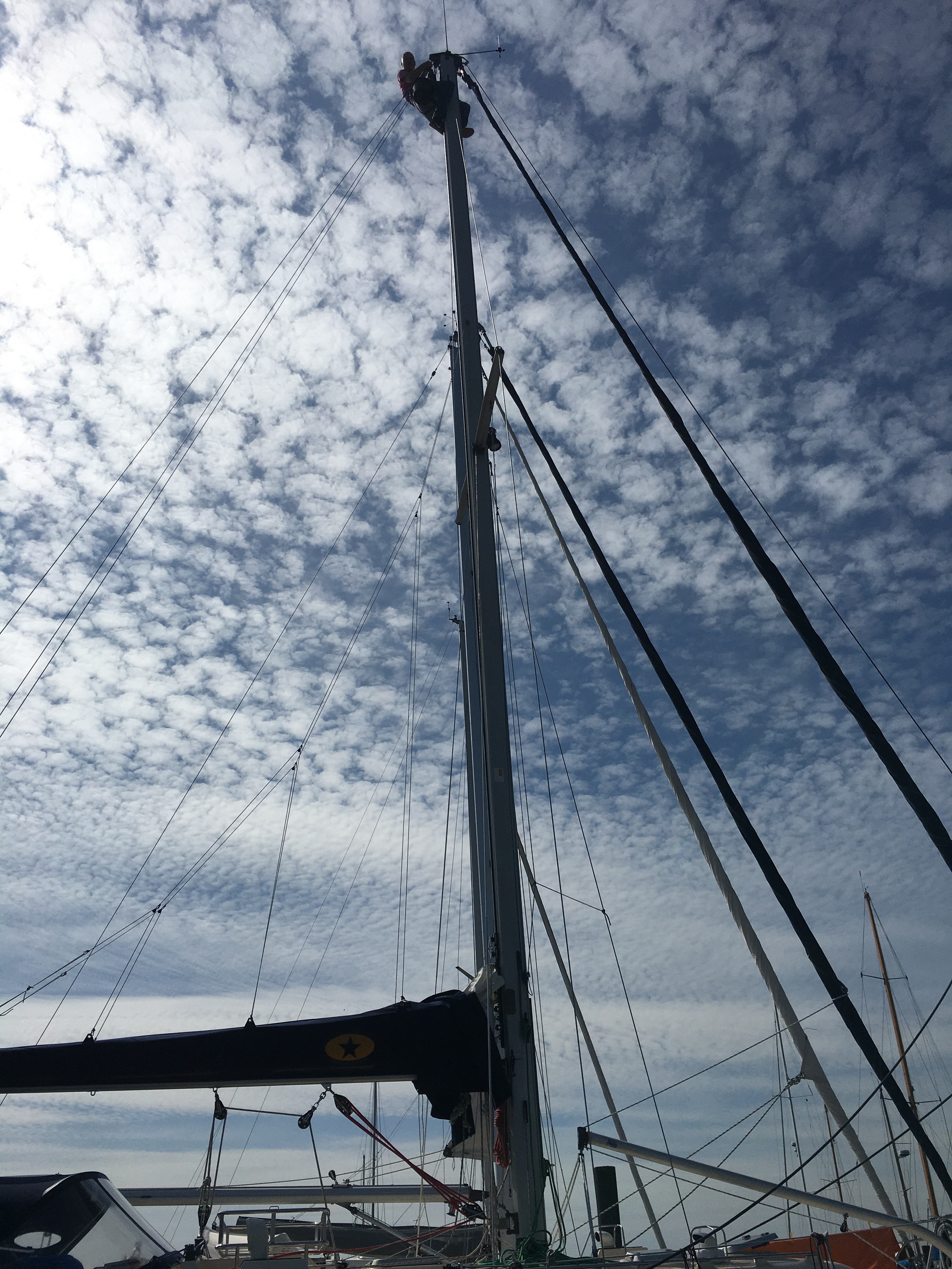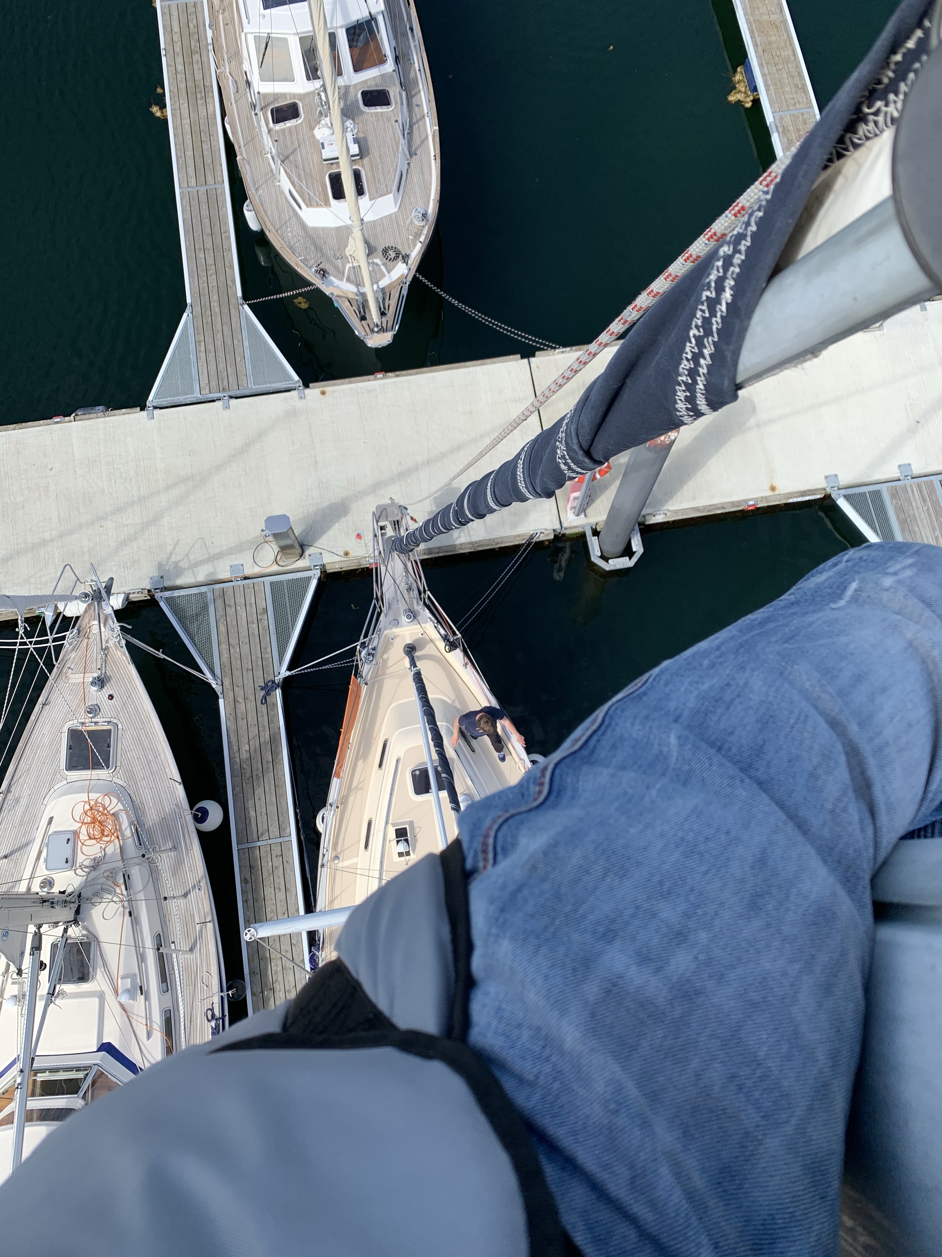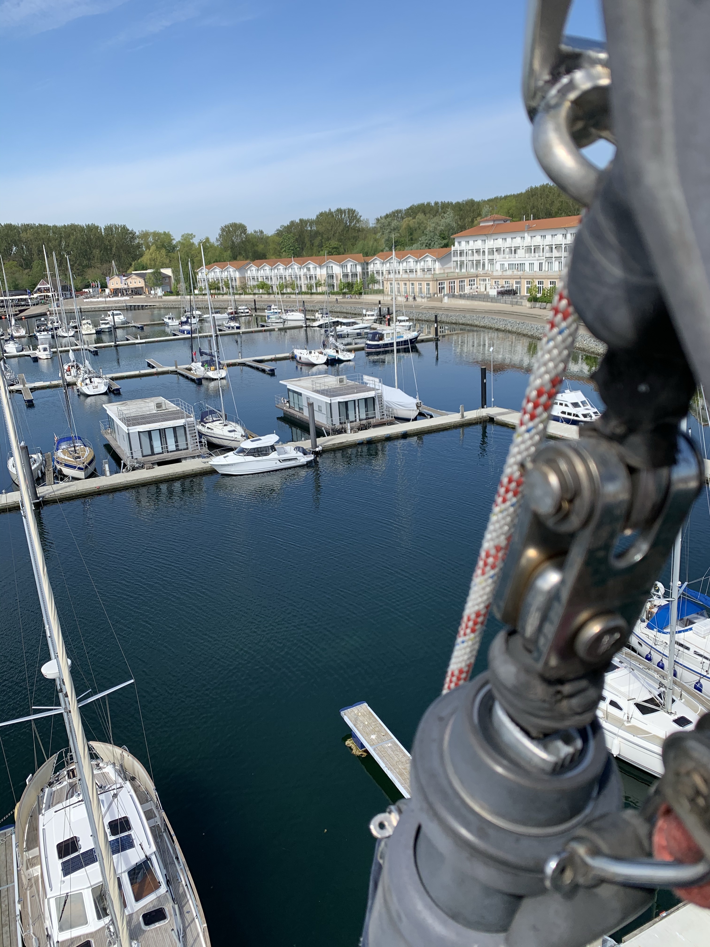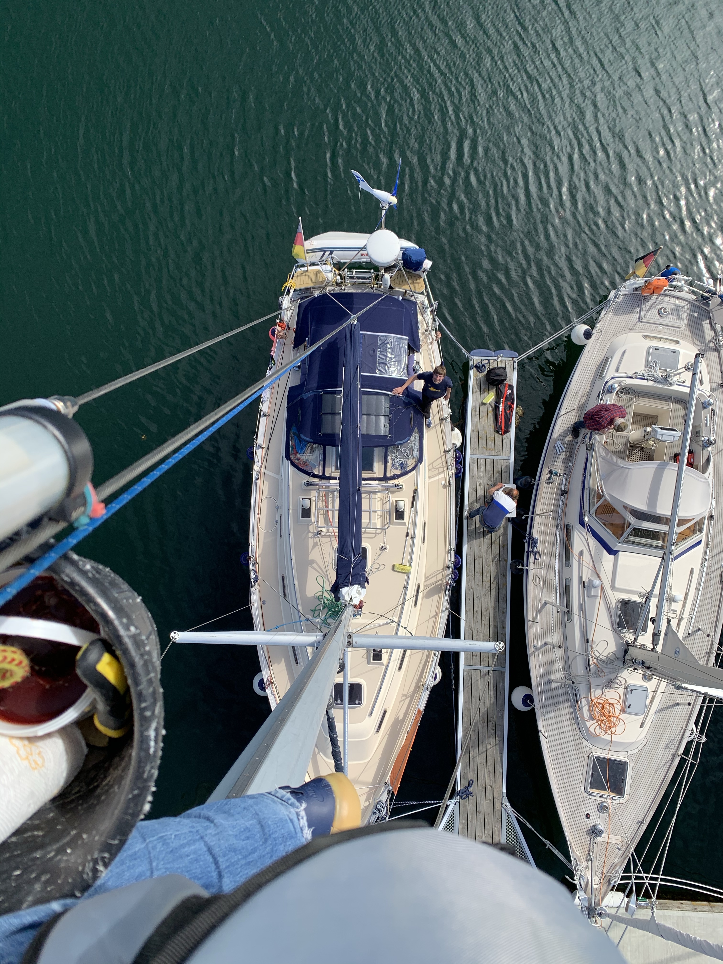 Den Sonntag haben wir nach gemütlichem Frühstück dann noch mit einigen Arbeiten verbracht. Beiboot aus dem Winterschlaf wecken, Brennstoffzelle anschließen und Trinkwassersystem in Betrieb nehmen. Anschließend ging es für mich noch hoch hinaus. Christoph winschte mich den Mast hoch. Das Rigg musste mal überprüft werden und eine Undichtigkeit auf der Mastspitze gefunden und repariert werden. Ganz schön klein sah das Boot unter mir dabei aus.