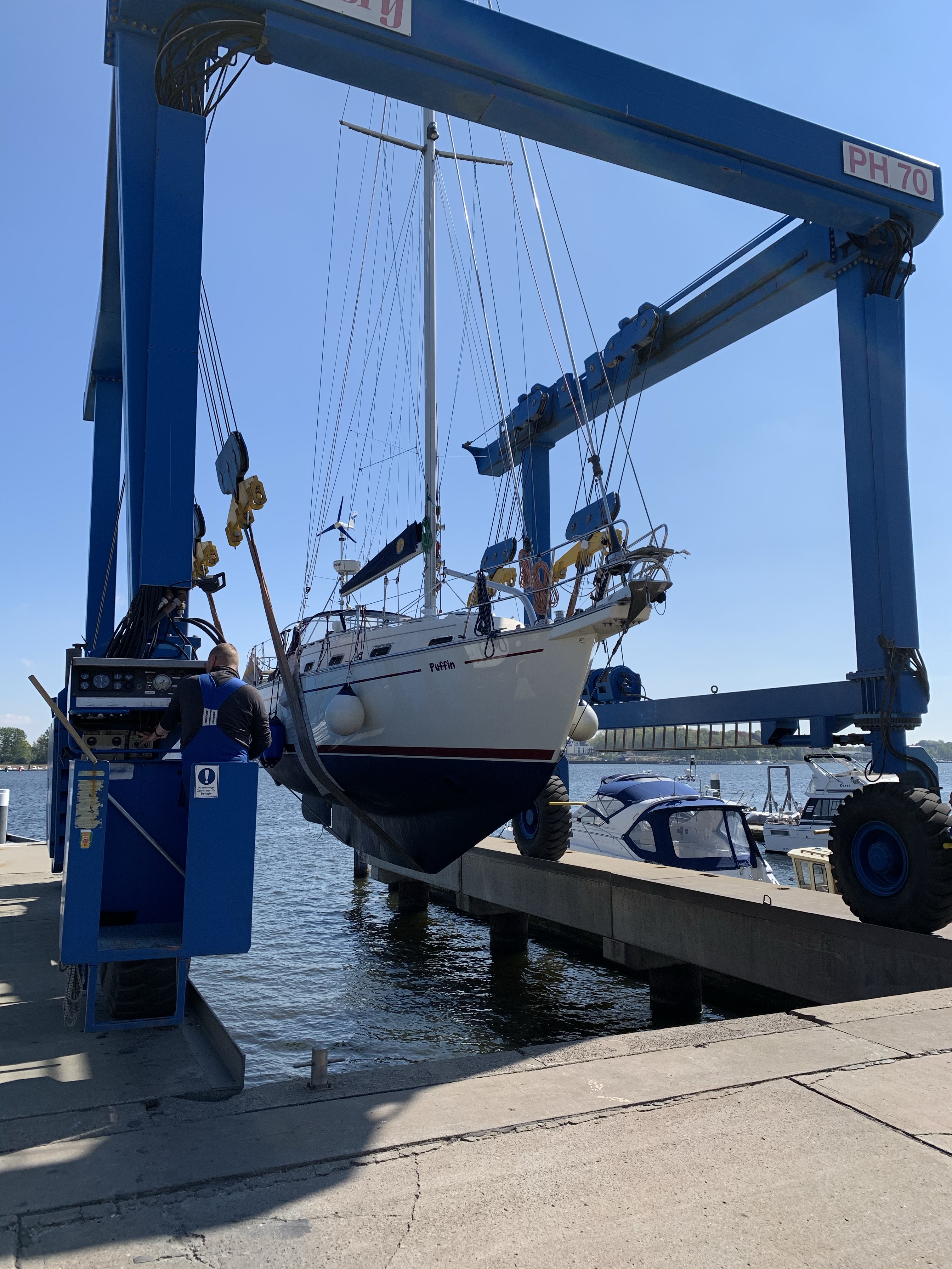 Am Freitag fuhr ich mit meinem Freund Christoph mit der Bahn zum Winterlager nach Rostock. Vermummt mit Mundschutz erreichten wir kurz nach Acht das Schiff. Auf dem Weg kauften wir noch Lebensmittel und Flüssignahrung für die Überführung ein und schleppten alles an Bord. Um halb Elf schwebte die Puffin dann unter dem Kran in die Warnow.