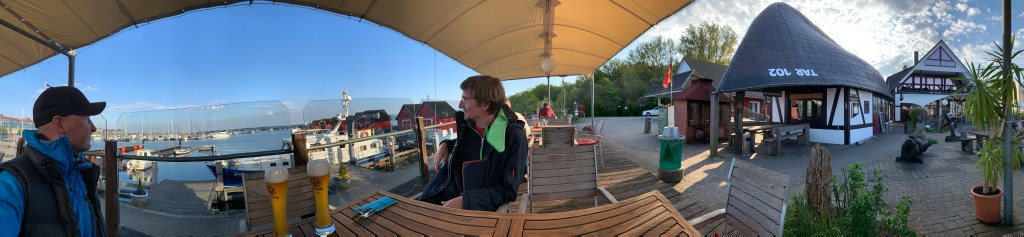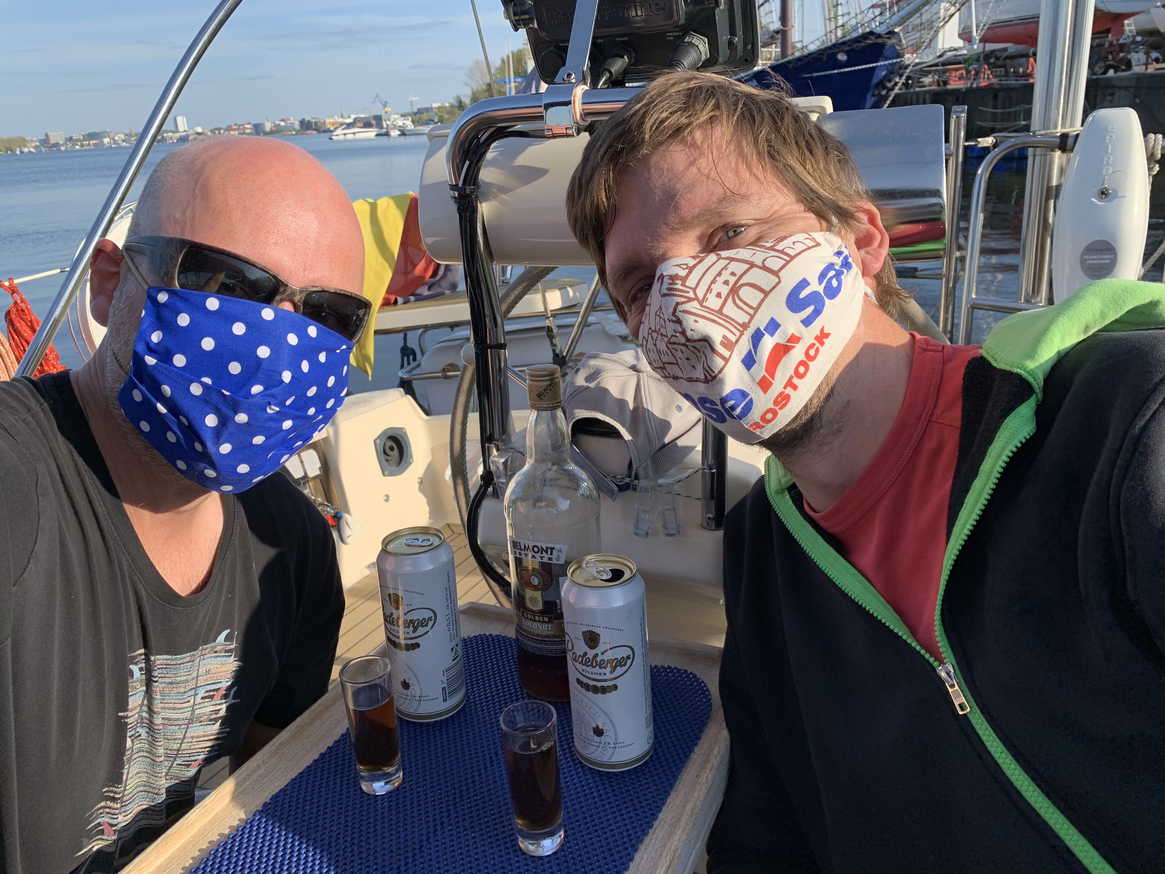 Auf Höhe Kühlungsborn kam doch noch die Sonne raus und Schicht für Schicht schälten wir uns aus unserer Zwiebelpelle aus Fleece. Nur der Wind ließ weiter auf sich warten. Erst kurz vor dem Ziel kam langsam eine Brise aus Nordost auf. Einige Segel tauchten nun um uns herum auf. Für uns lohnte es nicht mehr. Um 15:30 liefen wir in der Weißen Wiek ein. Erstmal ein kühles Anlegebierchen. Vom Land her empfingen uns bekannte Bässe von Technohymnen der Neunziger. Mit viel Aufwand hatten sich auf dem Nachbarsteg DJs eine Bühne aufgebaut und ließen sich filmen. Es gab auch einen Livestream auf Facebook. Mit den fetten Bässen im Rücken ging der Bootsputz leichter von der Hand. Da im Zuge der Corona-Lockerungen gestern die Restaurants wieder öffnen durften, belohnten wir uns mit einem Fischgericht. Mit Blick über den Hafen genossen wir Scholle und Matjeshering. Anschließend lauschten wir noch dem DJ-Set mit Lichtershow und Nebelmaschine bis kurz nach Zehn dann die letzten Zugaben verhallten. Noch ein Absacker und dann rief auch die Koje.