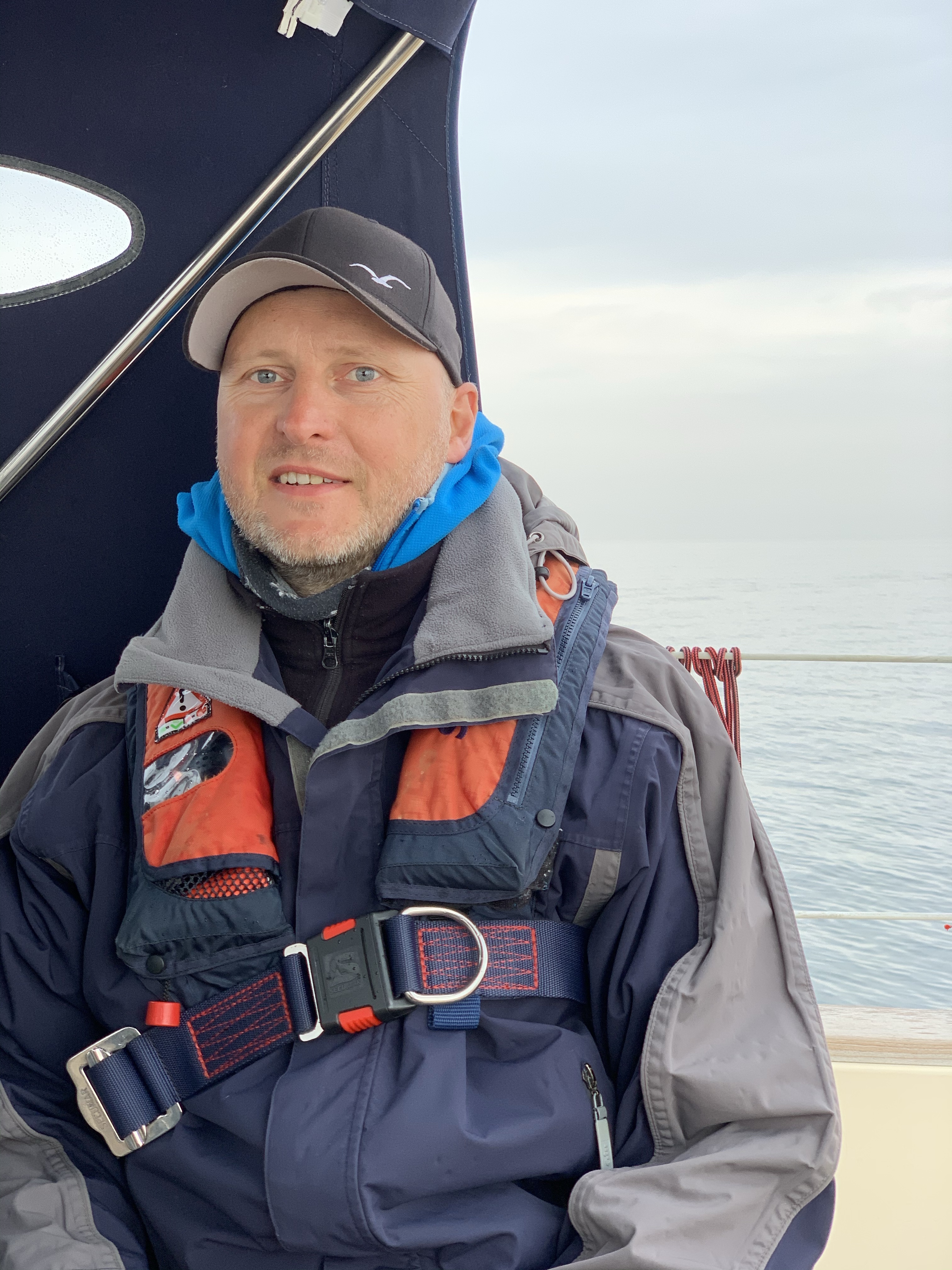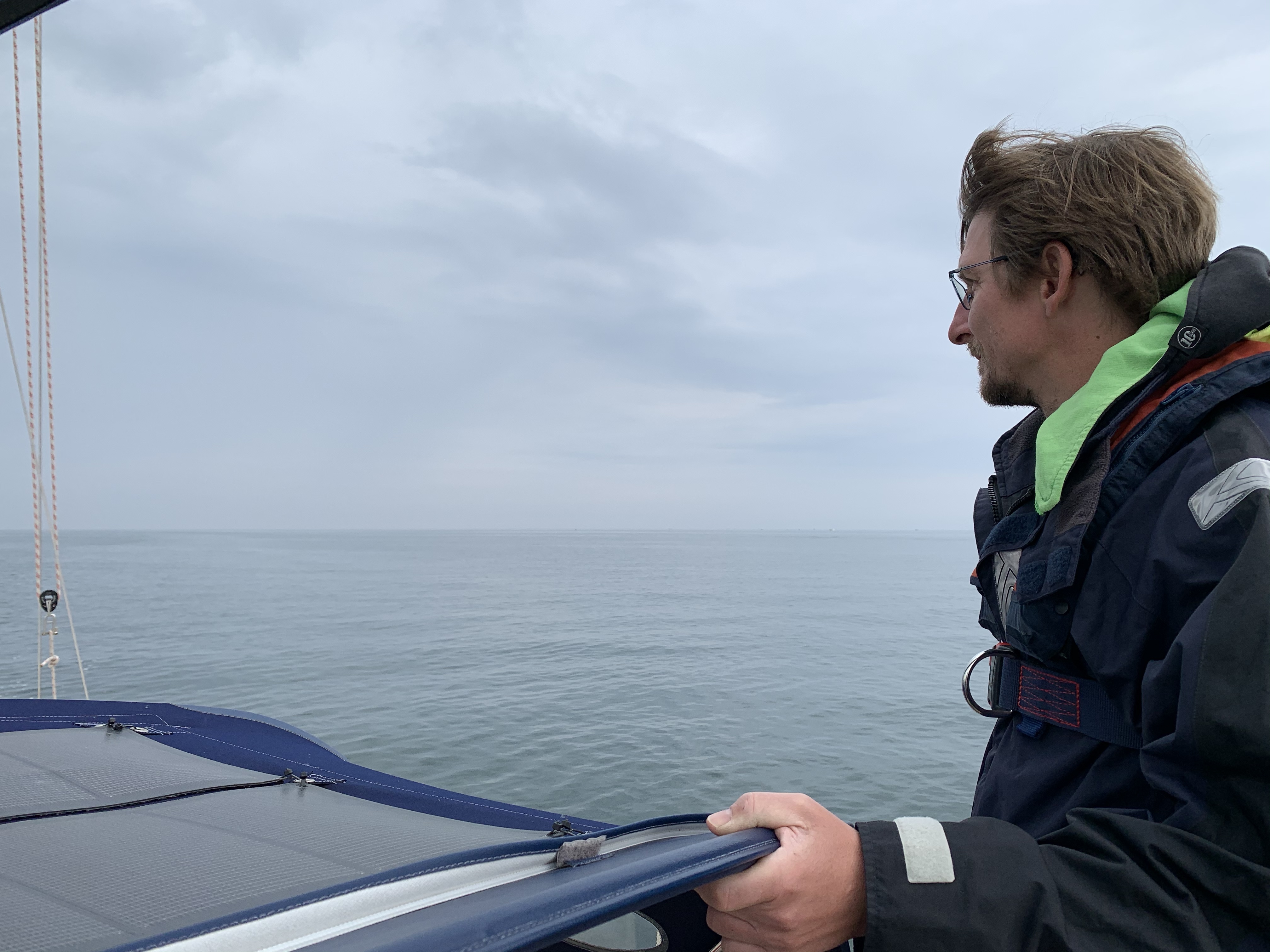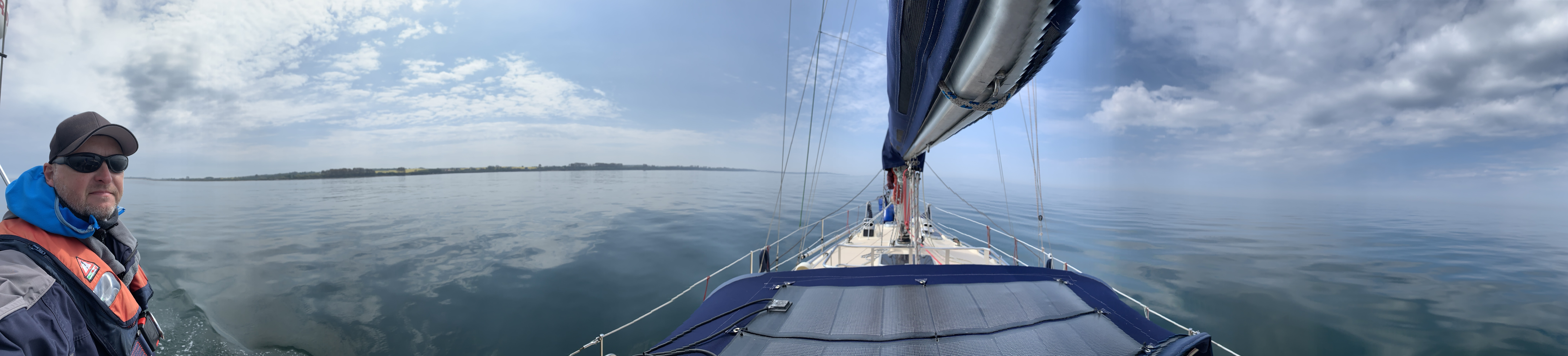 Gegen Abend saßen wir zufrieden beim Feierabendbierchen in der warmen Maisonne mit herrlichem Blick auf die Warnow. Nach der ersten Nacht an Bord und einer erfrischenden Dusche stärkten wir uns mit Kaffee und Toast für den Törn nach Boltenhagen. Ein milder Morgen und die Aussicht auf sonniges Segeln motivierten uns. Zunächst war es jedoch bedeckt und draußen vor Warnemünde erwartete uns neben glattem Wasser auch etwas Regen und sehr kühle Luft. Unzählige Angelboote spickten unseren Kurs entlang der Küste. Der Autopilot entlastete uns.