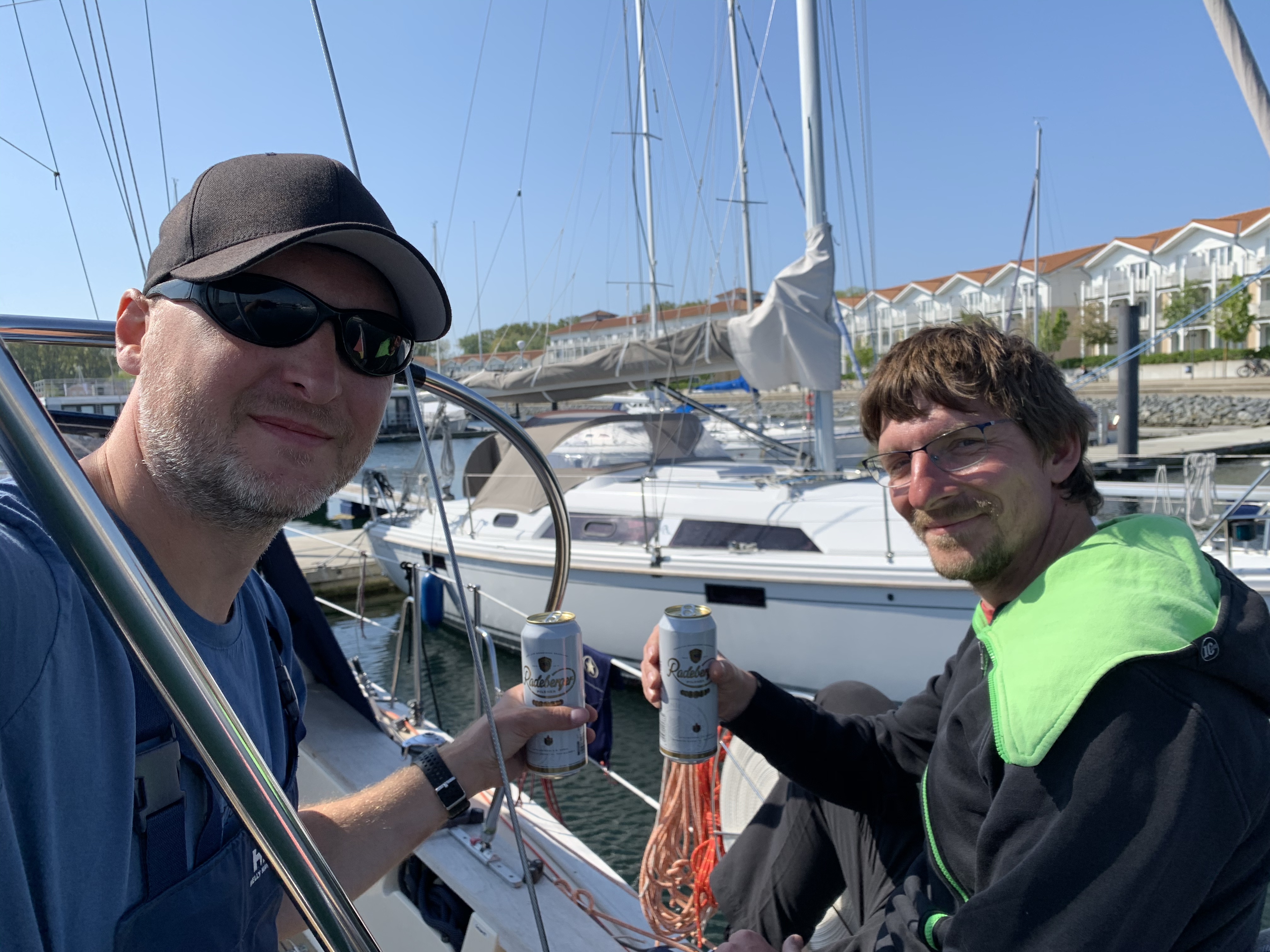 Zum Mittag stärkten wir uns mit frischen Fischbrötchen. Mittlerweile war Jeannette mit Luna und unserem Hund angekommen, um uns abzuholen. Vorher gingen wir noch zum Strand und Christoph und ich badeten spontan an bei 14 Grad Wassertemperatur. Ging ganz gut aber nicht lange. Nach Eisessen und Käffchen an Bord machten wir uns auf den Weg nach Hause. Zwar ohne gesegelt zu sein, aber dennoch mit dem ersten Törn im Logbuch.