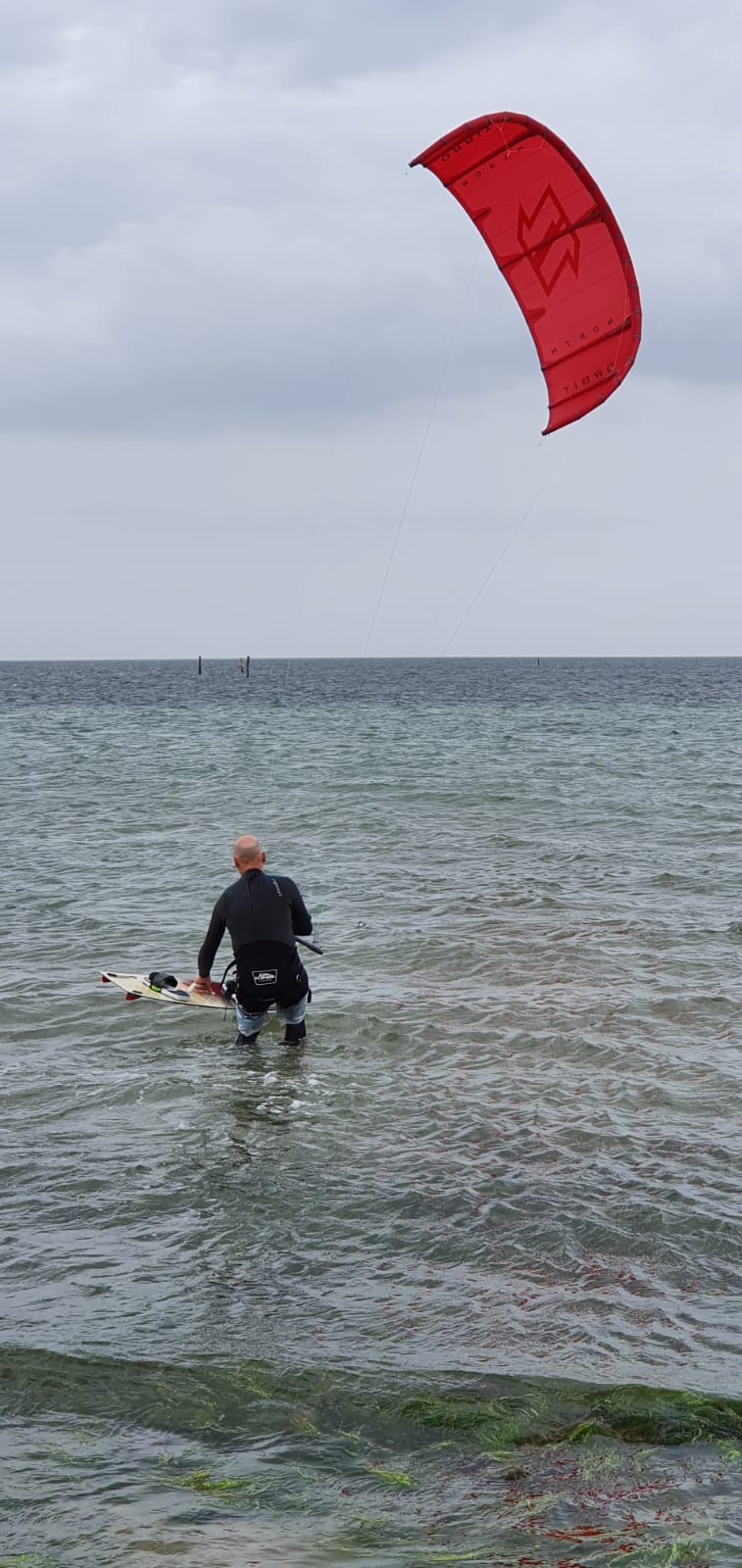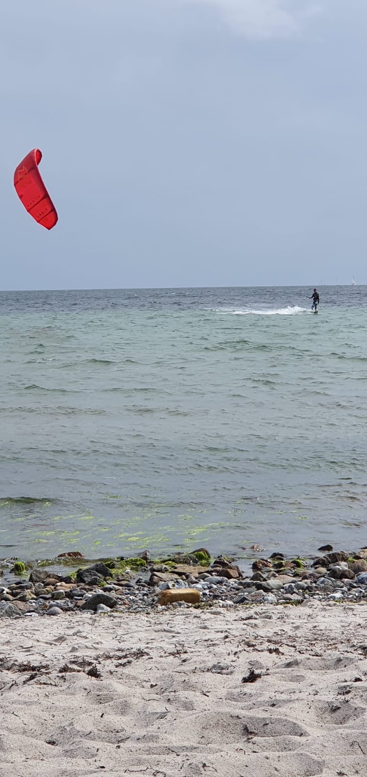 Gerade rechtzeitig vor einem kräftigen Regenschauer sind wir zurück gewesen. Das Grillen ließen wir uns dadurch nicht vermiesen. Morgen war auch noch ein Tag. Der war zum Glück so gut wie regenfrei. Mit dem Handwagen voller Surfgepäck schoben wir zum Ende des Südstrandes. Der ausgewiesene Kitespot war aber noch weitere 3 Kilometer entfernt. Wir nahmen den Weg auf uns und wurden enttäuscht. Überall Buhnen und Steine. Also gingen wir die 3 Kilometer zurück, nachdem wir ein Frustbier getrunken hatten. Zurück am Ausgangspunkt war nun ausreichend Wind und wir konnten uns doch noch unter den Schirm hängen. Hat Spaß gemacht, mal wieder zu kiten.