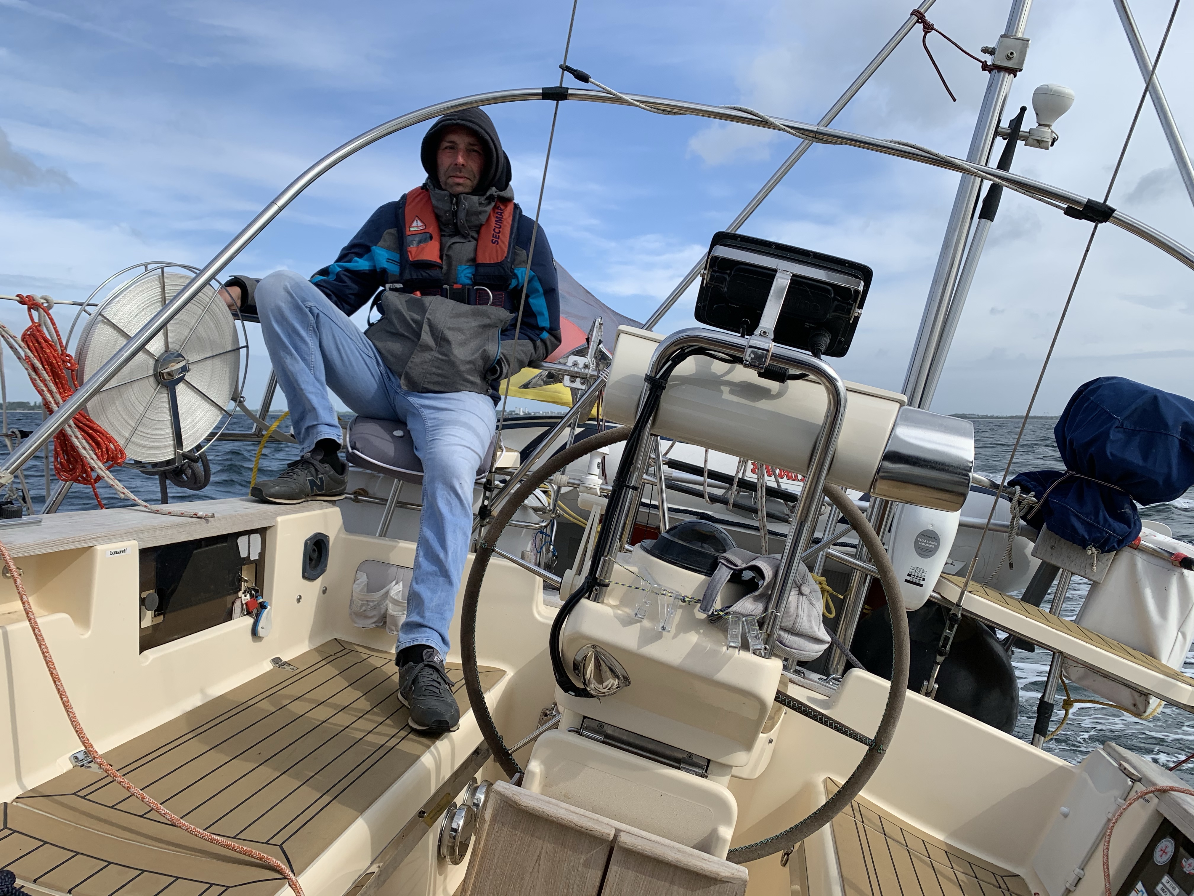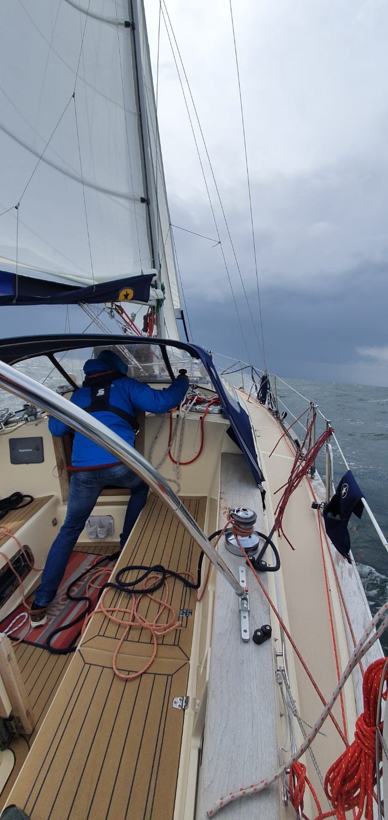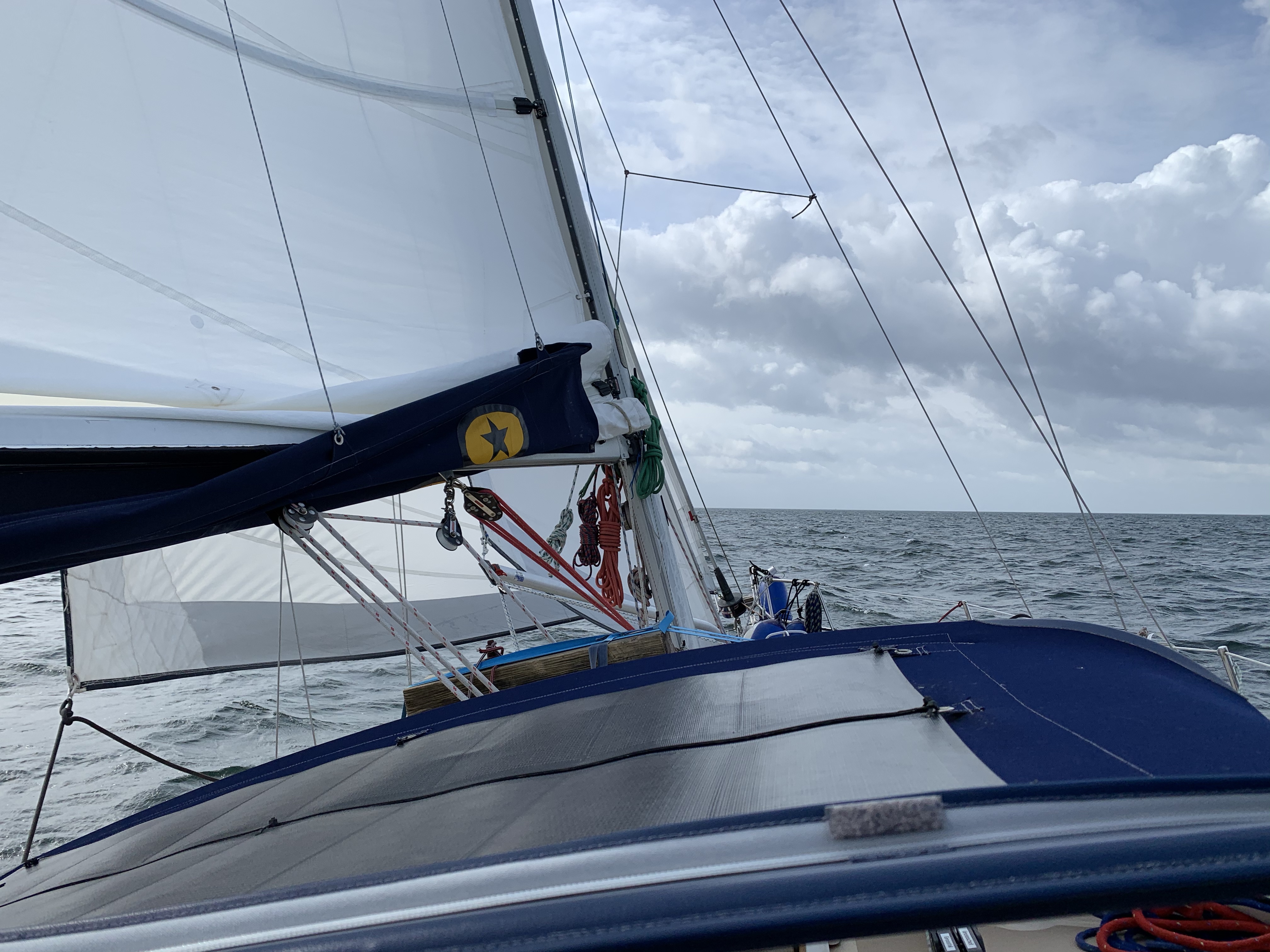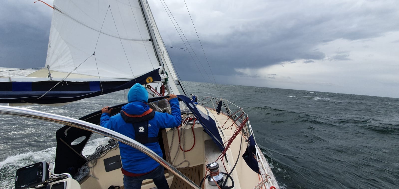 Heute sind wir nun zurück nach Boltenhagen gesegelt. Um 9 Uhr ging es los. Bei 6-7 Windstärken setzten wir das Großsegel im zweiten Reff. Am Ausgang des Binnensees erwischten uns gleich Böen bis über 40 Knoten. Mit Kutterfock und deutlich verkleinerter Genua kamen wir bis auf 8,5 Knoten Speed. Hoch am Wind konnten wir direkten Kurs absetzen und rauschten dahin.