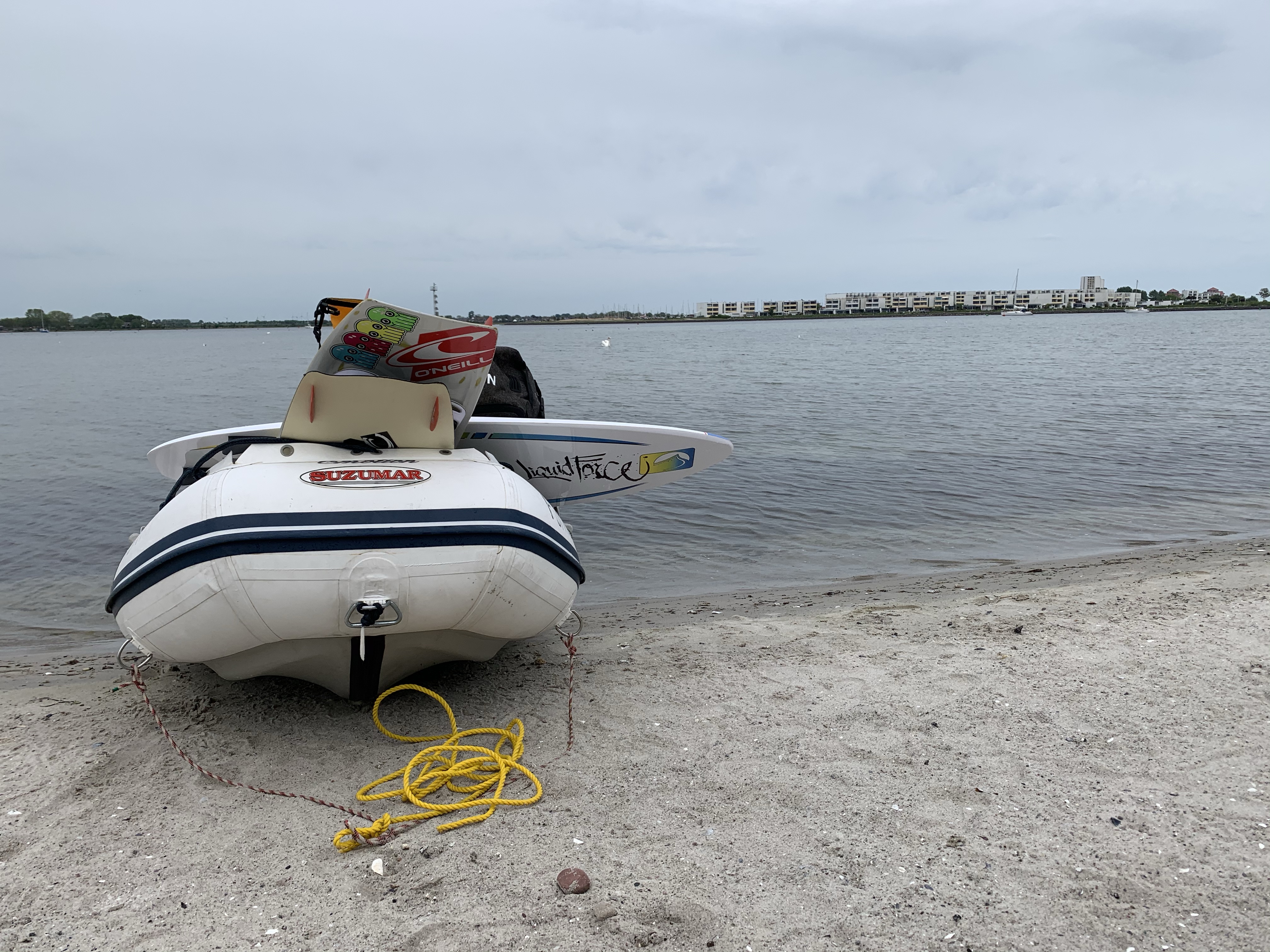 Am Freitag durchstöberten wir vormittags die Surfshops in Burg. Nachmittags wollten wir selbst aufs Wasser. Mit Neoprenanzug und Surfausrüstung fuhren wir rüber zum Kitespot Wulfen. Der versprochene Wind stellt sich nicht ein und so bleibt als Erfolgserlebnis nur ein Strandgut-Fund. Der Rest eines großen Pfahles könnte ein zweites Leben als maritime Deko erhalten. Also schleppen wir das schwere Teil mit dem Schlauchboot ganz langsam zurück zum Schiff.