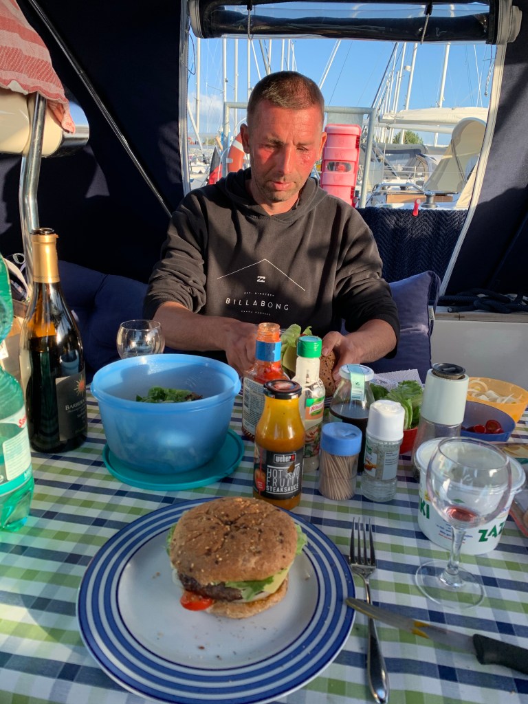 Zurück an Bord stärkten wir uns mit selbstgemachten Burgern. Dabei hatten wir Logenplätze für den Sonnenuntergang und ein paar Kiter auf dem Binnensee.