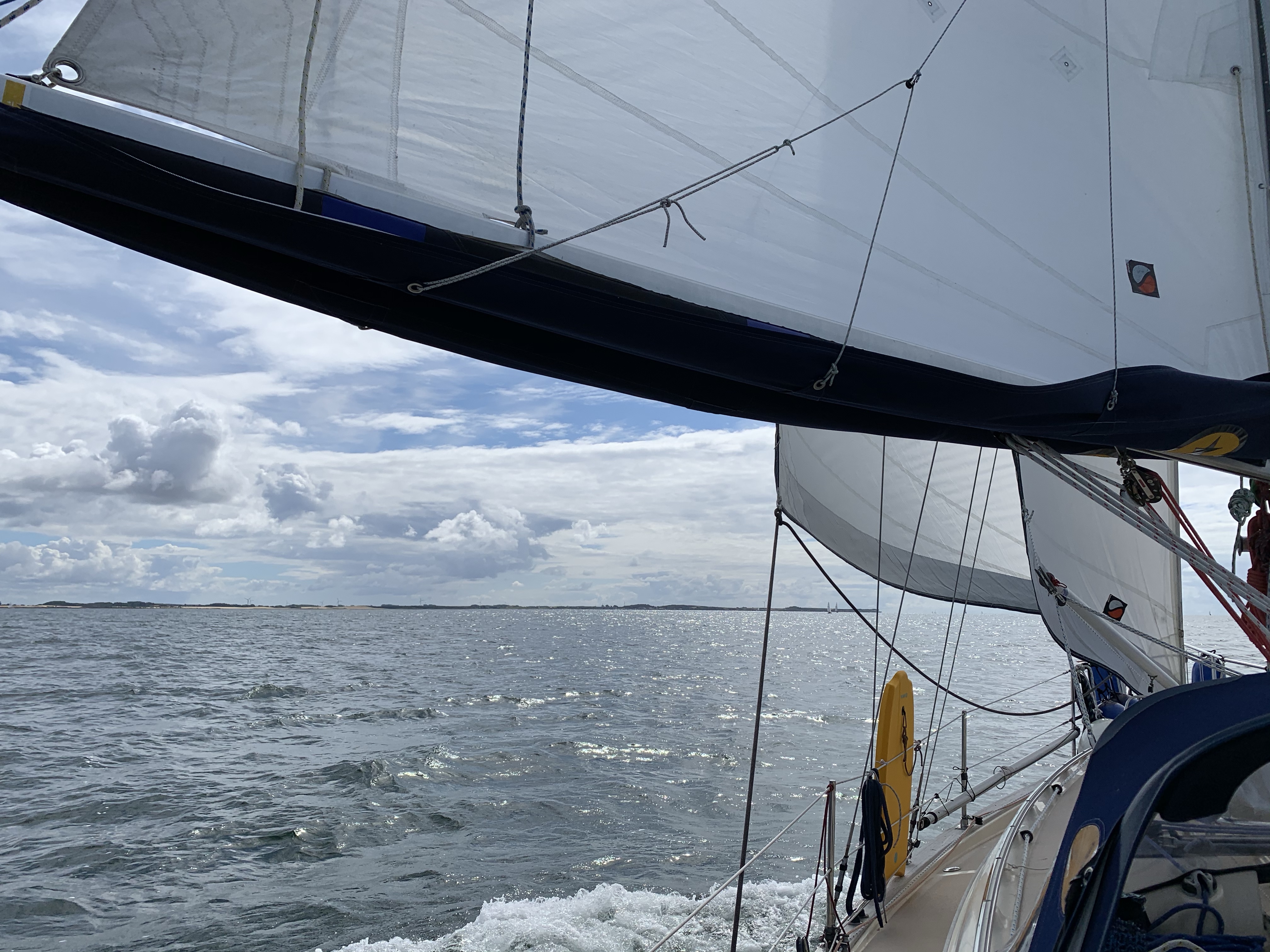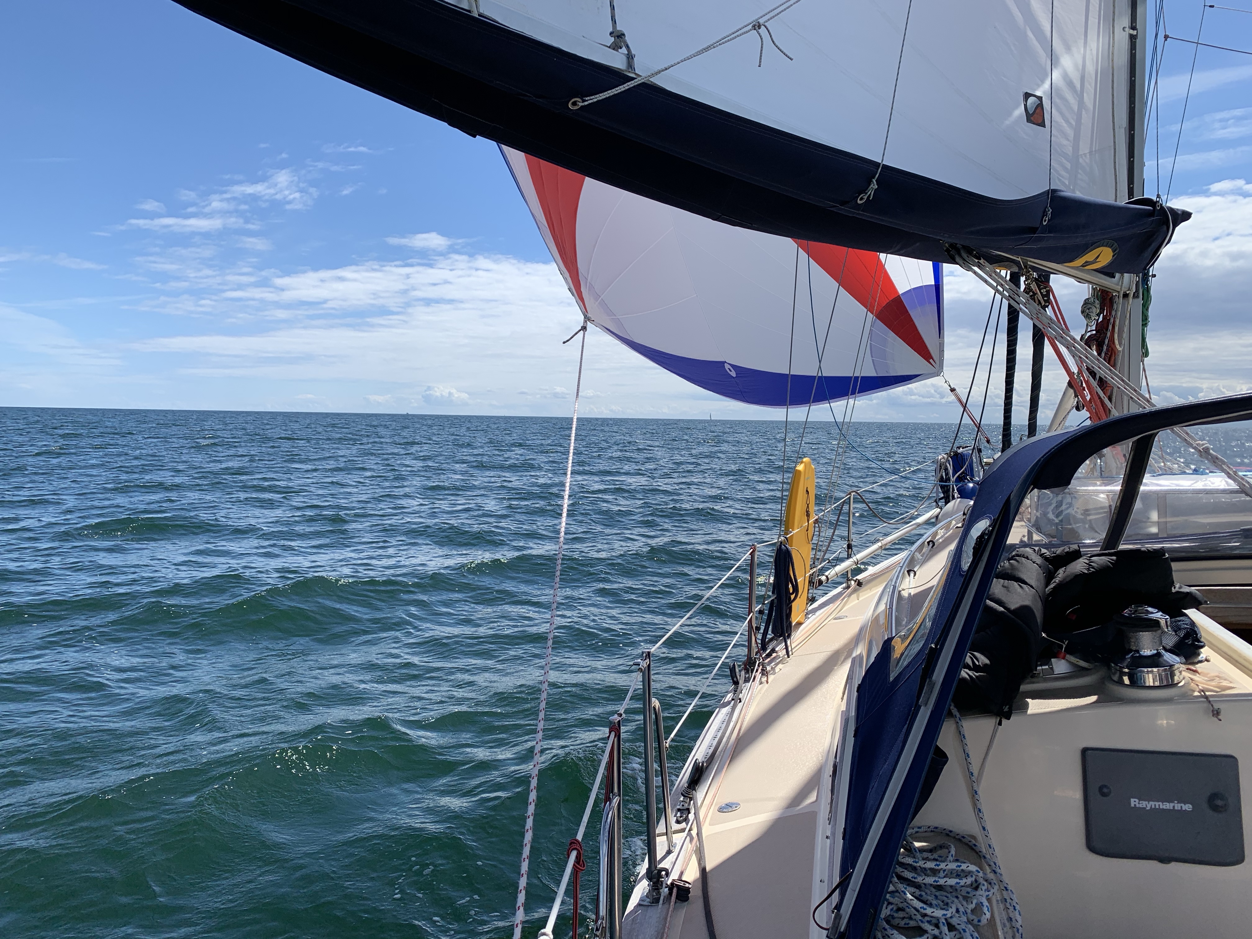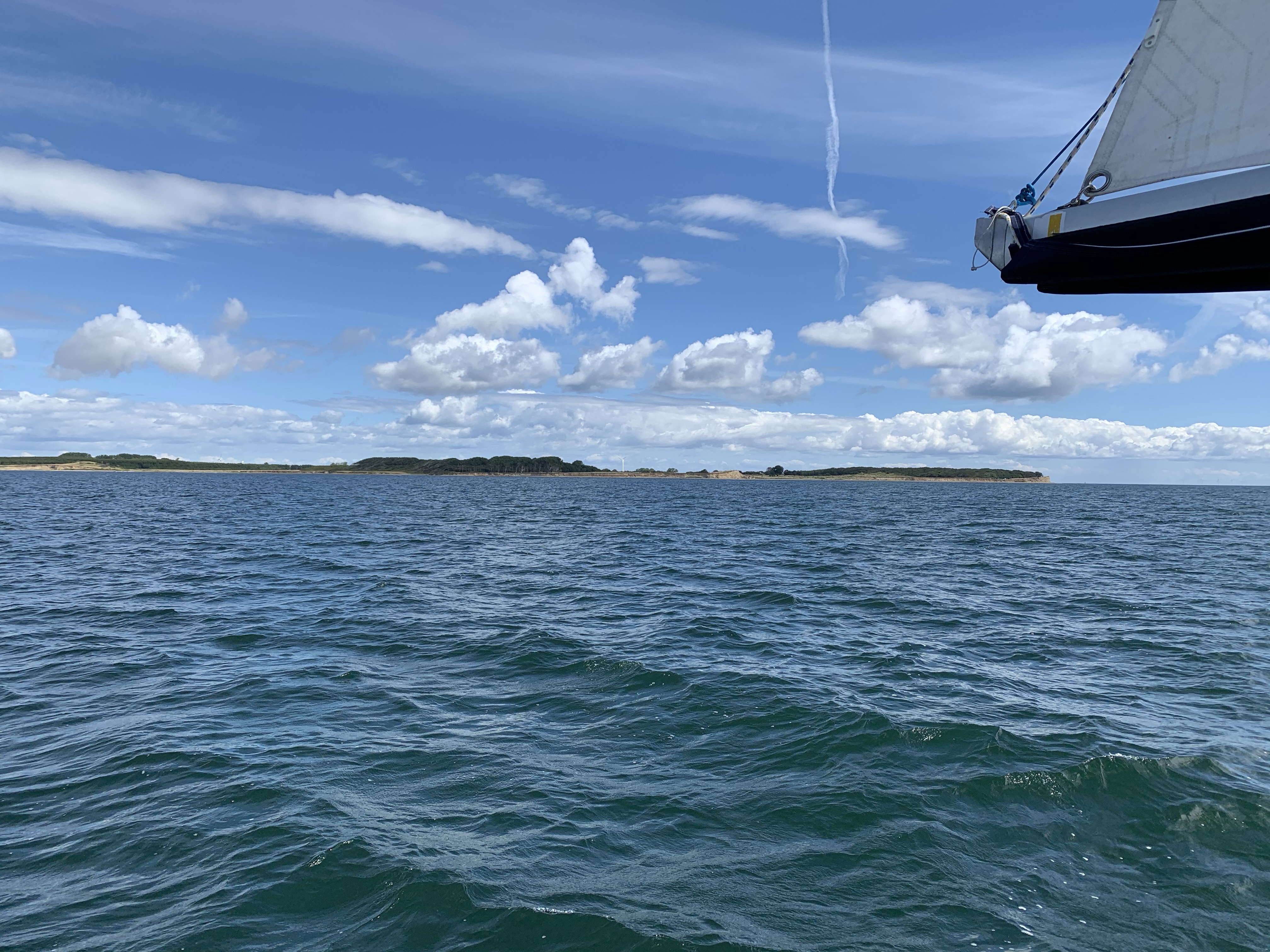 Gestern haben wir Dänemark verlassen und wieder Kurs auf Deutschland genommen. Von Marstal bis nach Burgtiefe auf Fehmarn sind es etwa 41 Seemeilen. Sollte also in acht Stunden zu schaffen sein. Leider hatte sich die Windprognose verschlechtert. Wir bekamen es mit leichterem, achterlichen Wind aus Nordwest zu tun. Auf Halbwindkurs reichten die 3 Windstärken zum Glück für 4-6 Knoten Fahrt aus.