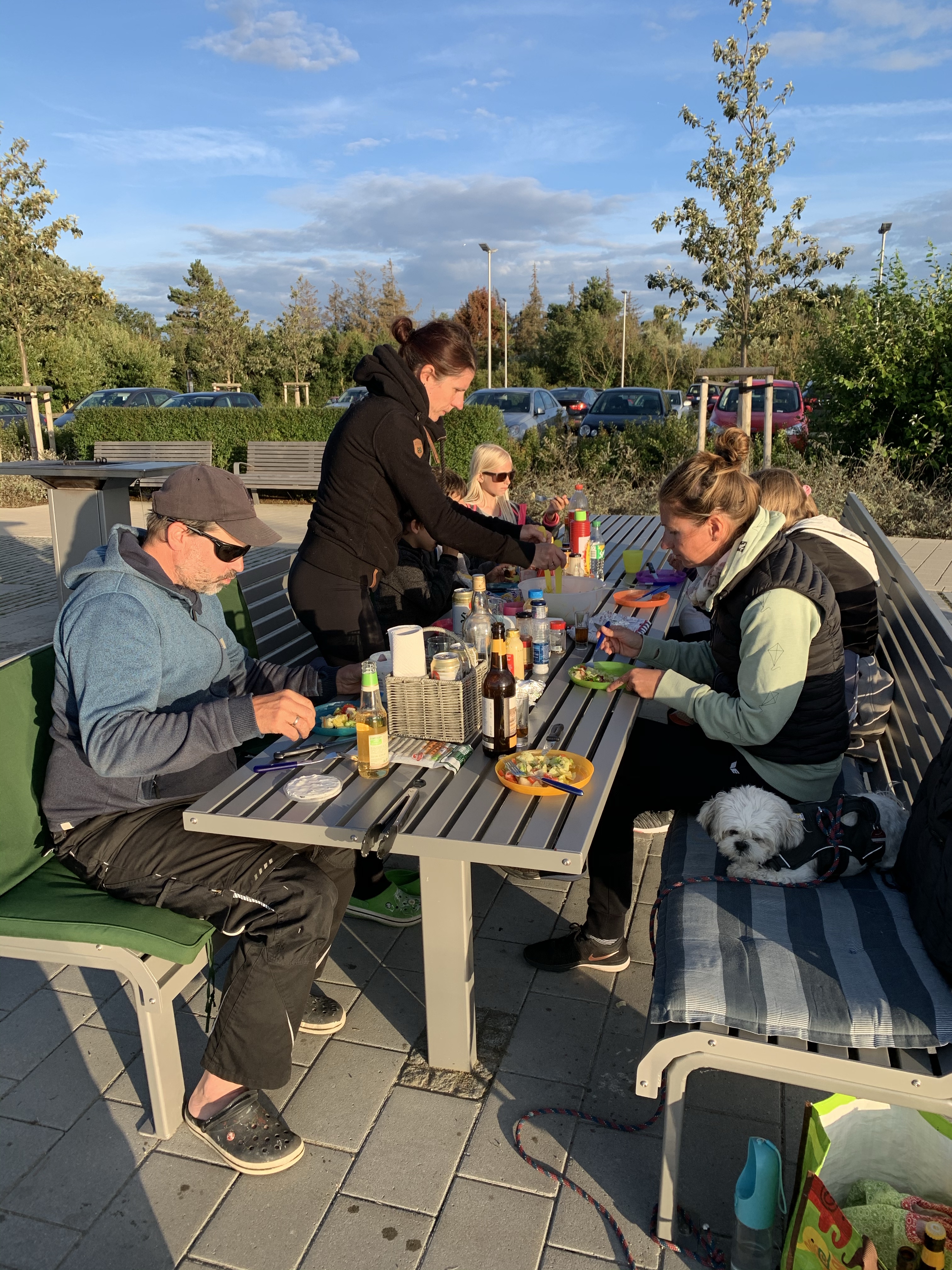 Zumindest konnten wir bis zum Eingang des Fehmarnsundes mit 4-5 Knoten weiterhin segeln. Erst dann musste der Motor mitschieben bis durch die Brücke und in den Hafen. Alles in allem ist es ein schöner Segeltag mit Sonne und wenig Welle gewesen. Nach acht Stunden passierten wir um 18 Uhr die Hafeneinfahrt. Die Yuendumu wartete schon auf uns. Gemeinsam ließen wir den Tag am Grillplatz in der Abendsonne ausklingen. Morgen gehts dann rüber in den Heimathafen.