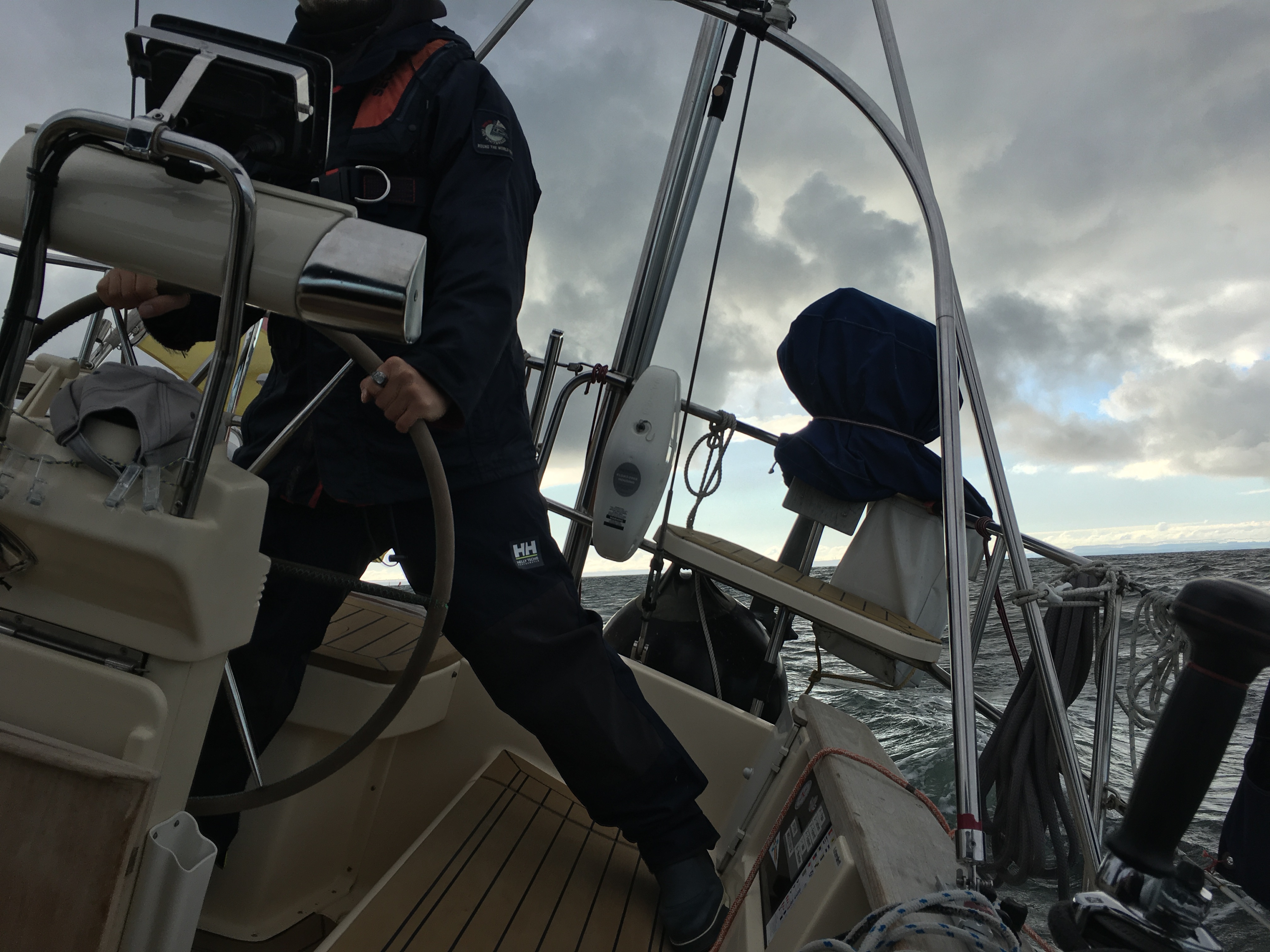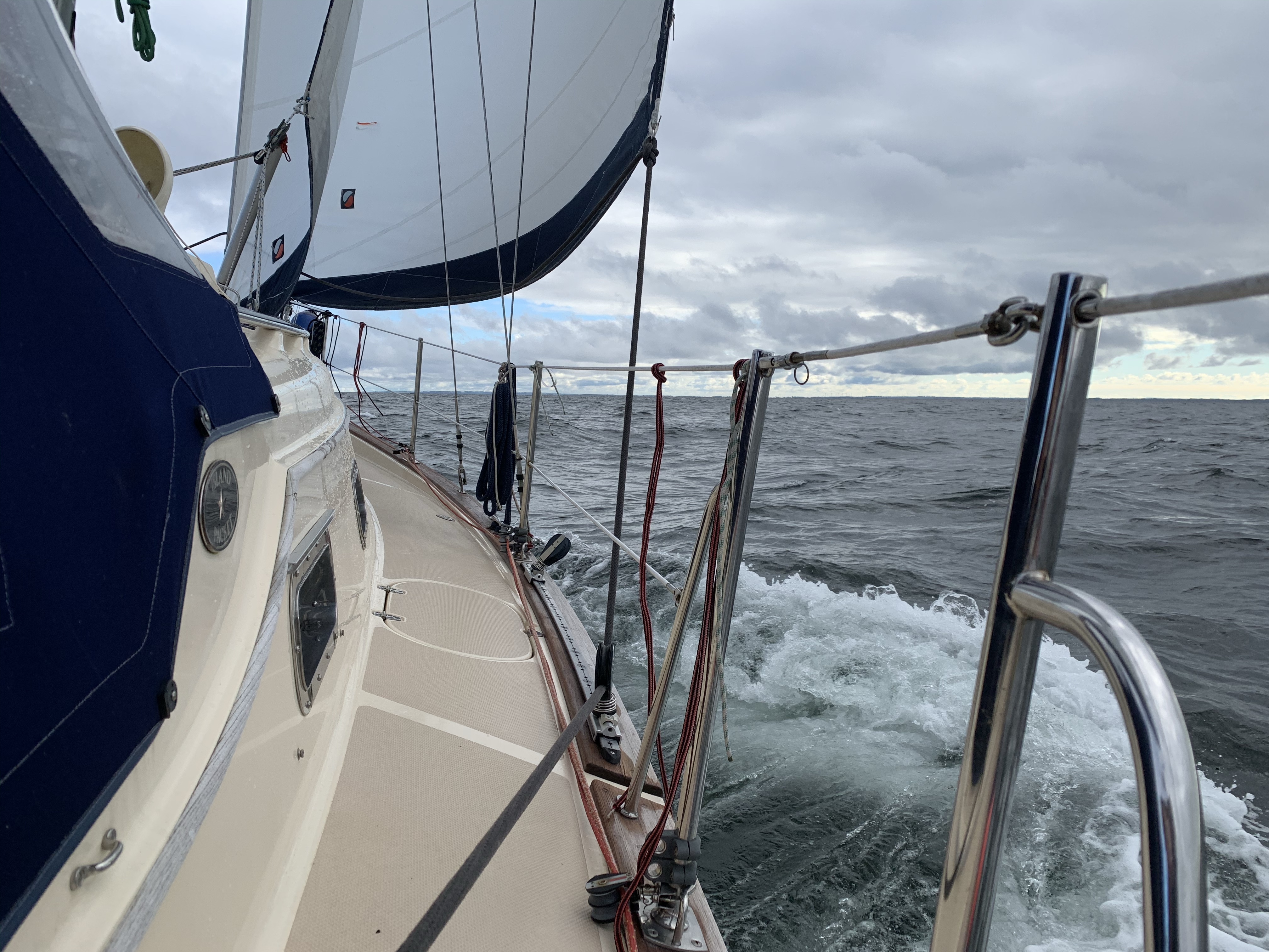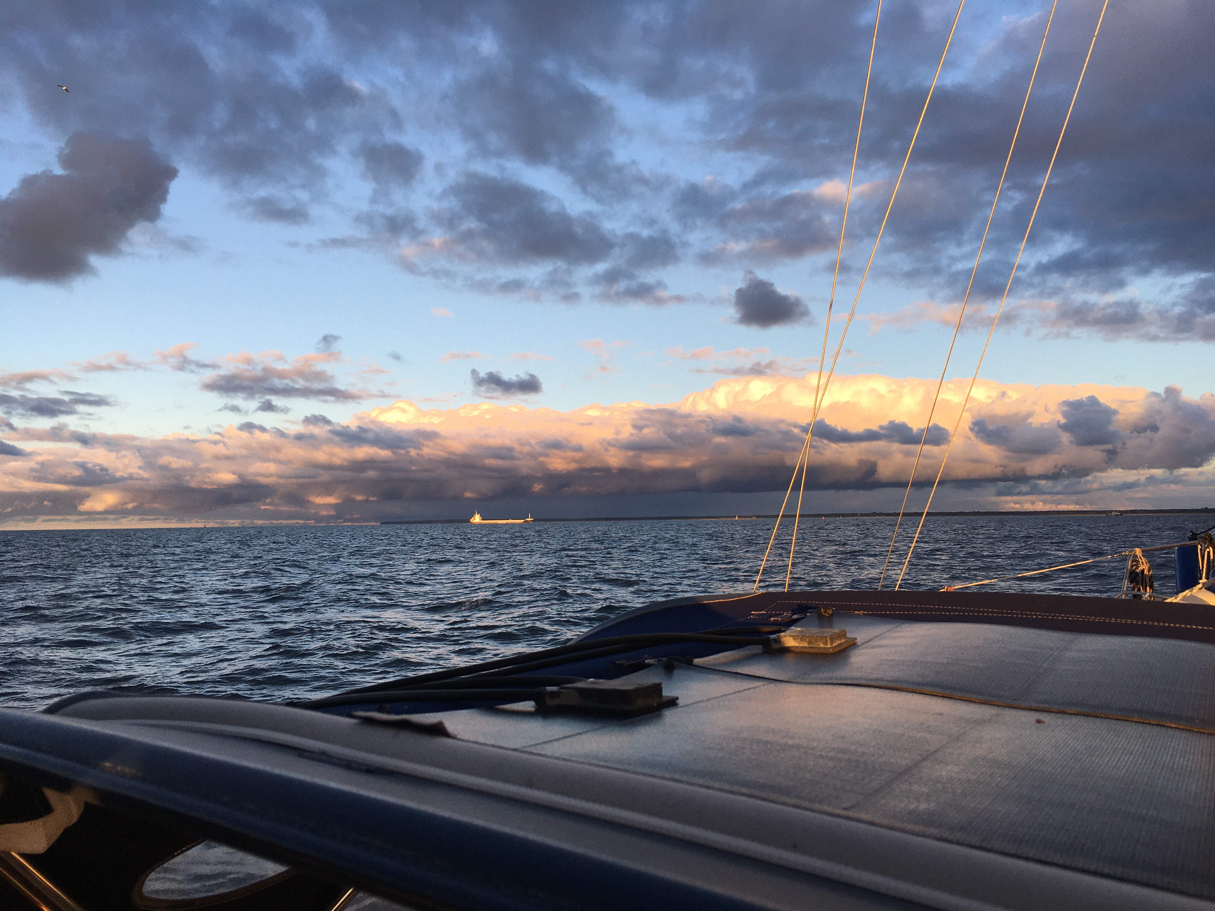 Der Regen ist nur noch am Festland zu sehen. Wir setzen alle Segel, gehen hoch an den Wind und machen mit Maschinenunterstützung gerade 5 Knoten. Grund ist die Dünung von 1-2 Meter, die uns zunächst noch genau entgegen schlägt. Dafür schwächelt der Wind. Auf Backbordbug können wir nur Kurs auf Fehmarn nehmen. Der Motor kann abgestellt werden. Nach dem Wenden kommen wir zumindest Kühlungsborn etwas näher. Landen an der Einfahrt zum Salzhaff.