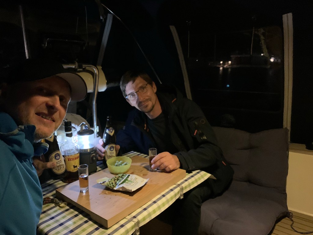 Am Freitagabend setzt Jeannette meinen Freund Christoph und mich am Hafen ab. Heizung an und Pizza in den Ofen. So ist es ganz gemütlich an Bord. Dazu gute Musik und kühles Bier.