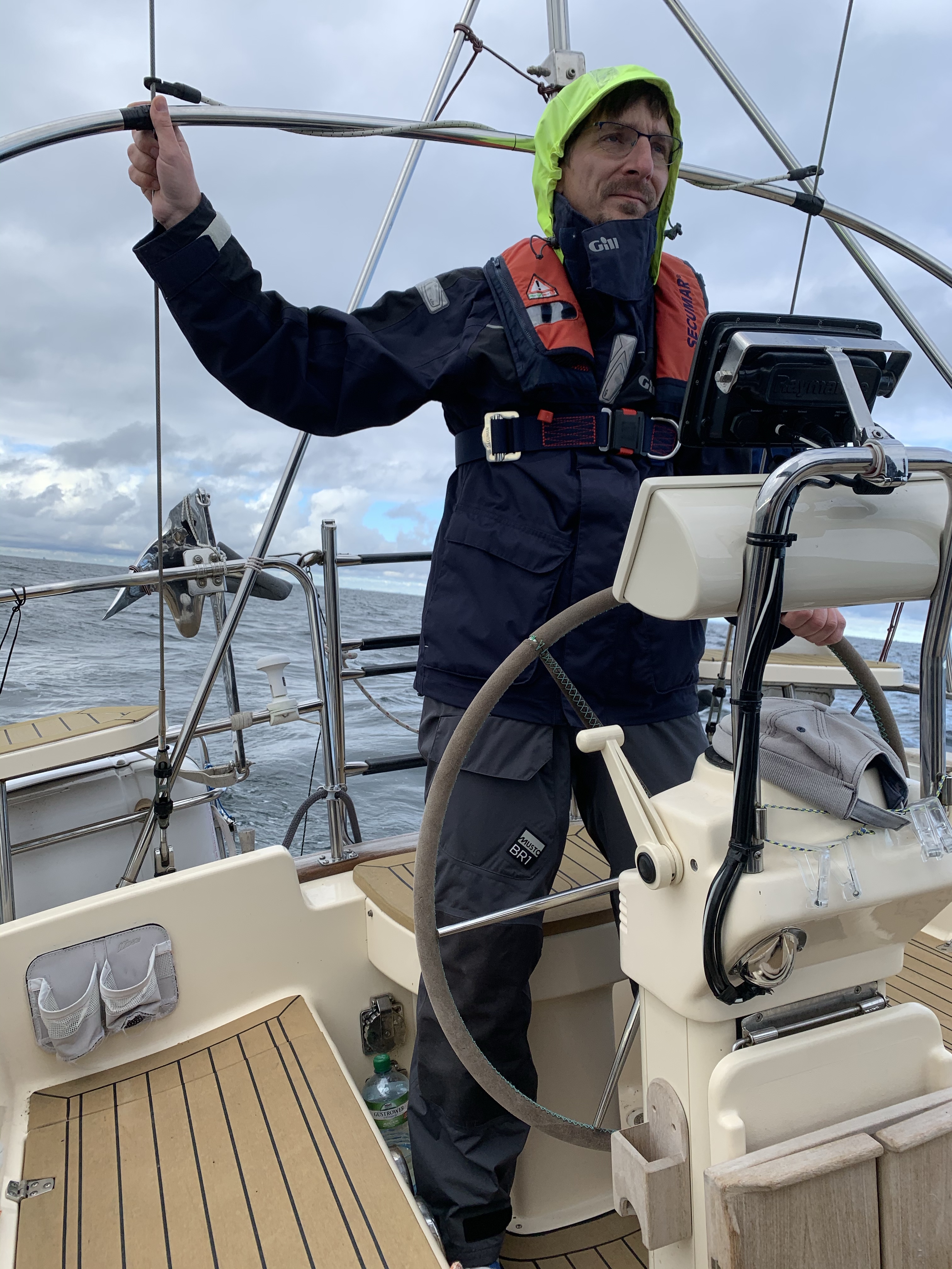 Samstag früh schüttet es noch kräftig und so haben wir es nicht ganz so eilig mit dem Ablegen. Um viertel nach Neun tuckern wir trocken raus auf die Ostsee. Etwas Schub fehlt dem Motor jedoch. Die Schraube hat sehr viele Untermieter aufgenommen, wird sich einige Tage später am Kran zeigen.