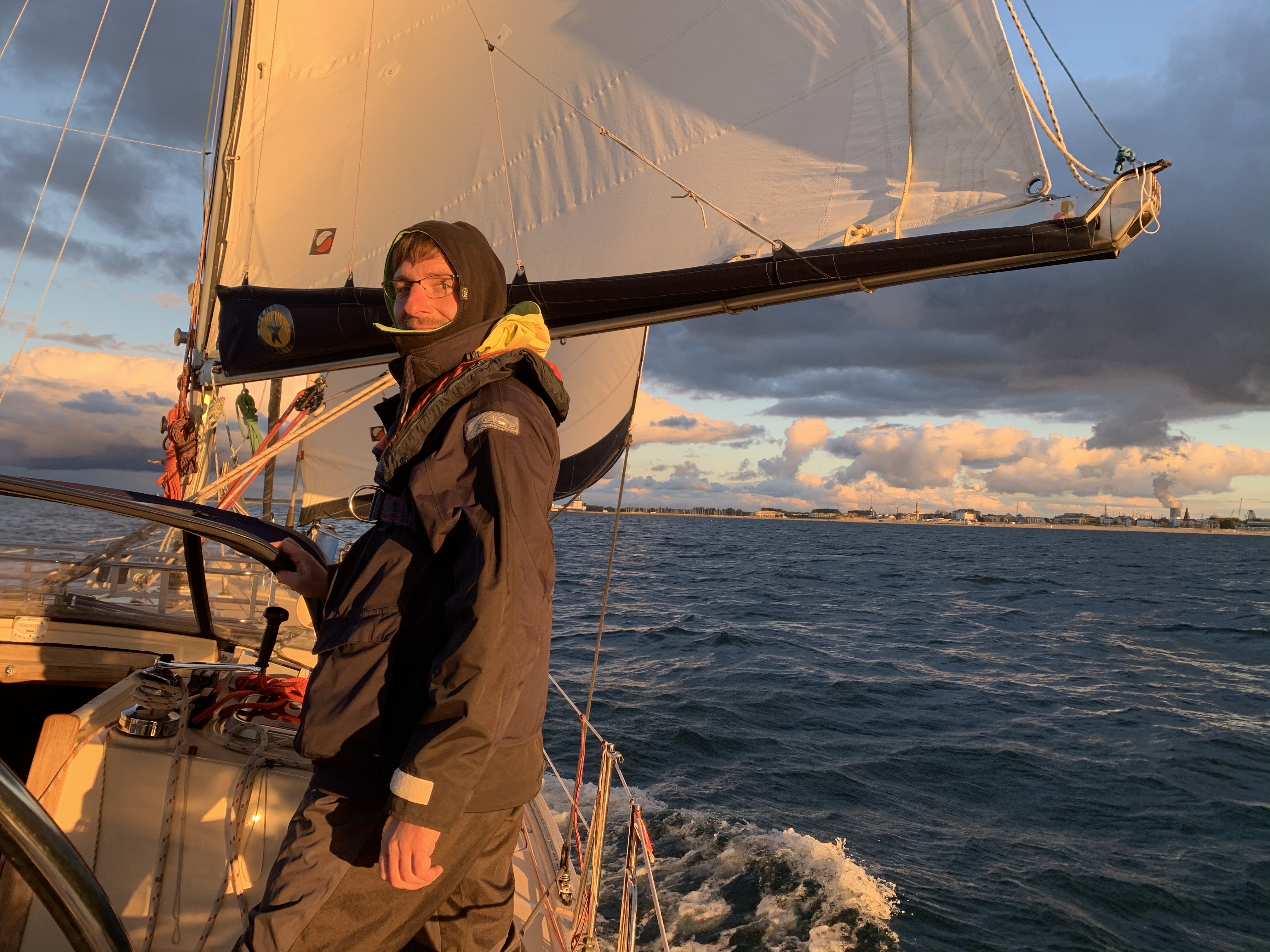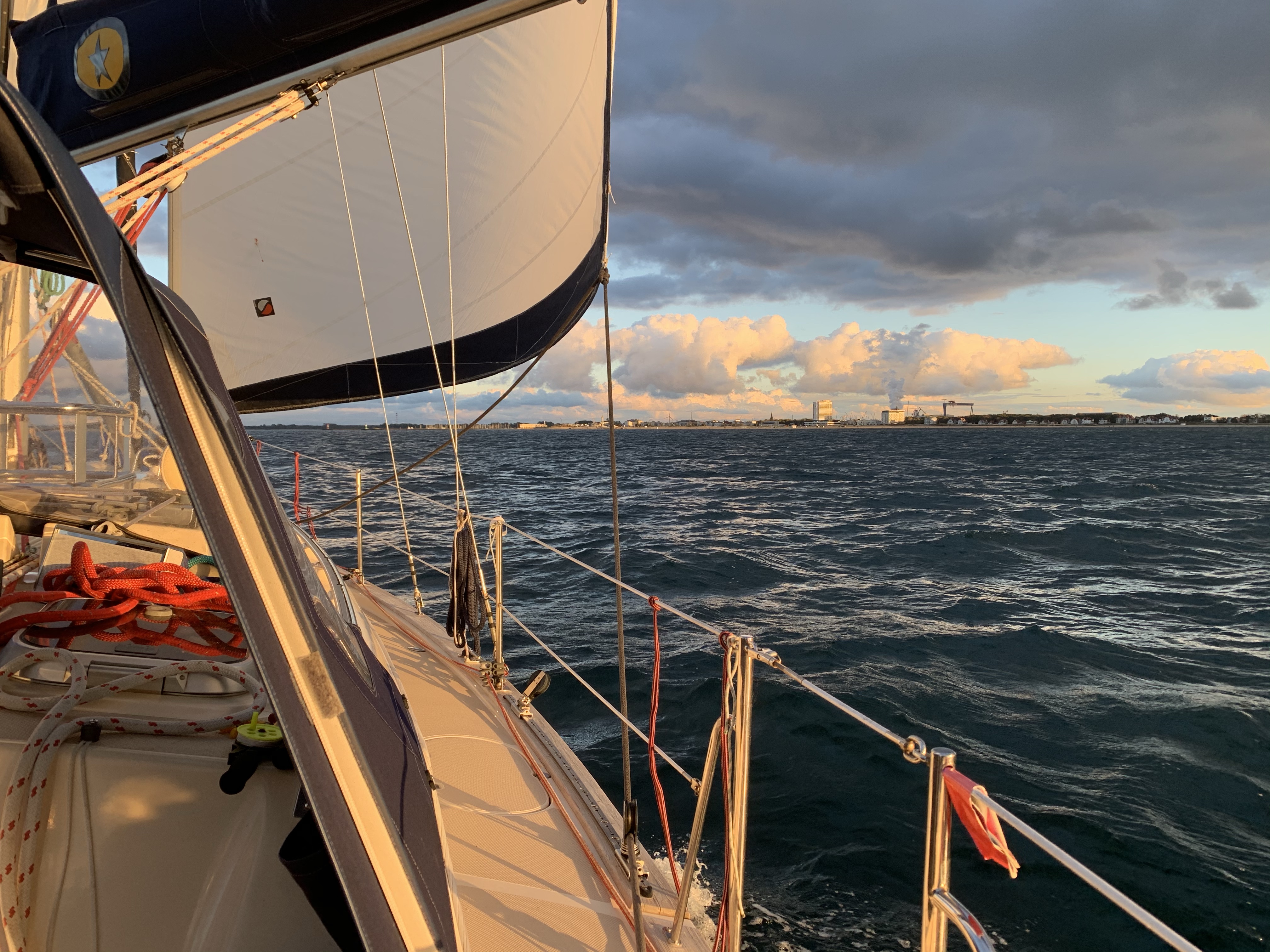 Der Wind nimmt ab und so dampfen wir erstmal direkt gegenan die Küste rauf bis kurz vor Kühlungsborn. Hier können wir abfallen auf Halbwindkurs und mit 4 Knoten gemächlich weitersegeln bis Warnemünde. Die Sonne blieb uns dabei treu und sorgte bei unserer Ankunft 18 Uhr für tolles Fotolicht.