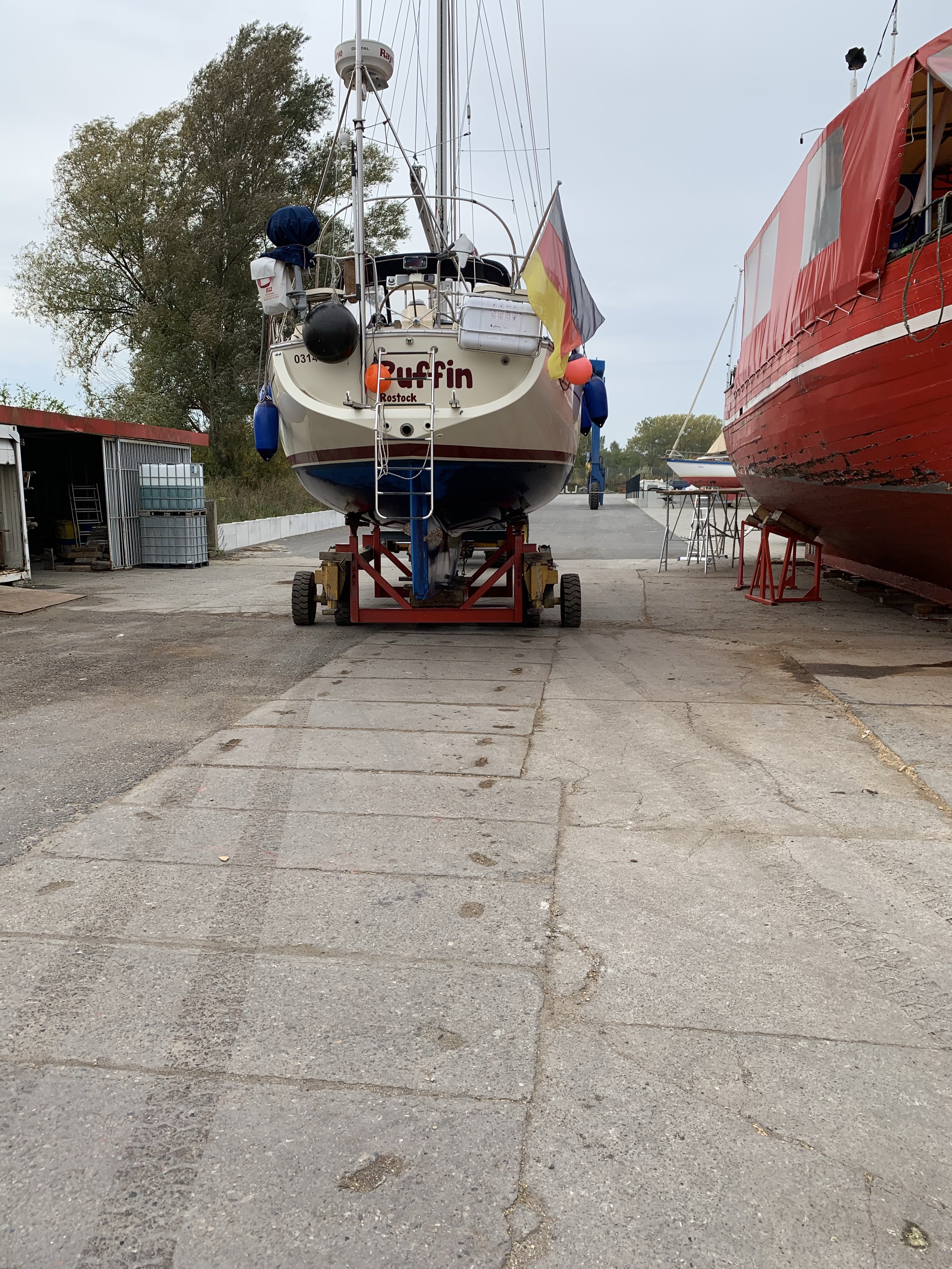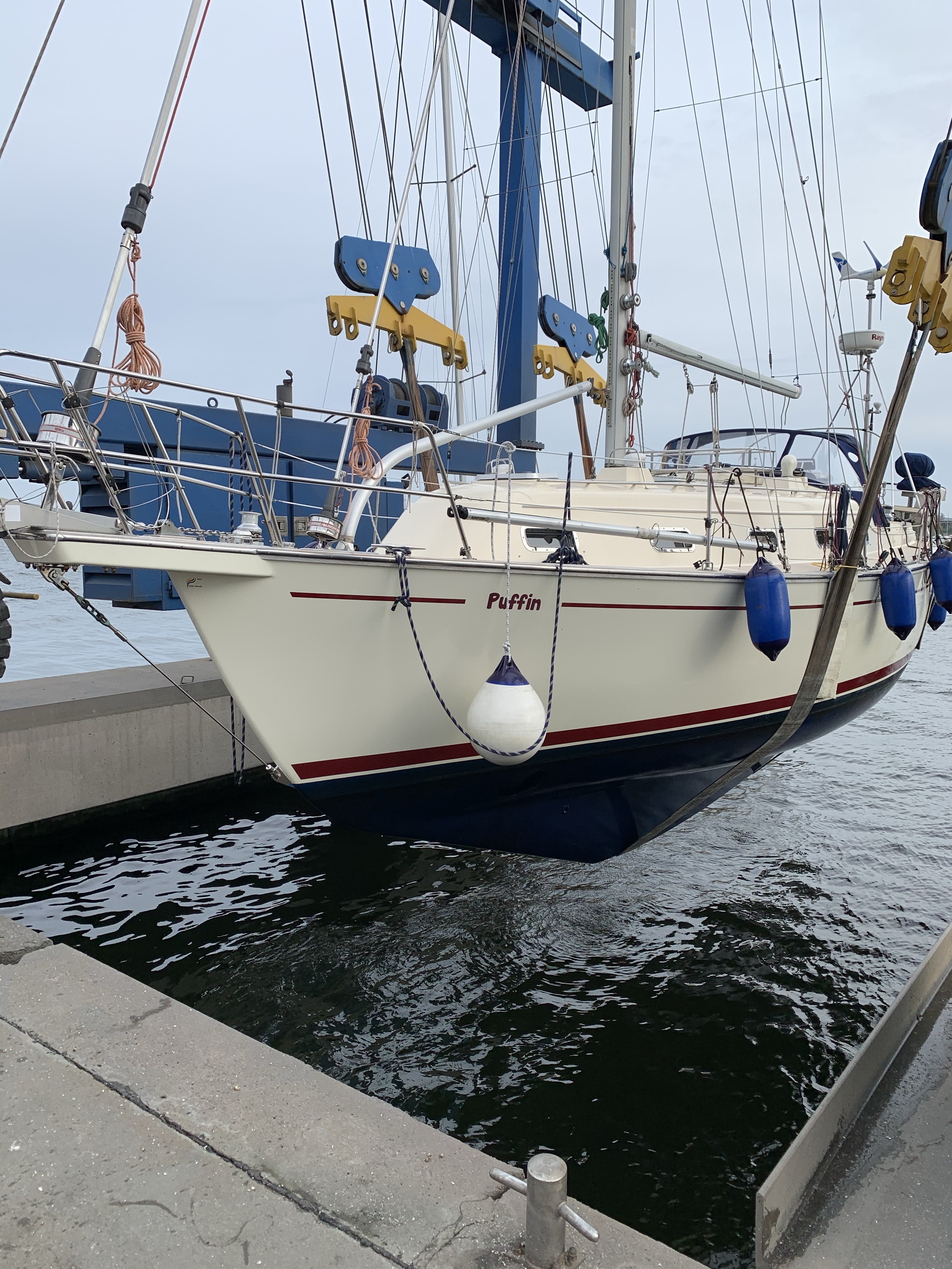 Den Sonntag und Montag nutzte ich schließlich zum Abbauen der Segel und Schoten. Auch der Wassertank und Boiler musste geleert werden. Viele Handgriffe später schwebte die Puffin dann am Dienstag um 10 Uhr unter dem Kran. Hier zeigte sich auch wie vermutet der starke Pockenbewuchs an der Schraube. Pockenfett taugt also nicht als Schutz.