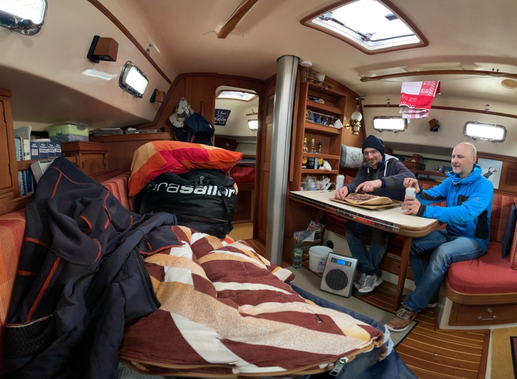 Ab dem Salzhaff verdeckte unser Riesensegel dann die Sonne und wir kamen ins Frösteln. Dafür kamen wir super voran und konnten komplett bis vor den Hafen der Marina Weiße Wiek segeln. Sieben Stunden haben wir gebraucht für die 40 Seemeilen. Kaum am Liegeplatz angekommen, bauten wir erstmal die Kuchenbude auf. Windschutz und Wärme weckten die Lebensgeister zusammen mit dem Anlegerbier. Abends hatten wir dann noch eine XXL-Pizza da. Die frische Luft hatte uns aber müde gekämpft und es ging recht früh in die Koje.