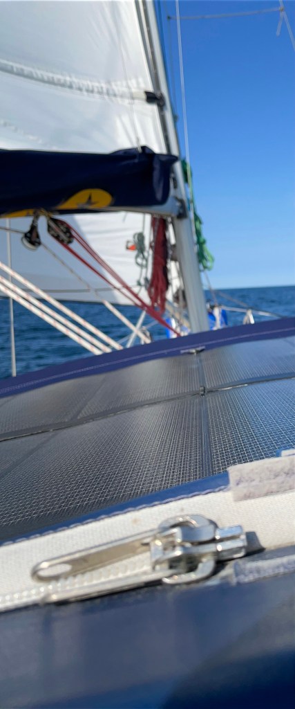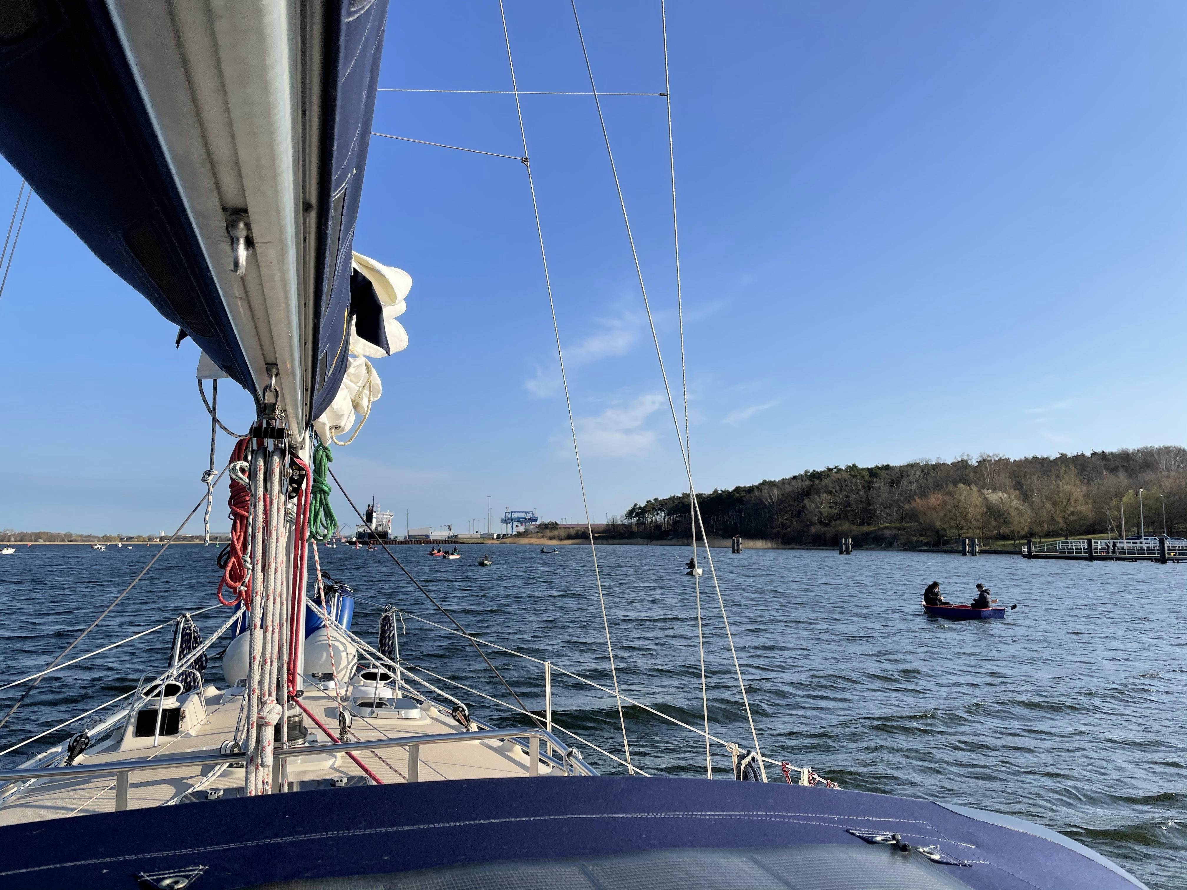 Blauer Himmel empfing und am Samstag früh morgens, als wir ins aus den Deckenschichten schälten. Mit unserem Heizlüfter war die Nacht aber erträglich. Nach dem Frühstück lösten wir um gegen halb Acht die Leinen. Von unzähligen Angelbötchen gesäumt, motorten wir bis zur Warnowmündung. Bei 20 Knoten aus Nordost setzten wir das Großsegel im ersten Reff und rollten die Genua aus.