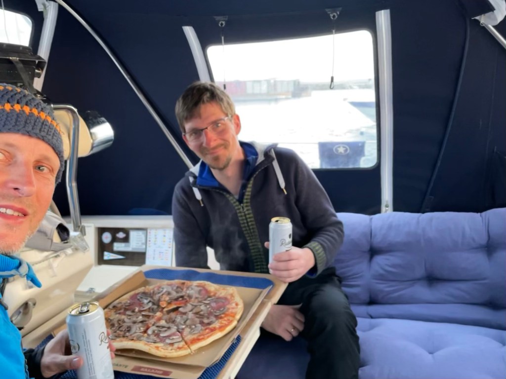 Den Freitag nutzten wir dann, um die Segel anzuschlagen und alles bereit zu machen für den Überführungstörn nach Boltenhagen. Zwischendurch besorgten wir im Lidl Proviant. Am Abend belohnten wir uns mit einer XXL-Pizza.