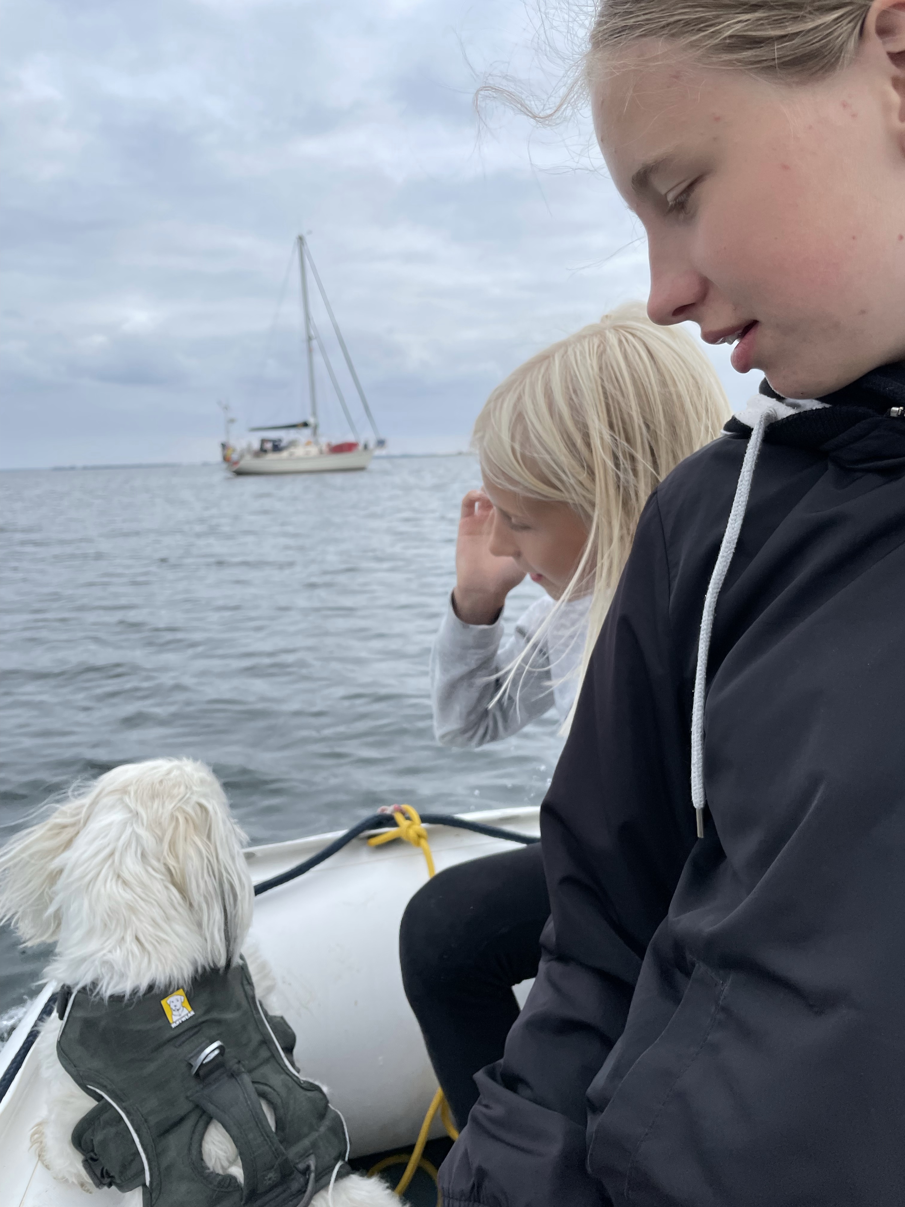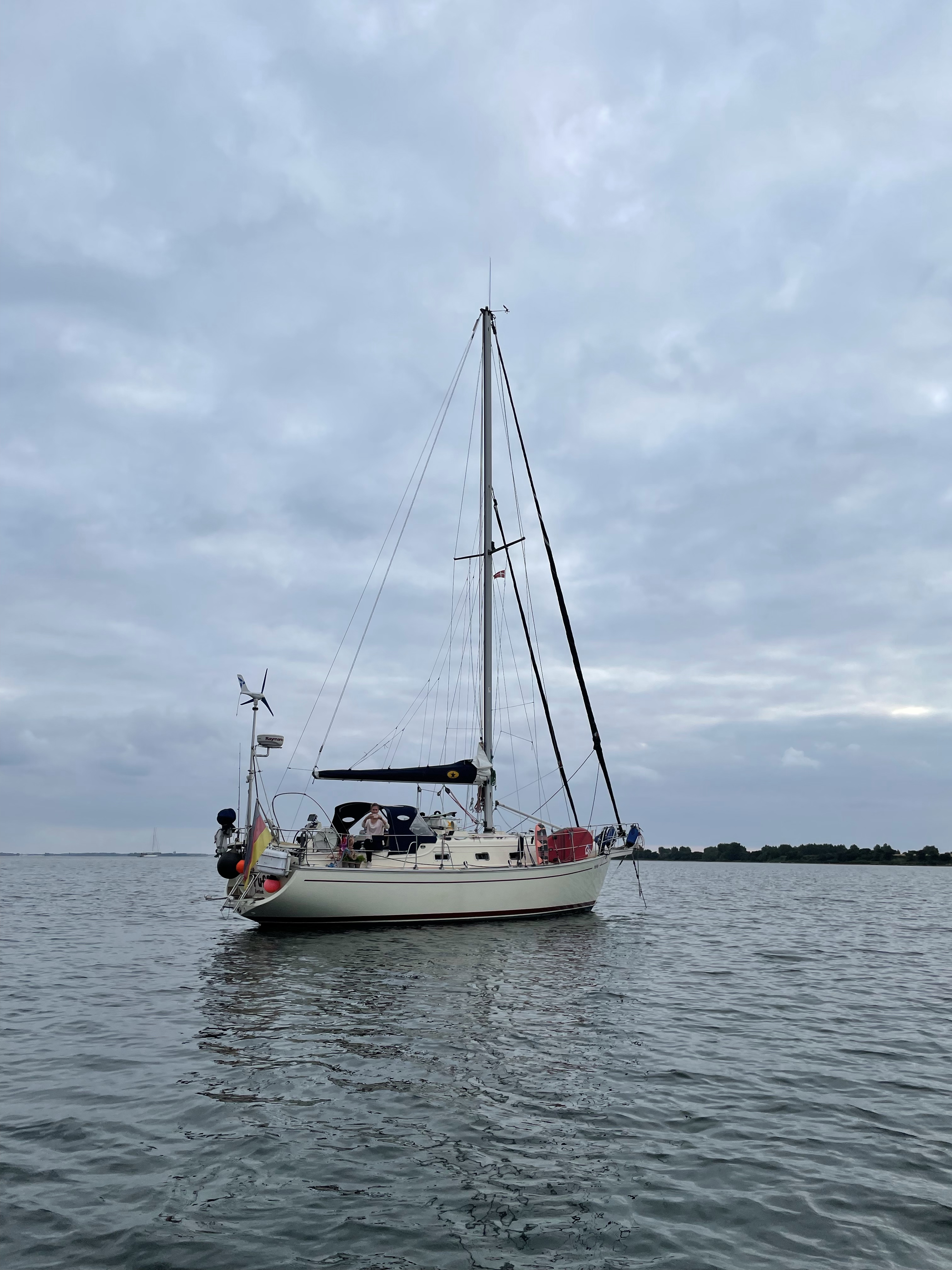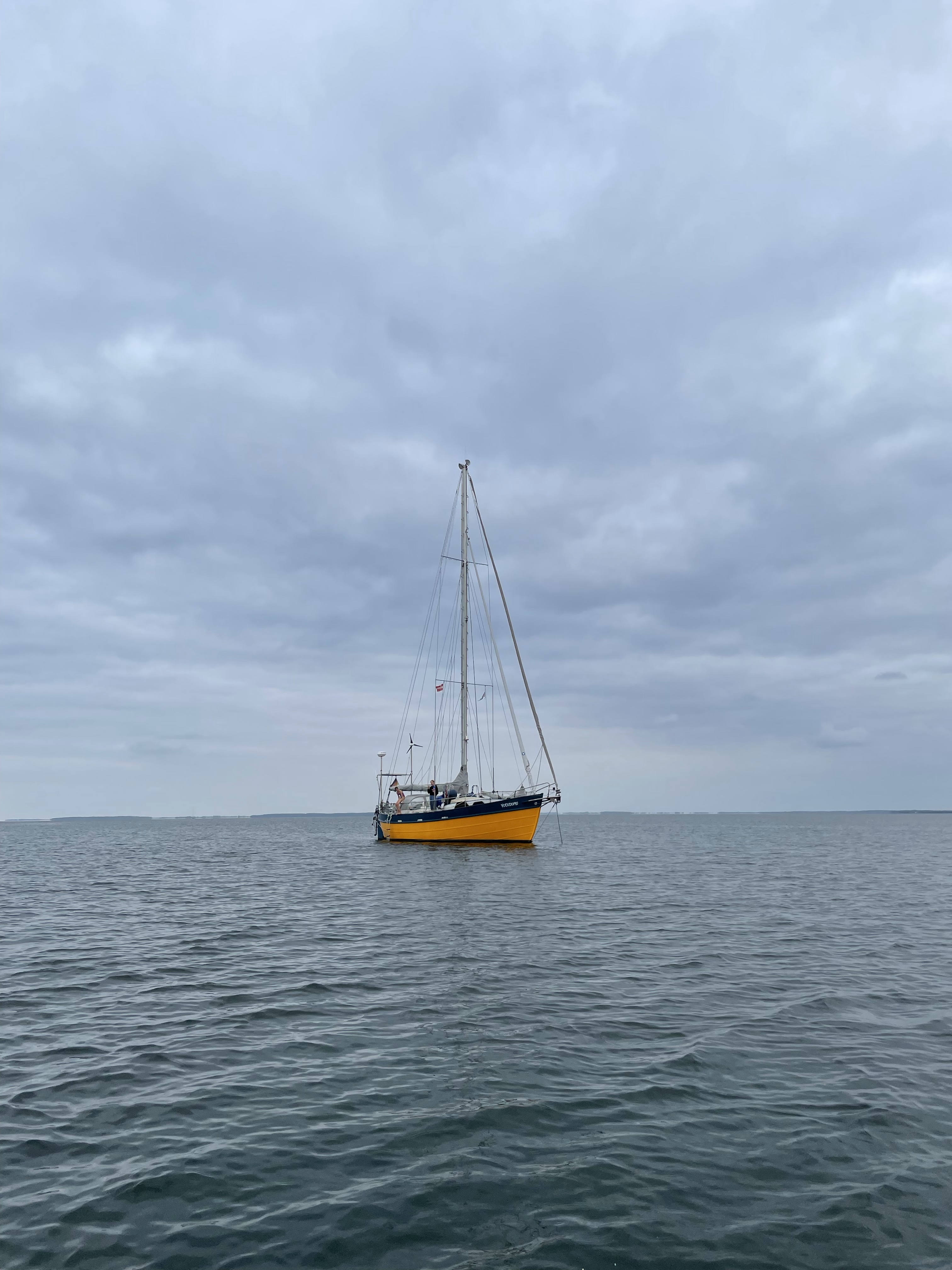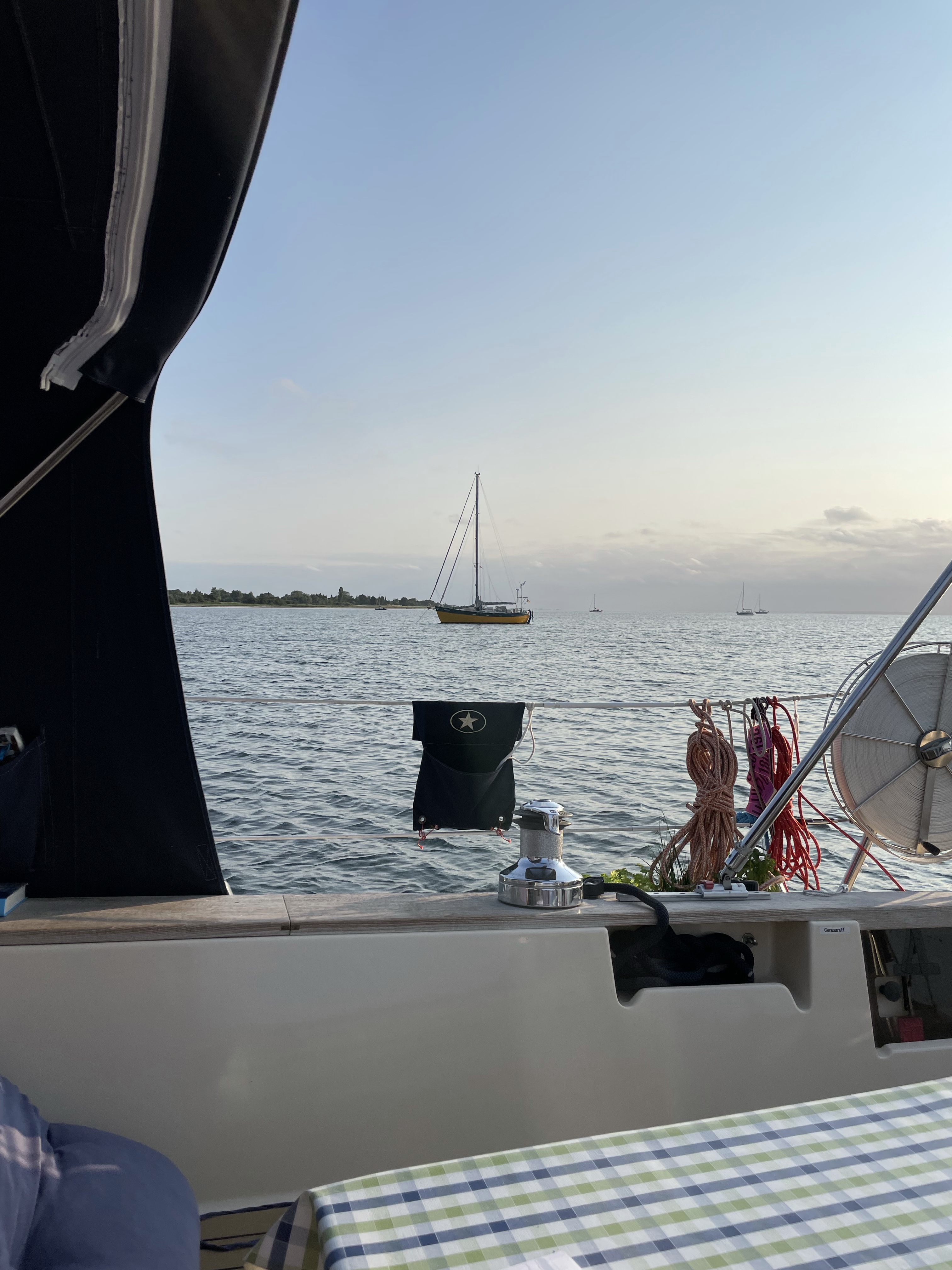 Nicht schnell genug, wie sich im Hafen zeigte. Der ist ziemlich klein und war natürlich schon zu voll für uns und die Yuendumu, die etwa 30 Minuten hinter uns lagen. Daher entschieden wir, auf der windgeschützten Südostseite von Femø zu ankern. Also nochmal ein Stunde dorthin motoren. Der Platz war aber schön ruhig. Nur unsere Batterien waren vom Segeltag ziemlich leer und unsere Lichtmaschine vom Motor wollte nach dem Ankermanöver mit der Ankerwinsch die Batterien nicht mehr laden. Nach Fehlersuche mit Heiko von der Yuendumu lieferte sie wieder Ladestrom und der Kühlschrank konnte an bleiben. Vermutlich ist die Leistung für den Betrieb der Ankerwinsch nicht ausreichend und der Ladestromverteiler geht dann in die Notabschaltung der Batteriebank. Wieder was zum Kopfzerbrechen.
