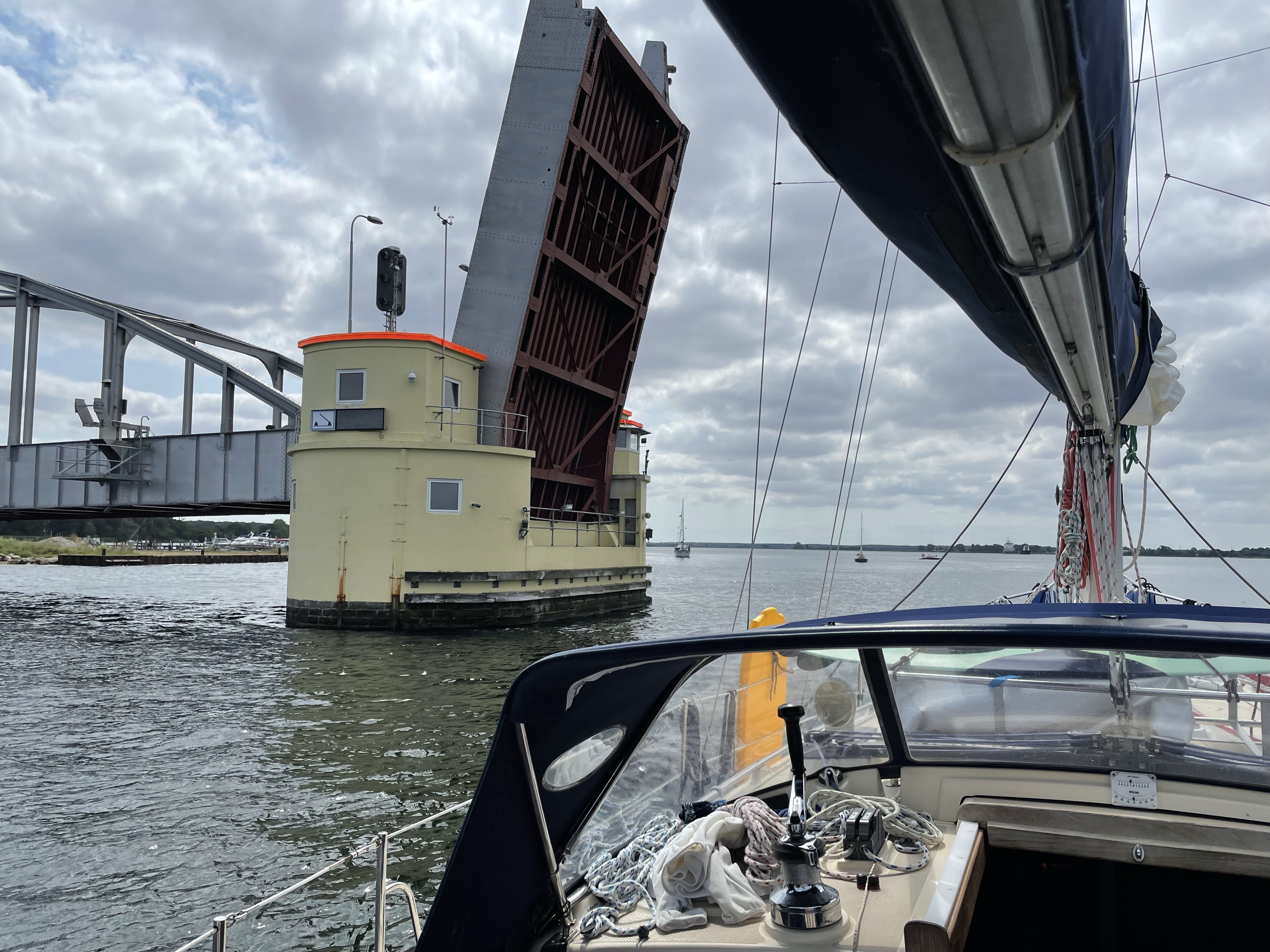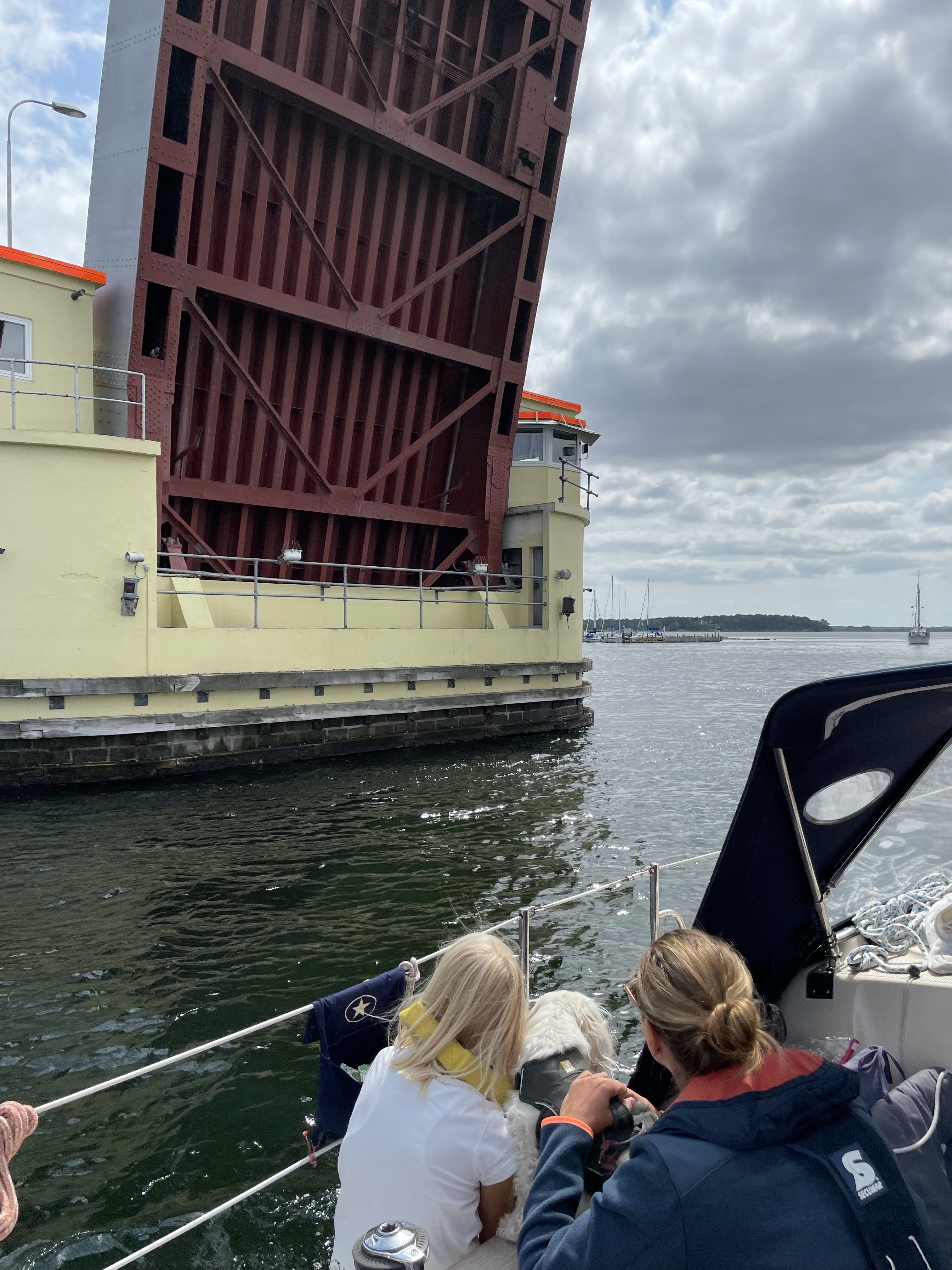Nach einer ruhigen Nacht vor Anker setzten wir die Segel und gingen auf Kurs in den Guldborgsund. Bei nur 2 Windstärken rutschten wir nur mit 2,5 bis 4 Knoten über die Flachgebiete vor dem Sund bis zur Brücke, die 12:45 Uhr für uns öffnete.