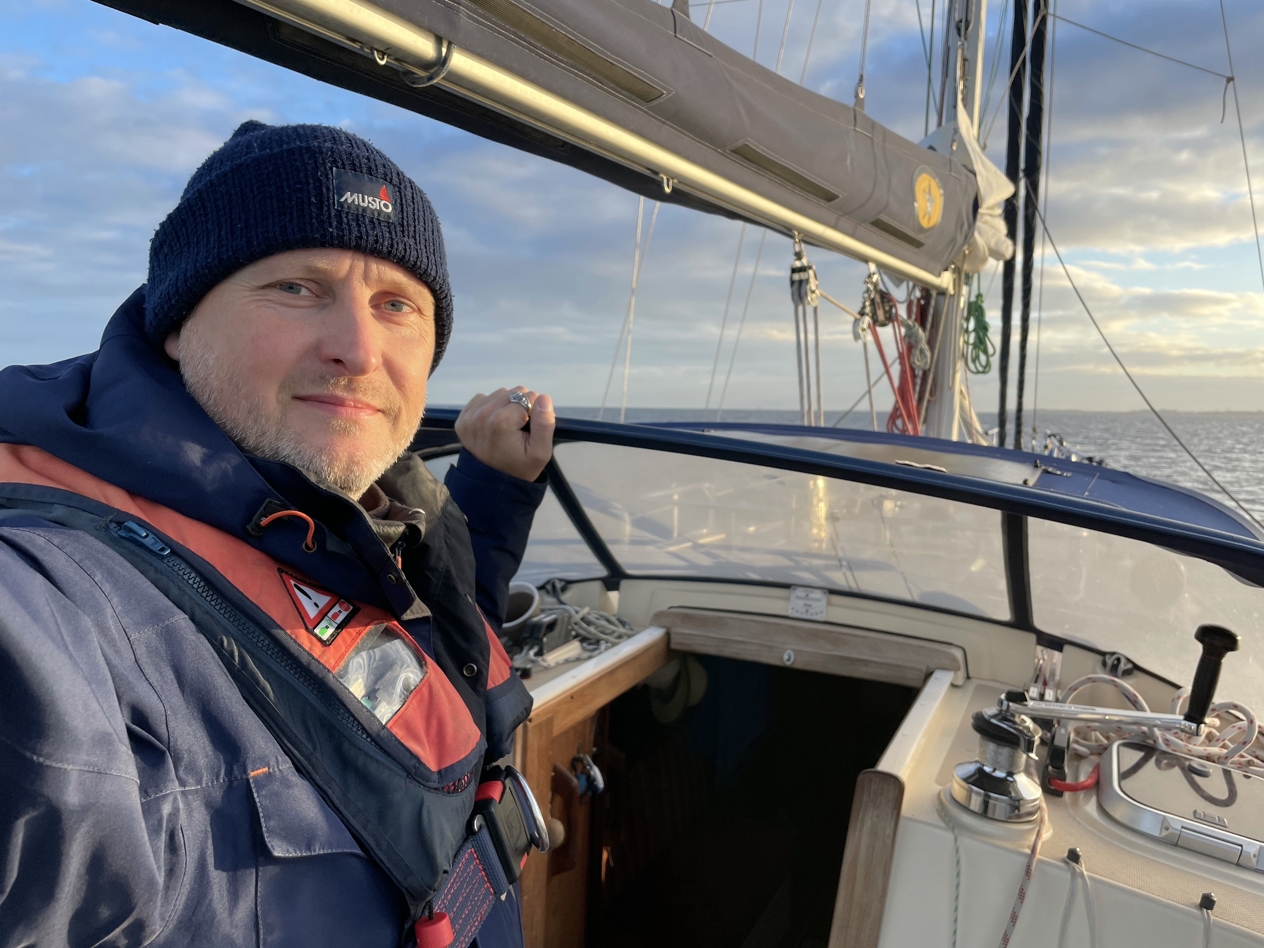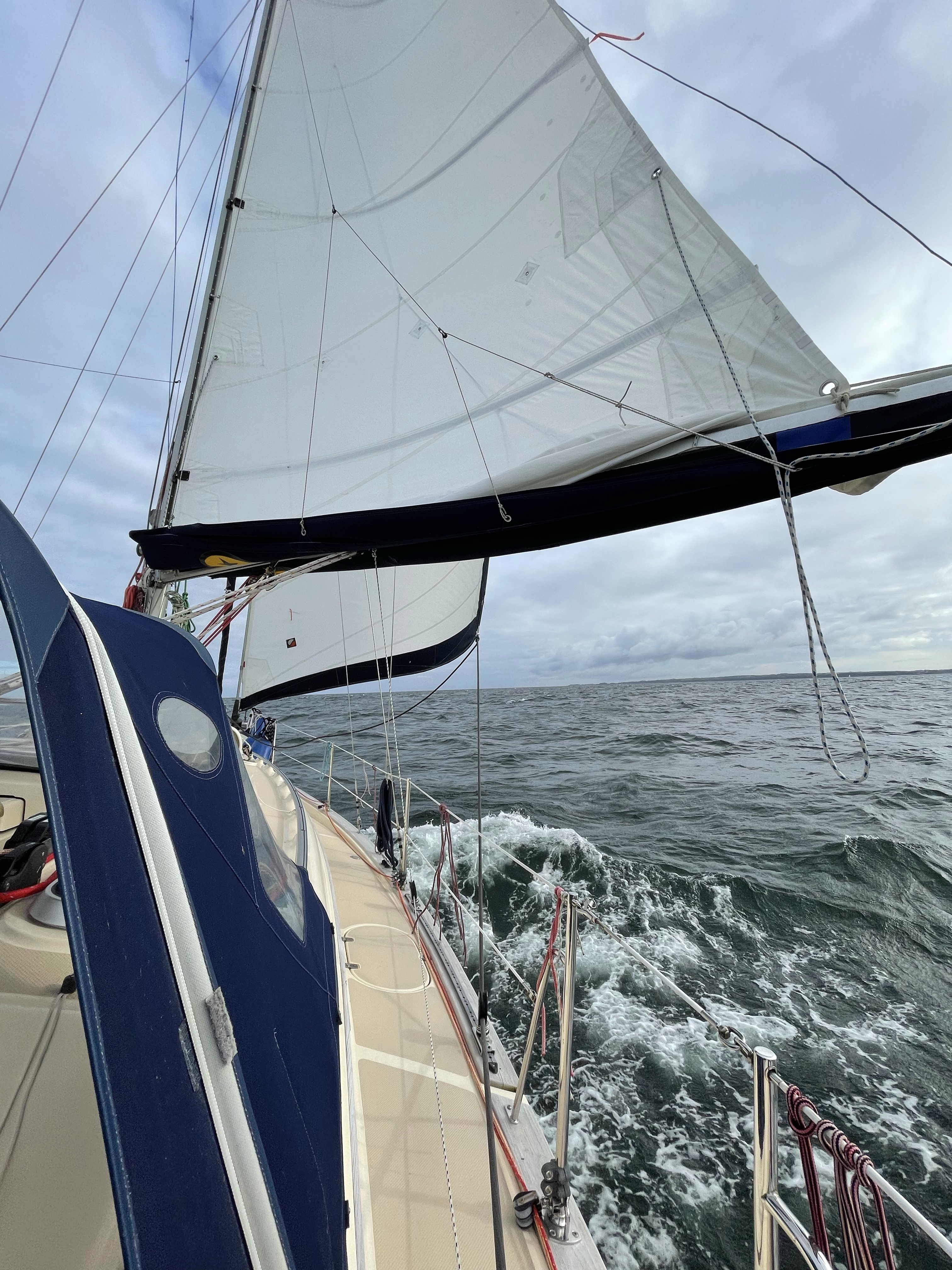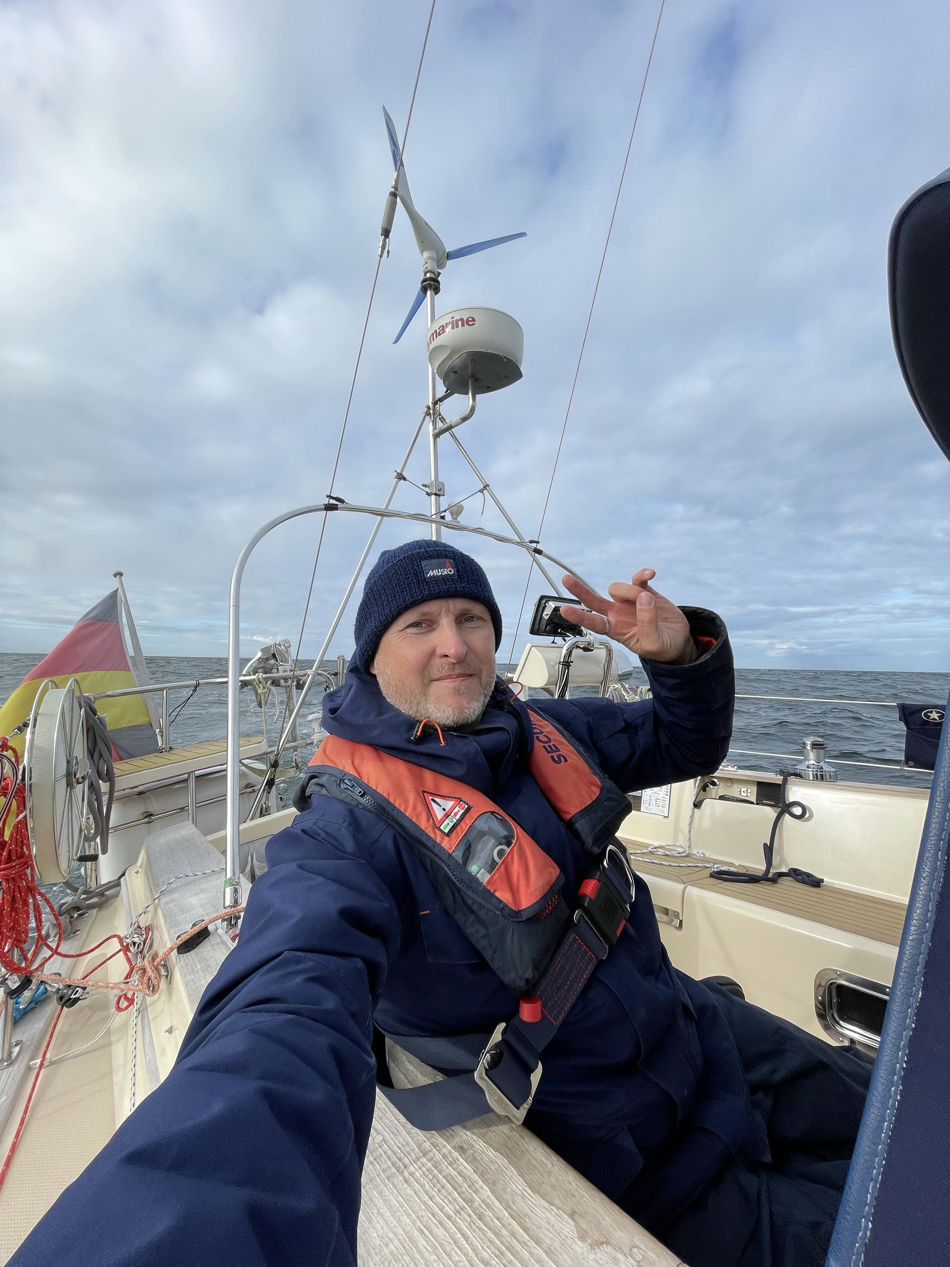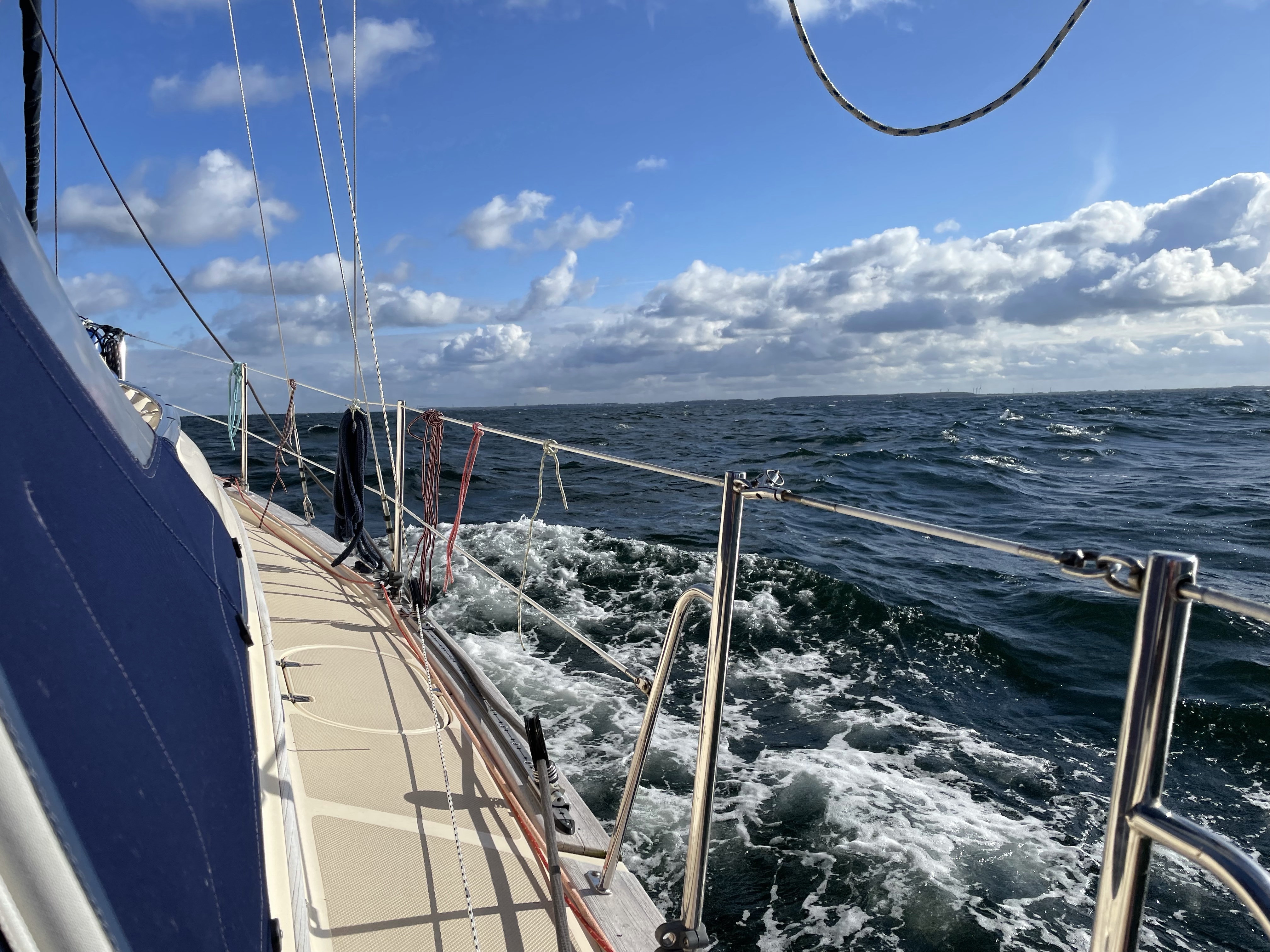 Schließlich bläst es mit 20 bis 25 Knoten und bis zu 2 Meter Wellen rollen uns ordentlich durch. Auf Höhe Kühlungsborn muss ich dann weiter abfallen und direkt vor Wind und Wellen gehen, um Kurs auf Warnemünde zu halten. Das Vorsegel habe ich weg gerollt. Nur mit gerefftem Groß reicht das trotzdem für 5-6 Knoten Fahrt. Das schafft dann auch der Autopilot und ich kann etwas chillen und was essen.