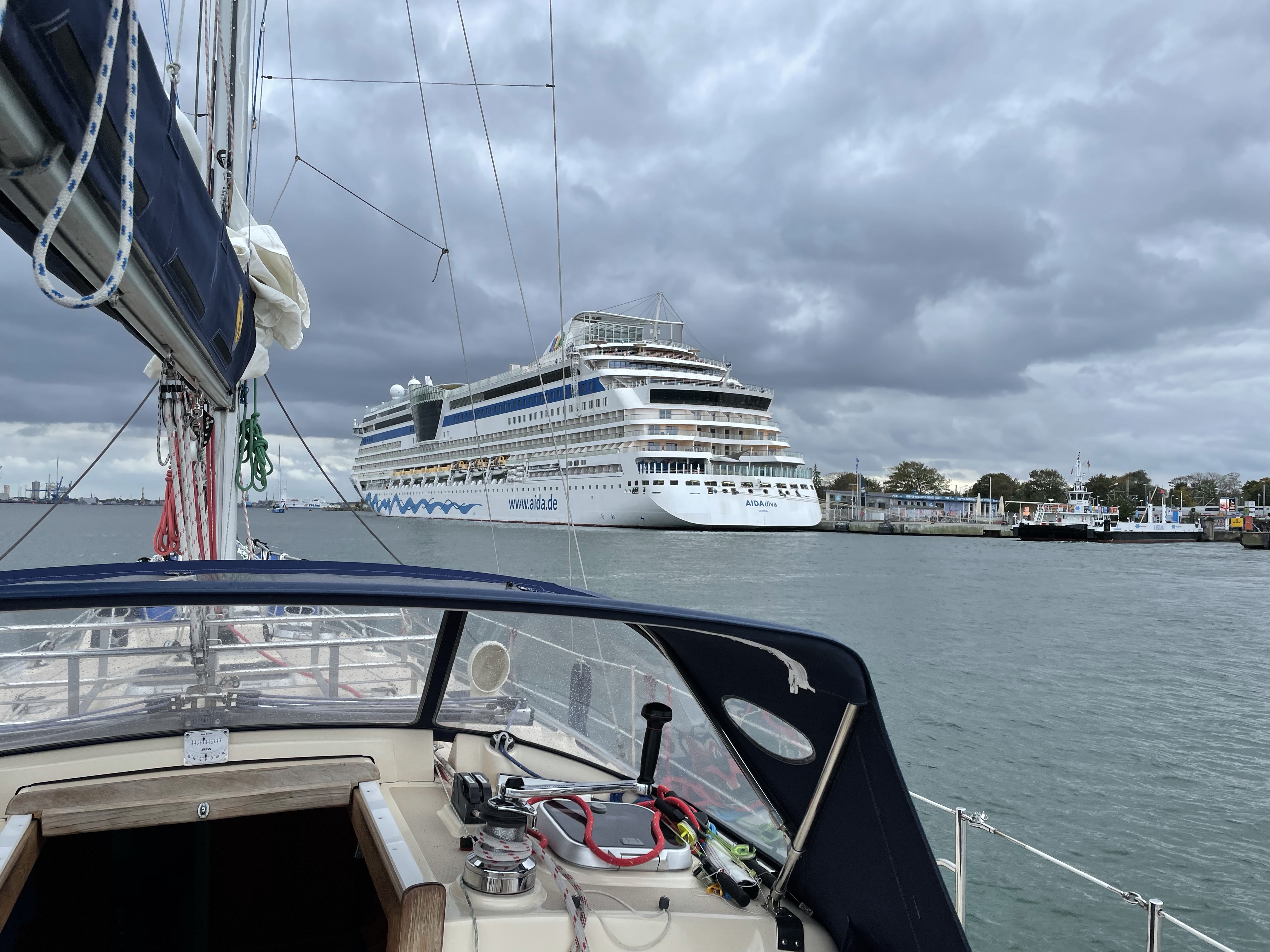 Die Meilen werden gefressen und schon wird der Leuchtturm von Warnemünde größer. Bereits kurz nach halb Drei liegt die Hafeneinfahrt vor mir. Hinter den Molenköpfen wird es ruhiger und ich berge das Segel. Vorbei an der Aida Diva motore ich dann nur noch die Warnow hinauf bis zu SAB-Marina Bramow. Kurz vor vier Uhr liege ich dort längsseits am Schwimmsteg. Kaffeezeit. Das hat doch gut geklappt bis hierhin, auch einhand. Stolz öffne ich noch ein Anlegebierchen. Dann wird erstmal ausgespannt. Abends gibt es wieder Pizza. Am nächsten Tag steht dann Segel abschlagen und Wassersystem entleeren auf dem Plan, bevor es Montag aus dem Wasser geht.