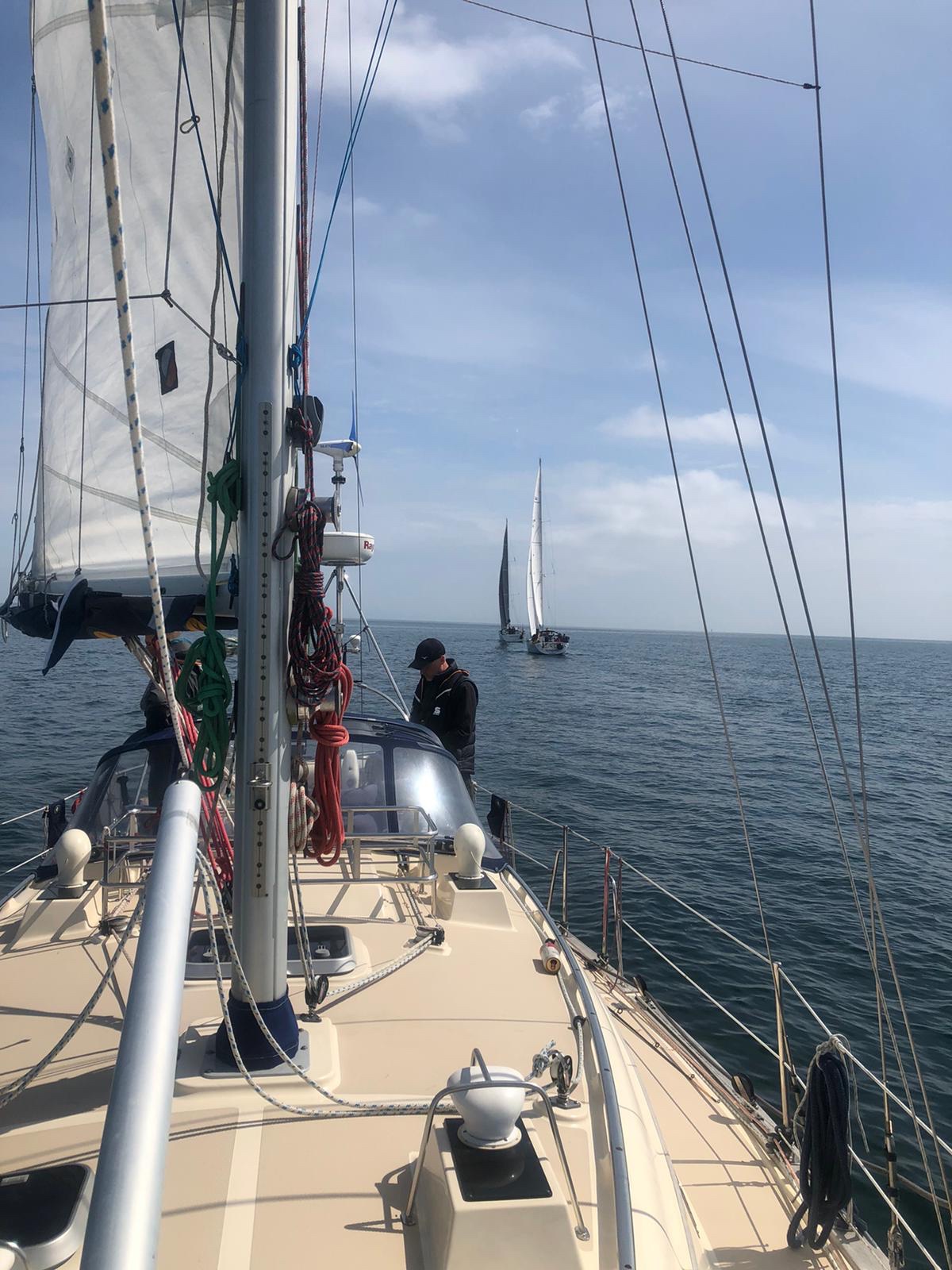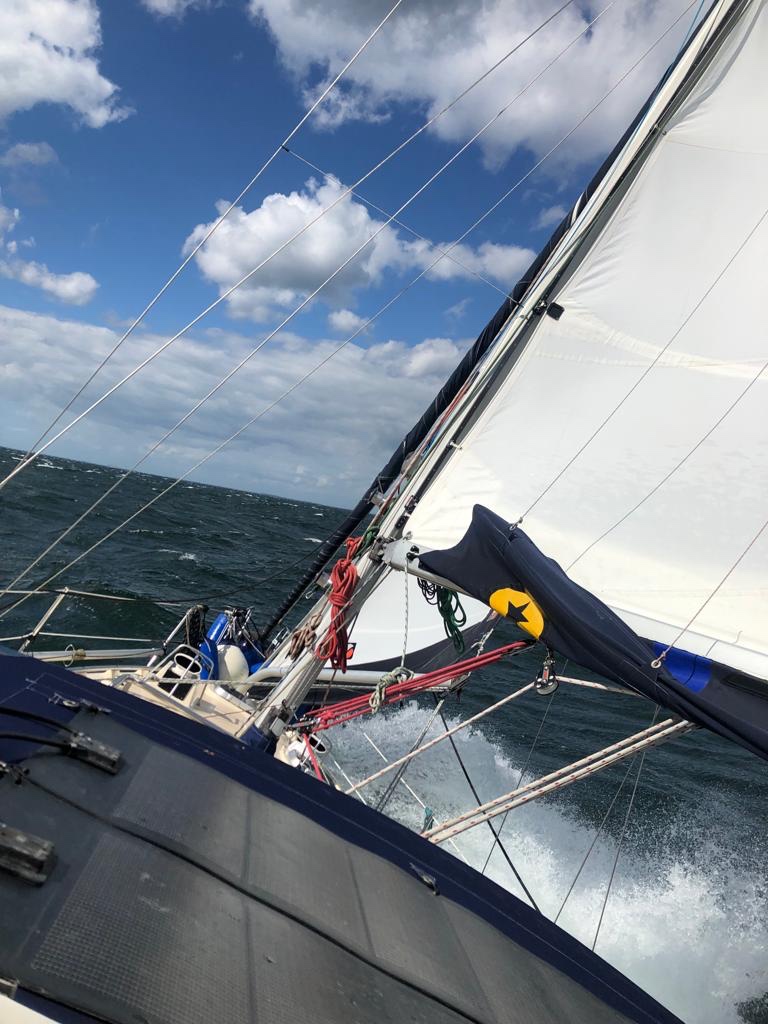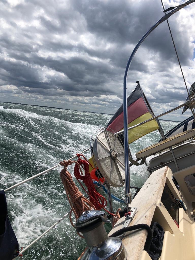 Kaum aus der Wohlenberger Wiek raus, begann dann die wilde Fahrt bei 6-7 Windstärken zunächst auf Halbwindkurs. Immer höhere Wellen von teils über 2 Meter rollten uns von der Seite kräftig durch. Immer wieder trafen uns auch Sturmböen und überzeugten uns, die richtige Besegelung gewählt zu haben. Mit 5,5 – 6,5 Knoten kamen wir gut voran. Waren auch das einzige Boot da draußen mit Kurs Fehmarn. Regelmäßig zerschellten Wellenberge auch am Rumpf und sorgten für einen kalten, salzigen Platzregen im Cockpit.