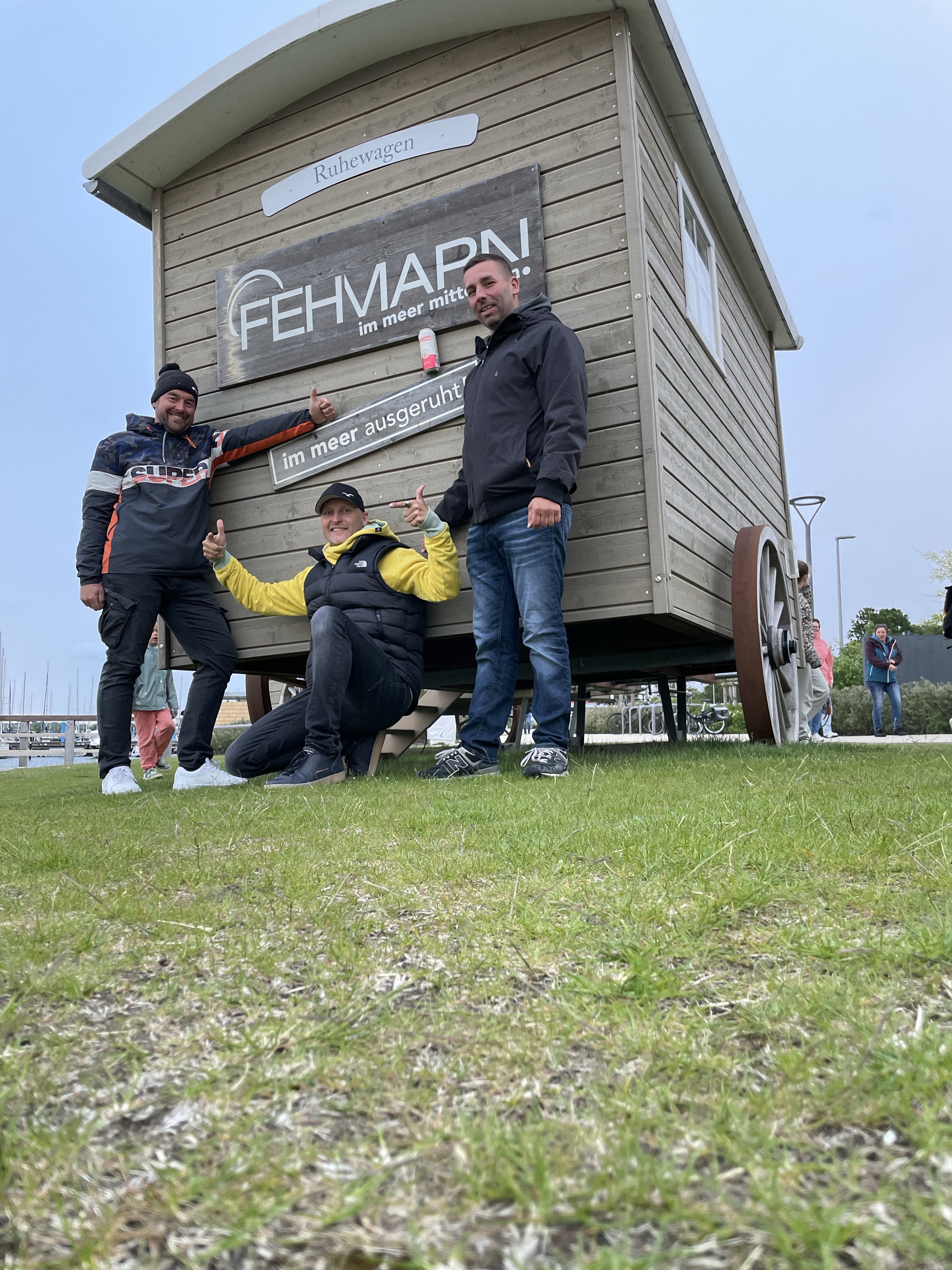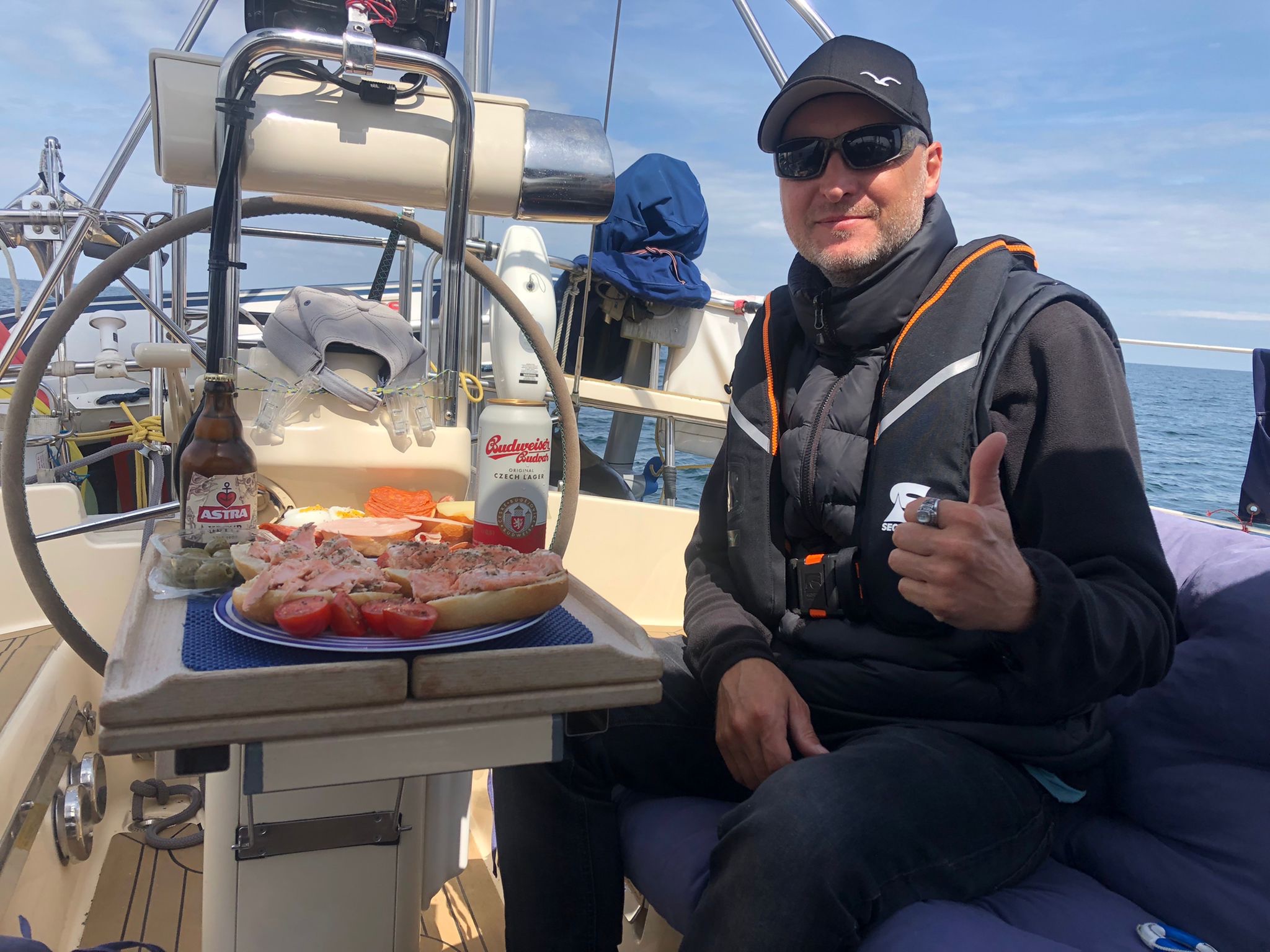Immerhin halfen die Tabletten offenbar und wir konnten langsam schon die Fehmarnsundbrücke sehen und die drei Hochhäuser am Südstrand. Am Fehmarnsund frischte es aber nochmal weiter auf und hackte aus allen Rohren. Mussten nun auf Amwindkurs nochmehr gegenhalten, erreichten aber gut die Einfahrt zum Binnensee. Da hatten etliche Surfer und Kiter ihren Spaß. Wir waren stolz und glücklich, es ohne Schäden geschafft zu haben. Nach fünfeinhalb Stunden machten wir in Burgtiefe fest und gönnten uns das wohlverdiente Anlegebier. Unter der Kuchenbude saßen wir windgeschützt und konnten auch noch lecker grillen.