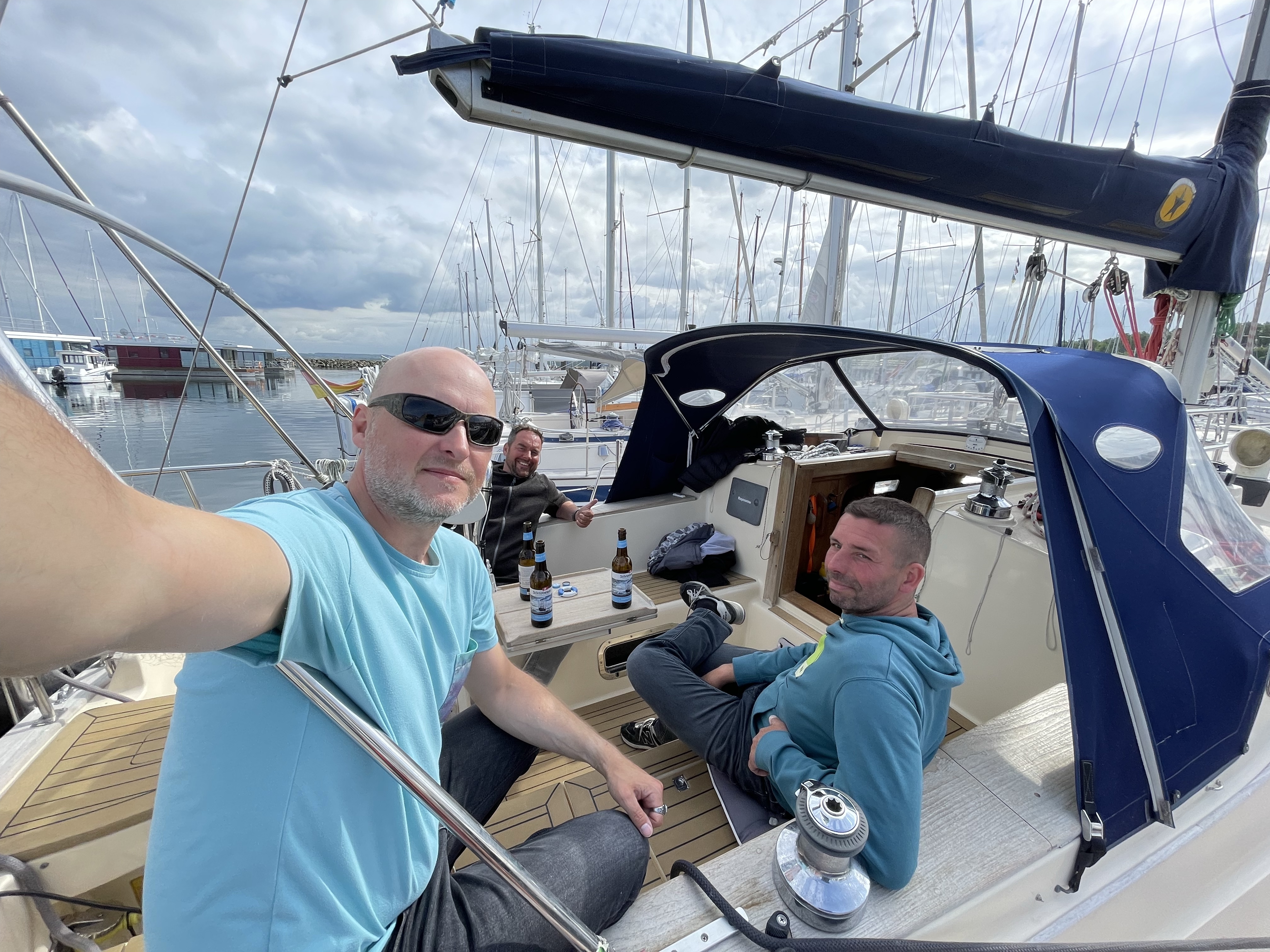 Am Herrentag pfiff es wie angekündigt in der Takelage und wir begannen den Tag lieber mit einem ausgedehnten Frühstück geschützt unter der Kuchenbude. Die Sonne schien und irgendwie keimte doch noch die Lust auf, Segel zu setzen und uns nach Fehmarn rüberzuschlagen. Schließlich wartete dort das Surffestival auf uns mit Party und Surf-Vibes. Das Kitezeug kann man ja mitnehmen. Also verlassen wir kurz vor Zwölf doch noch den Hafen, reffen das Großsegel soweit es geht und setzen vorn nur das kleine Staysail. Vorsorglich haben wir auch jeder eine Tablette gegen Seekrankheit eingeworfen.