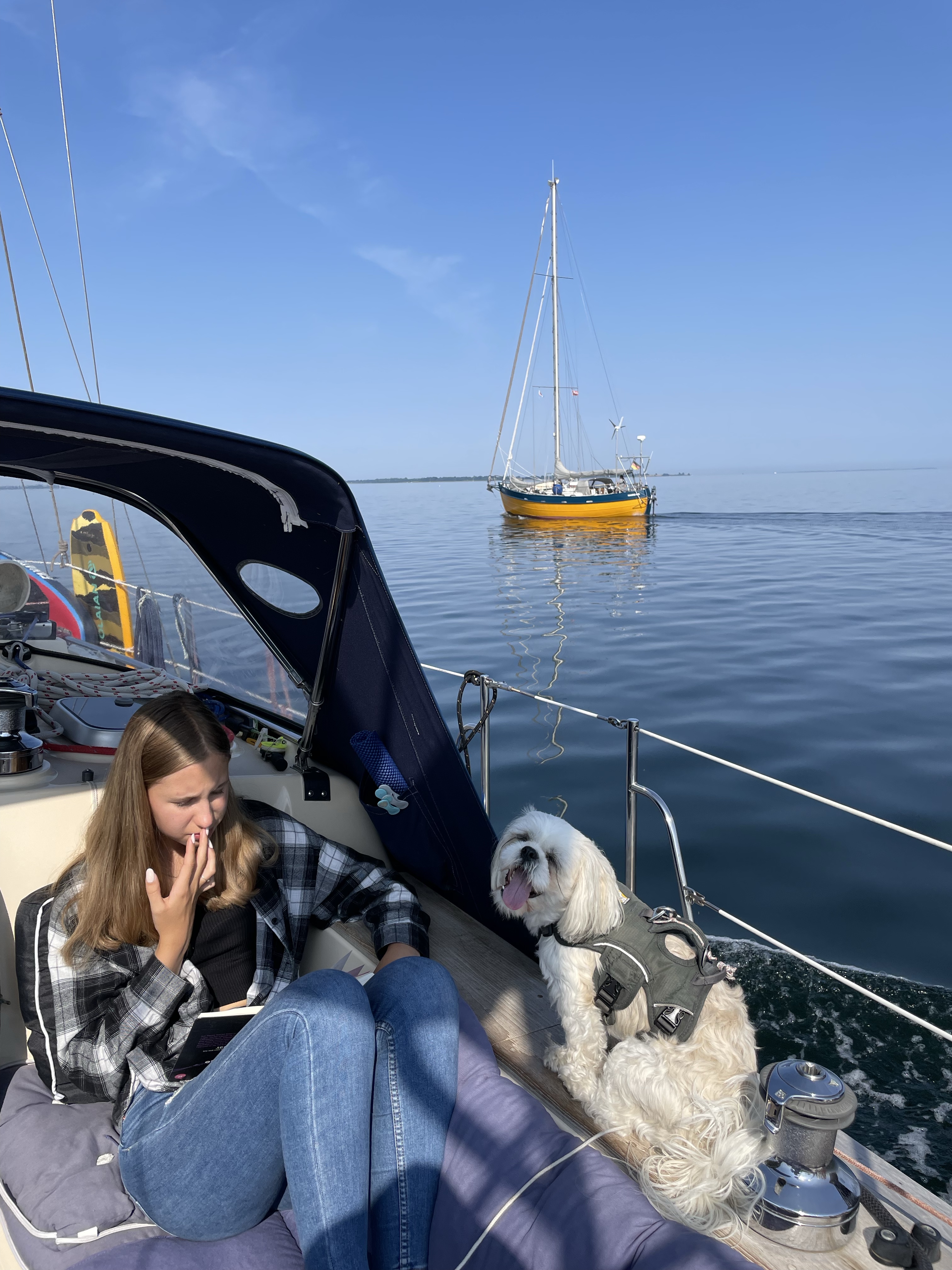 Wir genießen das tolle Sommerwetter mit baden am Strand gleich neben dem Hafen und abends beim Grillen reicht das T-Shirt. Mit 27 Grad ist es immerhin nicht ganz so heiß wie zuhause mit 10 Grad mehr.