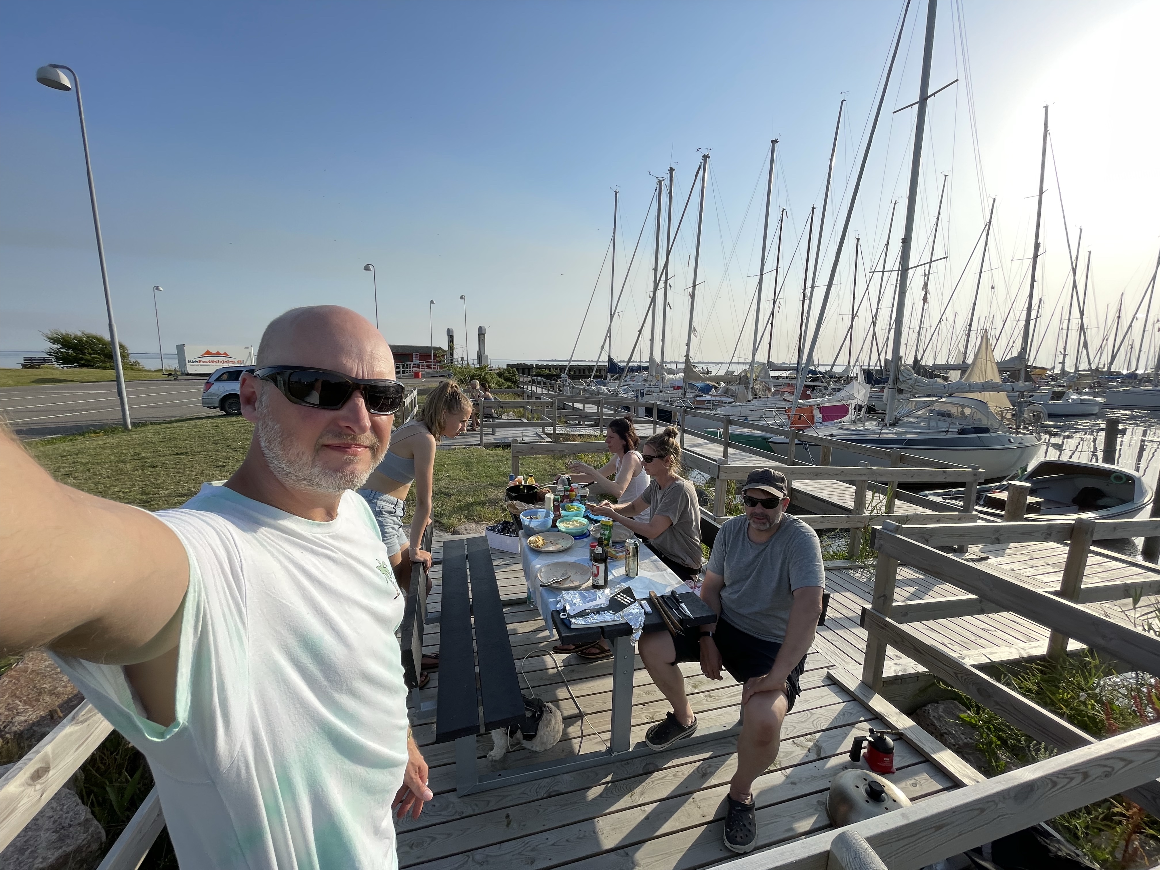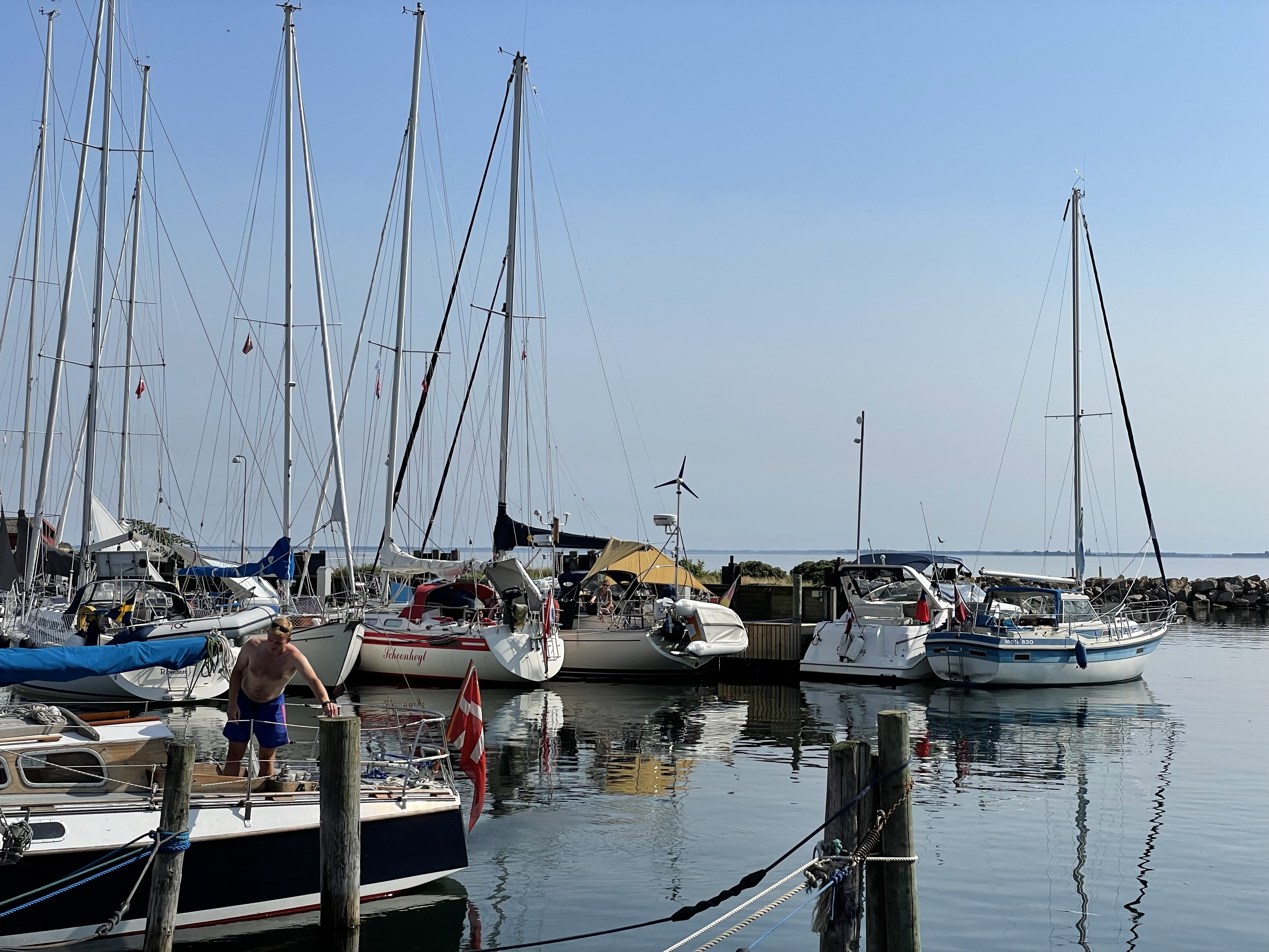 Vom Ankerplatz haben wir uns 5 Seemeilen weiter in den Hafen von Femø verholt. Obwohl wir schon kurz nach 10 Uhr einlaufen, haben einige Boote die gleiche Idee. Der Hafen ist gut gefüllt. Dennoch gelingt es uns, noch einen schönen Platz zu ergattern. Allerdings kommen immer mehr Boote in den Hafen und ehe wir es uns versehen, liegen weitere 3 Boote an uns dran.