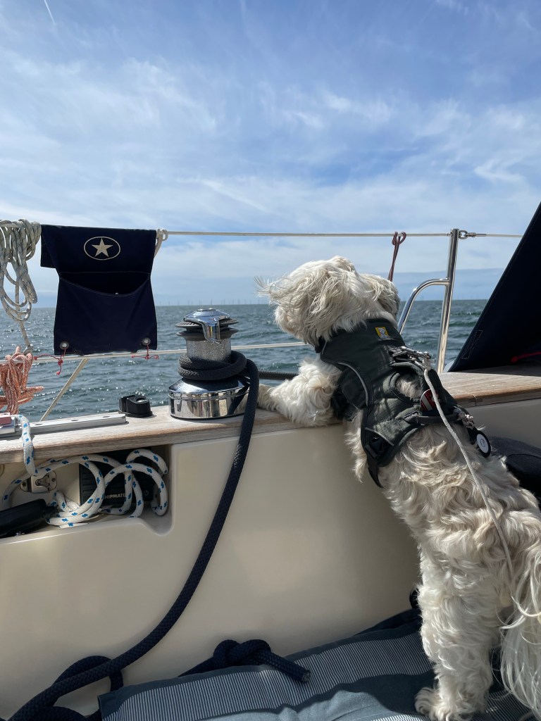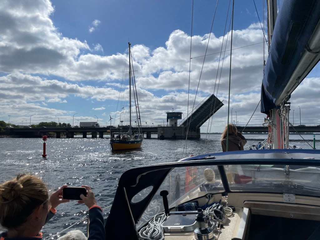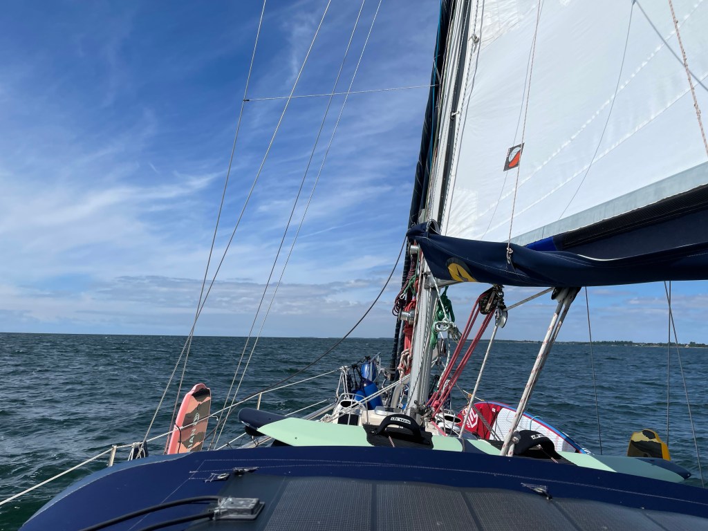 Nachdem ich heute früh mit Heiko die Autos pünktlich gegen 8 Uhr in Maribo abgeliefert habe und der Zug uns in Nykøbing wieder ausgespuckt hat, gab es erstmal Frühstück. Wir beeilten uns und schafften noch die Brückenöffnung um 10:06 Uhr. Als wir aus dem Sund waren, konnten wir noch 5 Seemeilen mehr oder weniger schnell segeln. Dann lag unser Ziel genau da, wo der Wind herkam. Also motorten wir mit Großsegel hoch am Wind gegen die sich aufbauende Welle. Der Wind hatte nämlich aufgefrischt auf 5-6 Beaufort.