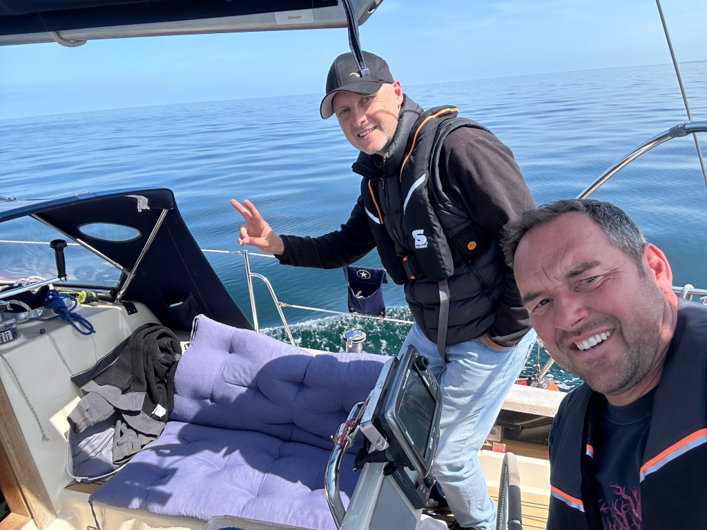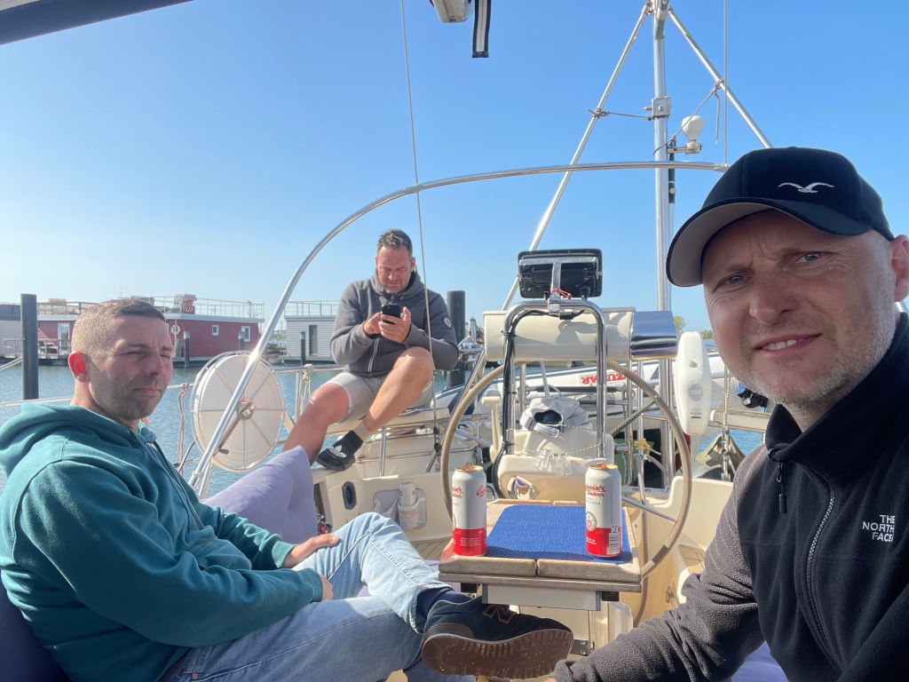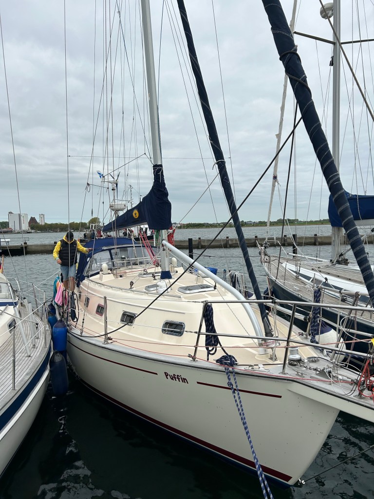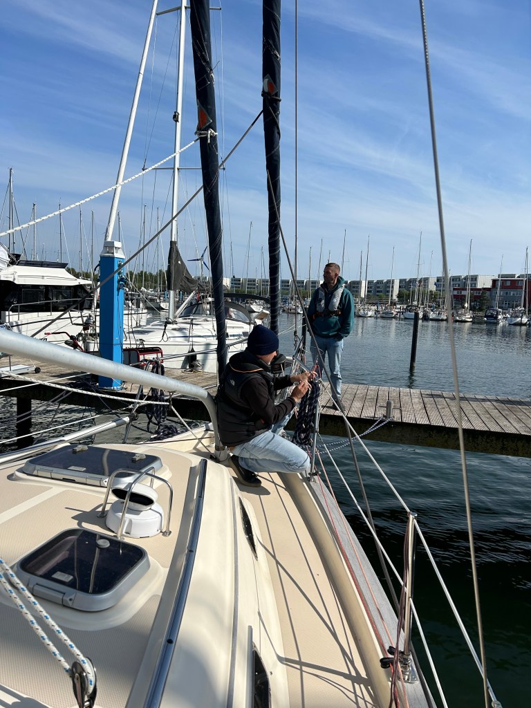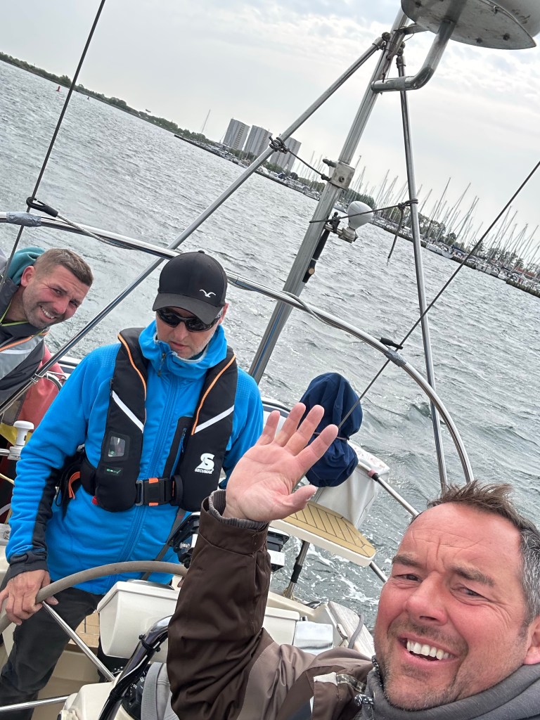 Wir rollen die Genua aus und können auf direktem Halbwindkurs auf Boltenhagen zurauschen mit bis zu 8,1 Knoten. Ein bis zwei Meter Seegang von der Seite schaukeln uns dabei ordentlich durch. Gut, dass wir gestern Abend ruhiger unterwegs waren. Das Ziel kommt schneller näher als gedacht. Bereits 14:20laufen wir in der Weissen Wiek ein. Im Durchschnitt waren wir 6,8 Knoten schnell. Das kann sich sehen lassen. Wir stoßen auf den erfolgreichen Törn an und dann heißt es noch Deckschrubben und Staubsaugen. Eins steht fest – nächstes Jahr zum Herrentagswochenende sind wir wieder am Start.