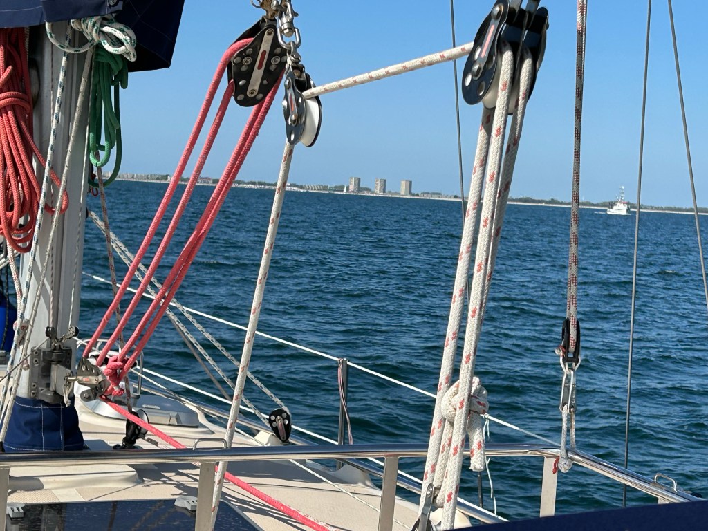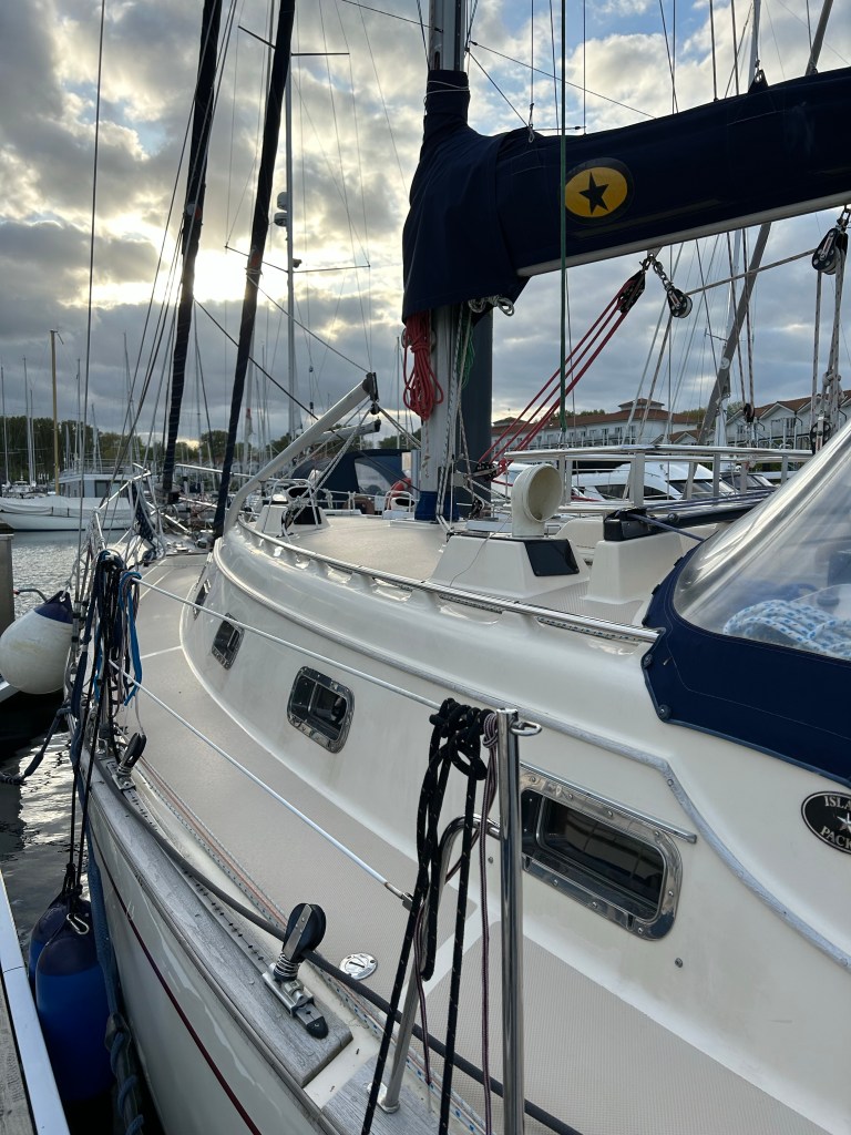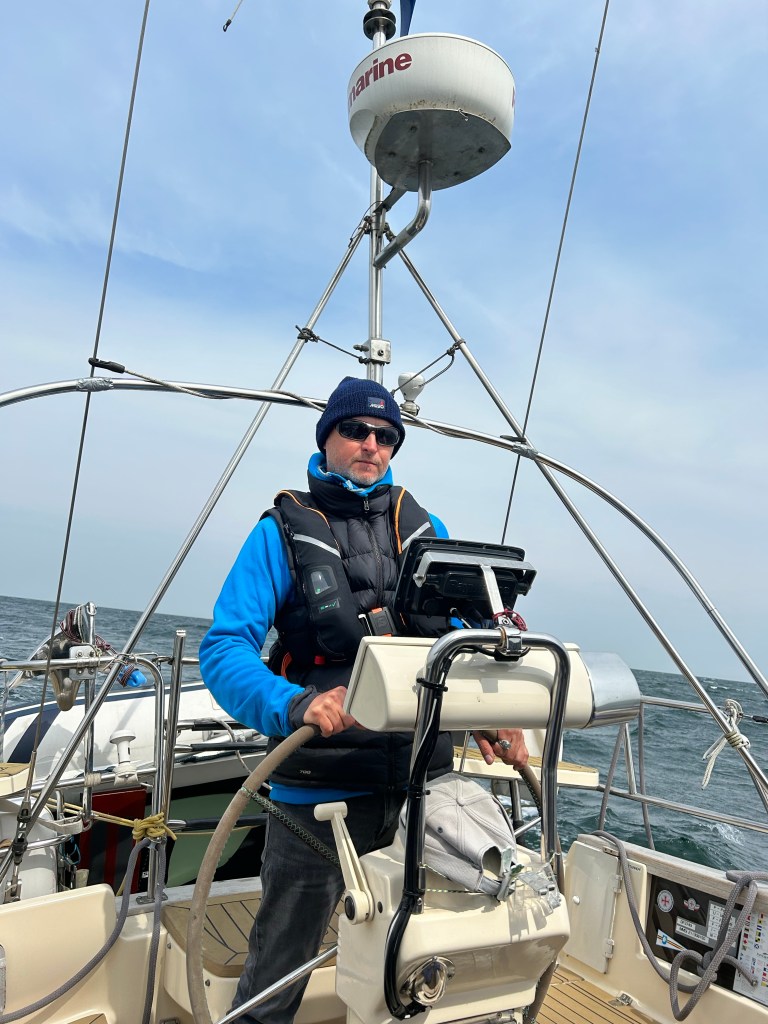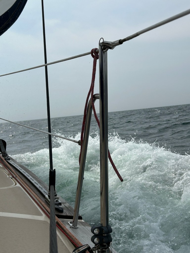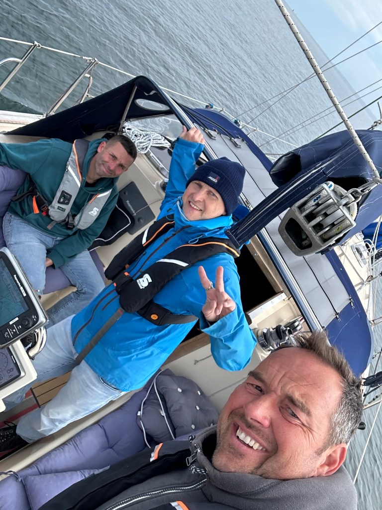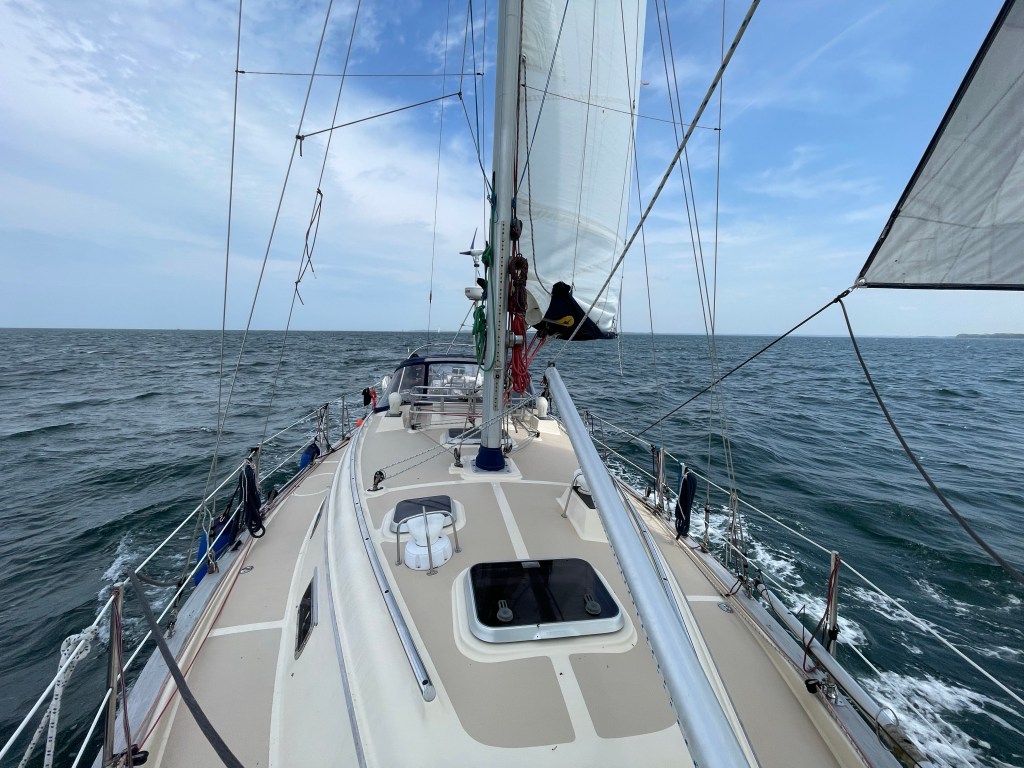 Wir rollen die Genua aus und können auf direktem Halbwindkurs auf Boltenhagen zurauschen mit bis zu 8,1 Knoten. Ein bis zwei Meter Seegang von der Seite schaukeln uns dabei ordentlich durch. Gut, dass wir gestern Abend ruhiger unterwegs waren. Das Ziel kommt schneller näher als gedacht. Bereits 14:20laufen wir in der Weissen Wiek ein. Im Durchschnitt waren wir 6,8 Knoten schnell. Das kann sich sehen lassen. Wir stoßen auf den erfolgreichen Törn an und dann heißt es noch Deckschrubben und Staubsaugen. Eins steht fest – nächstes Jahr zum Herrentagswochenende sind wir wieder am Start.