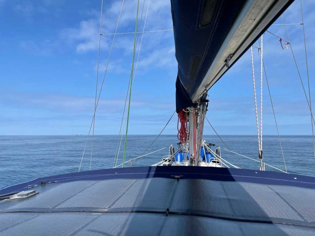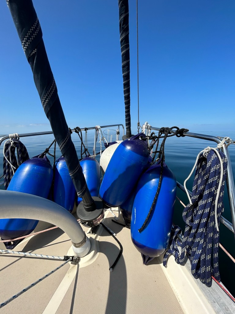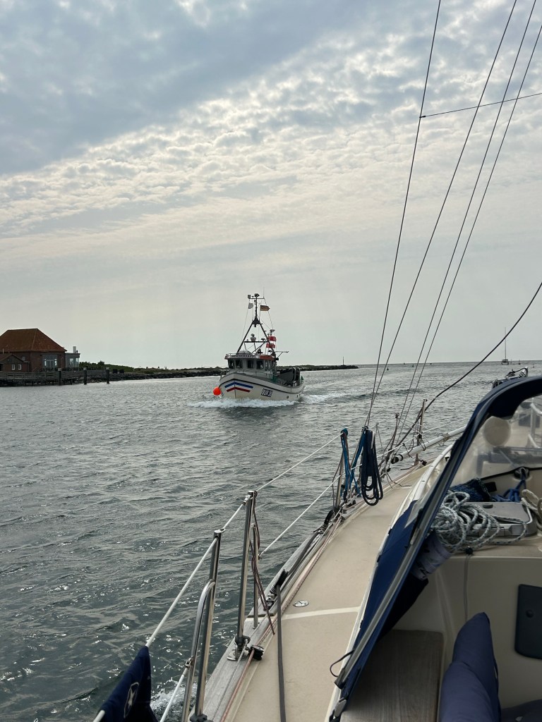 Nach dem Frühstück bereiten wir uns zum Auslaufen vor. Zuerst einmal führt uns der Weg allerdings an die Tankstelle, da ja reichlich Seemeilen unter Motor anstehen. An der Tankstelle müssen wir beim Anlegen kreativ werden, denn der Schlauch von der Zapfsäule ist zu kurz. Mit vergoldetem Diesel für 2,64 Euro pro Liter verlassen wir um 11 Uhr den Hafen. Die See ist spiegelglatt und der Autopilot steuert uns zuverlässig unserem Ziel entgegen. Sichten sogar einige Schweinswale. Das Wasser ist ölig glatt, so dass wir gemütlich Kaffee und Kuchen aufdecken können. Der Fahrtwind ist unangenehm kühl aber unter der Sprayhood ist es schön warm.