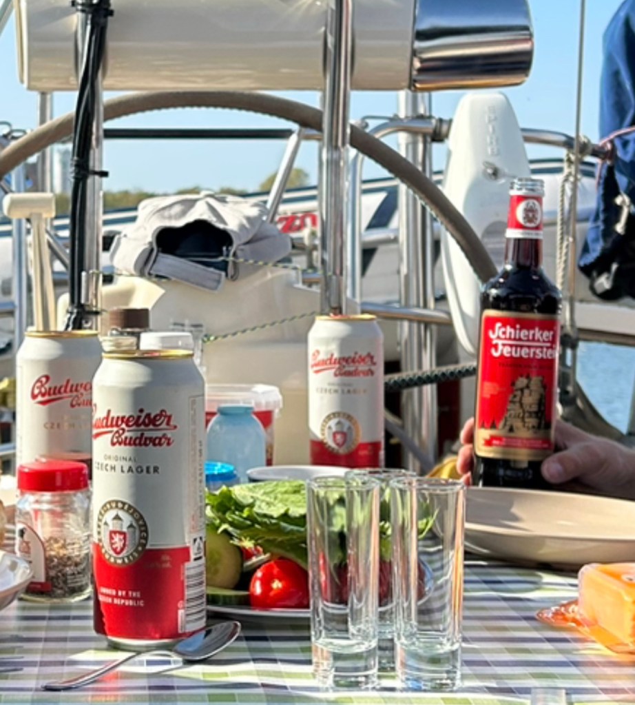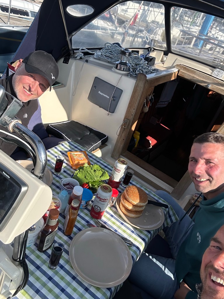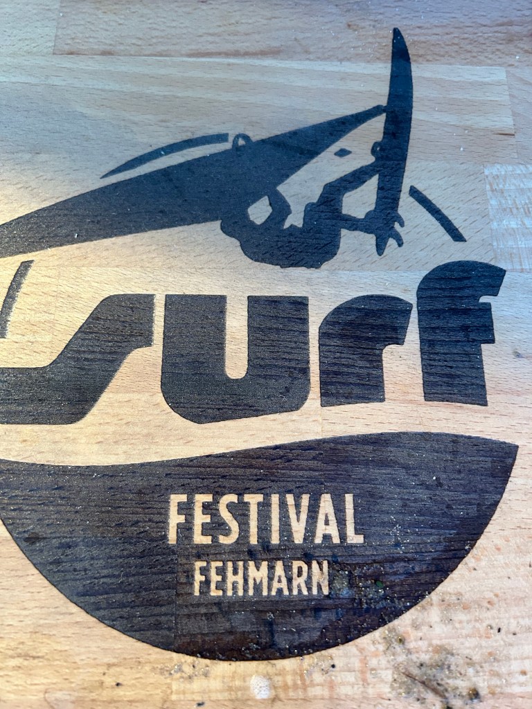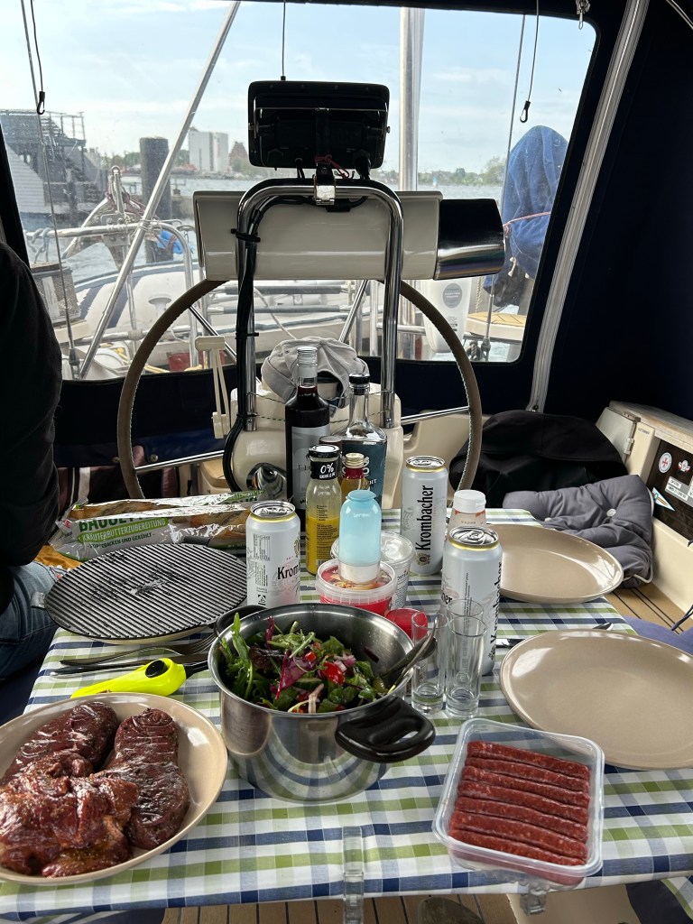 Als wir den Fehmarnbelt erreichen, kräuselt sich das Wasser wieder und Gegenwind kommt auf. Es sind aber nur 4 Seemeilen bis zur Einfahrt nach Burgtiefe. Da lohnt es sich nicht mehr die Segel auszupacken und aufzukreuzen. Wir finden einen schönen Liegeplatz außen am Rundsteg und gönnen uns ein Anlegebierchen in der Sonne. Wir genießen den anbrechenden, lauschigen Abend und bauen erstmal unseren Grill auf. Frische Luft macht hungrig. Leckere Burger sind eine gute Grundlage für die Surferparty auf dem Festivalgelände.