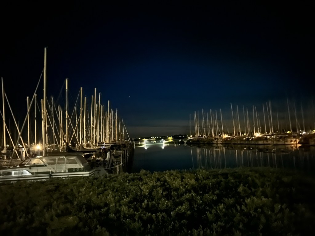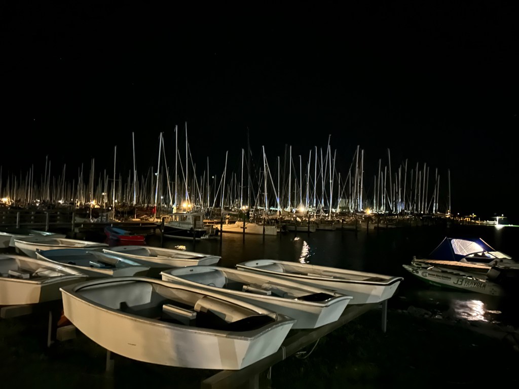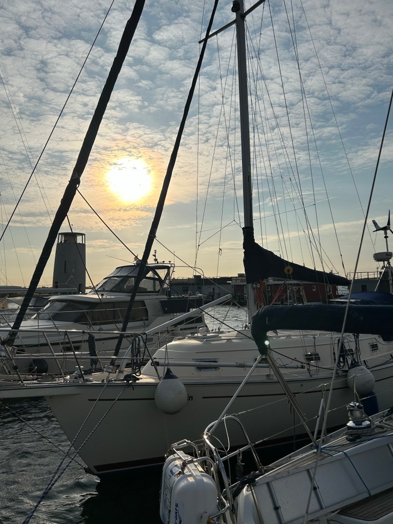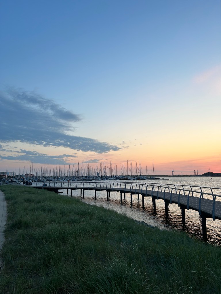 Als wir den Fehmarnbelt erreichen, kräuselt sich das Wasser wieder und Gegenwind kommt auf. Es sind aber nur 4 Seemeilen bis zur Einfahrt nach Burgtiefe. Da lohnt es sich nicht mehr die Segel auszupacken und aufzukreuzen. Wir finden einen schönen Liegeplatz außen am Rundsteg und gönnen uns ein Anlegebierchen in der Sonne. Wir genießen den anbrechenden, lauschigen Abend und bauen erstmal unseren Grill auf. Frische Luft macht hungrig. Leckere Burger sind eine gute Grundlage für die Surferparty auf dem Festivalgelände.