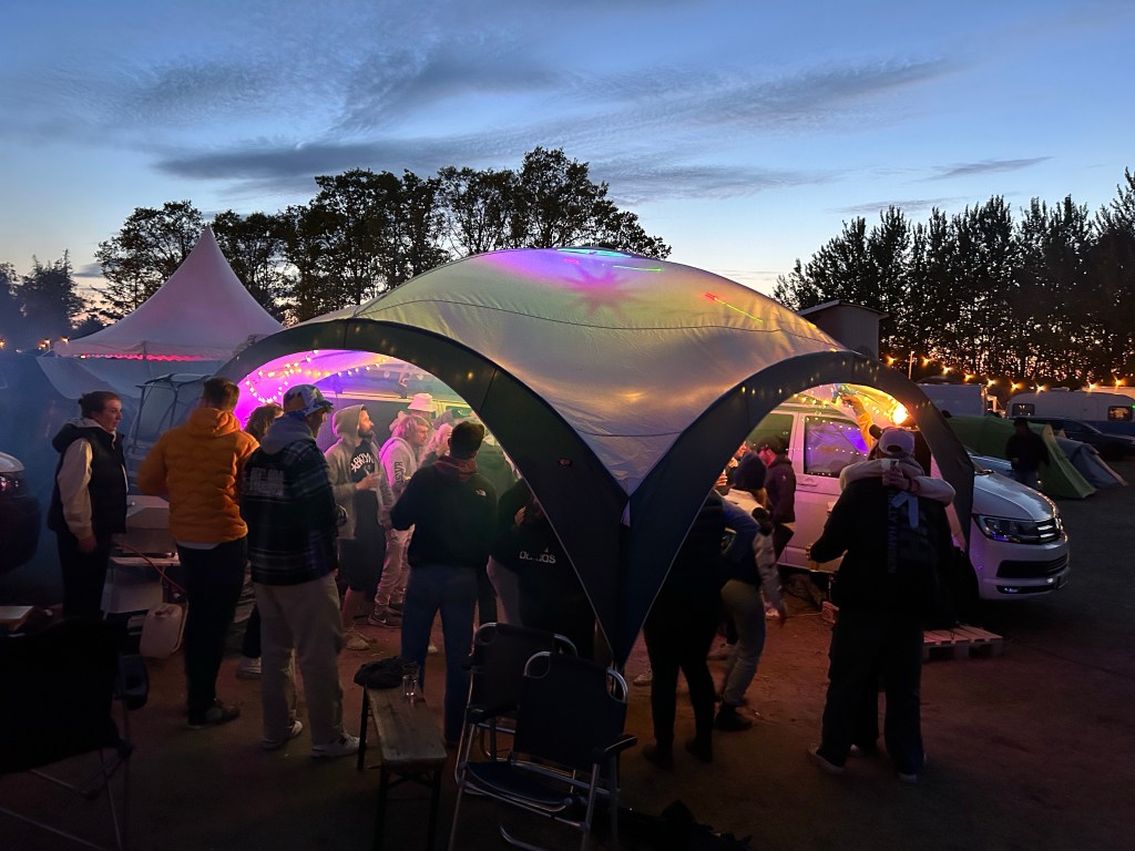 Zurück an Bord steht wieder Grillen auf dem Programm. Diesmal gönnen wir uns Lachs und Garnelen sowie Salat. Draußen pfeift der Nordostwind schon etwas aber unter der Kuchenbude können wir gemütlich und warm sitzen. Gut gestärkt treten wir dann wieder den Weg zum Festival an. Dort gibt es heute House-Beats auf die Ohren von Surfer-Djane Lina Erpenstein. Nicht so ganz unser Ding. Fast keine Vocal-Parts. In den Indoor-Tempel wollen wir uns auch nicht quetschen. Wir bleiben bei einer Privatparty mit DJ hängen. Es sind die Leute, die am Tag zuvor im Charchulla Musik gemacht hatten. Zwischen zwei Surferbussen steht ein Zelt mit Lichteffekten, Nebelmaschine und professionellem DJ-Pult. Der Mix ist richtig gut und so feiern wir hier ein bisschen mit.