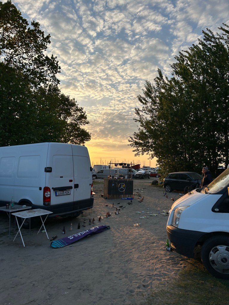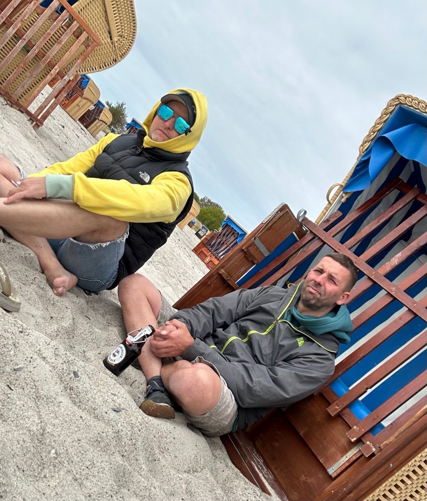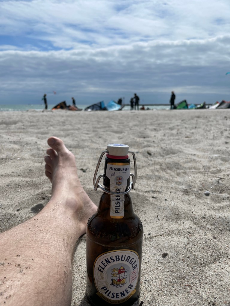 Der Samstag empfängt uns grau und kalt. Es weht ganz ordentlich und der Nordost verhindert Sommergefühle. Dennoch zwinge ich mich in kurze Hose und Flipflops. Nach dem Frühstück laufen wir mal rüber zum Südstrand und schauen, was surftechnisch so geht. Der Kiter, den wir am Vortag noch im Bus getroffen hatten, versucht schon sein Glück bei böigen und leicht ablandigen Bedingungen. Uns fehlt heute die Motivation, unser Zeug zu holen und aufzubauen. Die Partynächte stecken uns in den Knochen und es ist lausig kalt. Daher setzen wir uns lieber in den Windschatten eines Strandkorbs und beobachten. Der Wind nimmt zu und auch die Kiter am Strand. Weiter draußen kriegt einer seinen abgestürzten Schirm nicht mehr hoch und treibt schnell Richtung Fehmarnbelt weg. Weitere Kiter können nicht helfen und schließlich müssen die Rettungsschwimmer mit dem Boot raus.