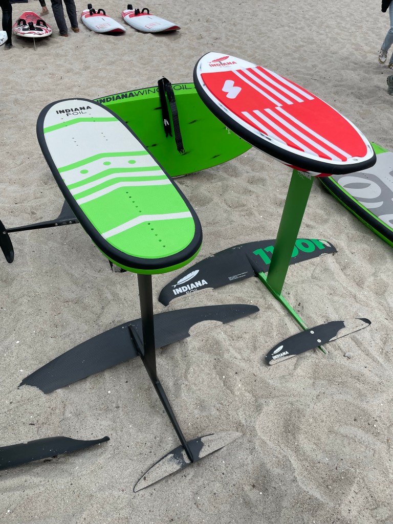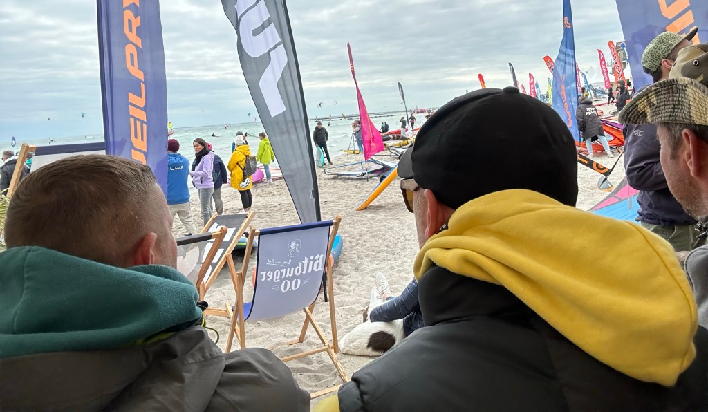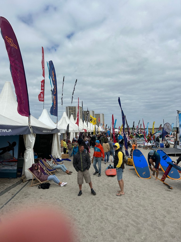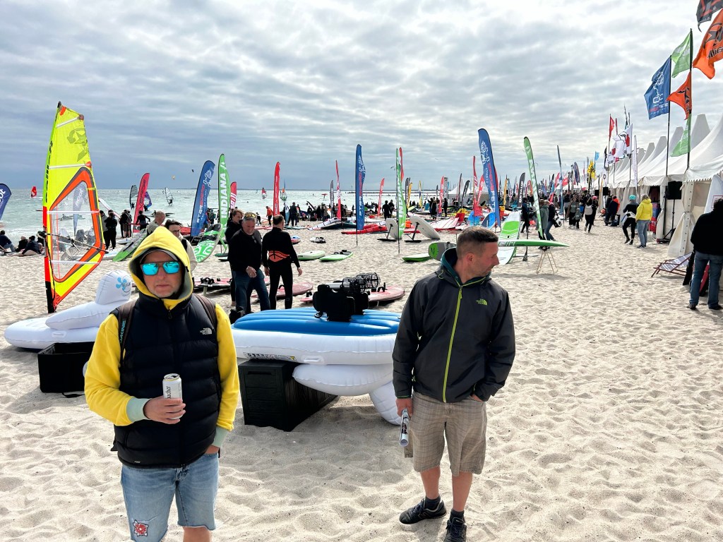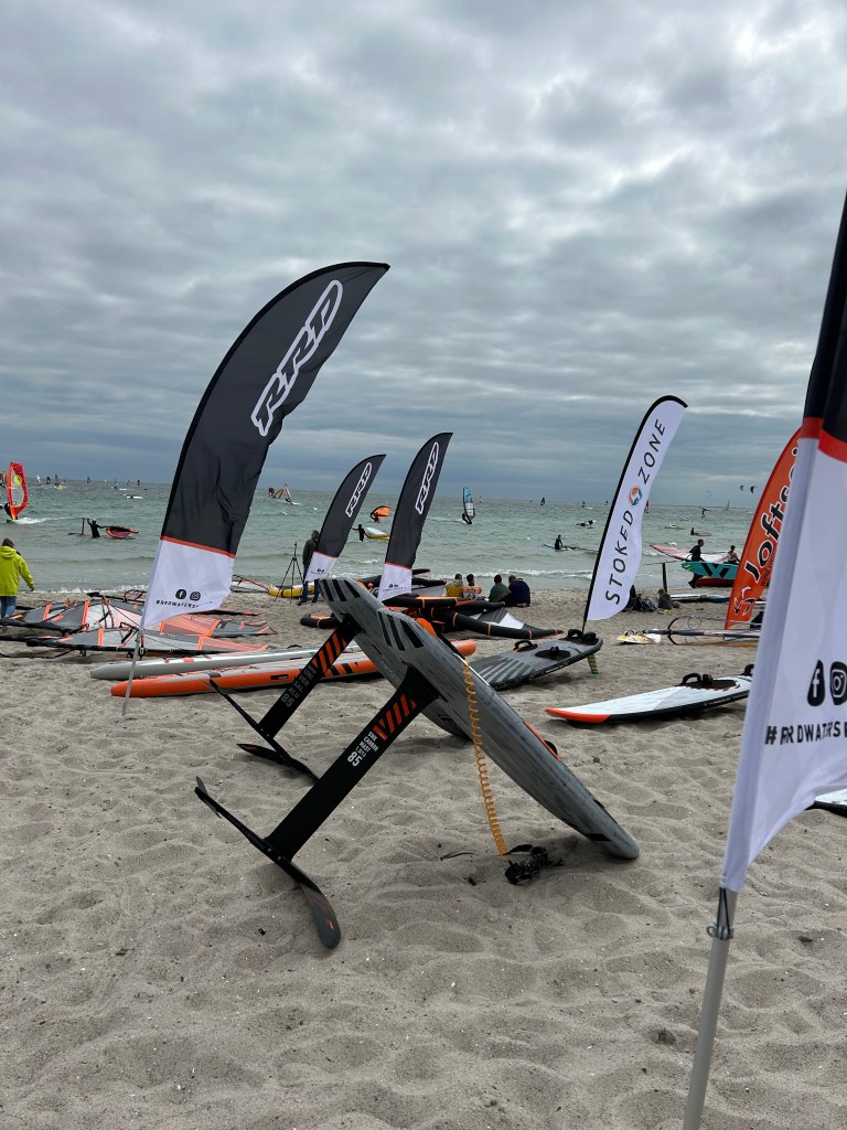 Wir schauen uns dafür noch am Strand die Stände der Ausrüster an. Kitezeug gibt es zwar nicht aber man merkt, dass Foilen jetzt der neue Trend ist. Überall Foilboards, Wingfoils, Wakefoiler oder Skatefoiler. Beim Schnack mit einem Verkäufer wird schnell klar, dass allein für einen Foil gut und gern fast 2000 Euro zusammen kommen können und da ist kein Board dabei.