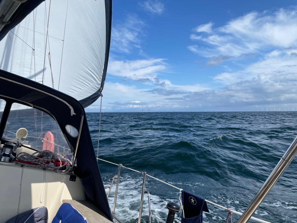 Weiter draußen dann nimmt der Seegang zu und kommt mehr seitlich. Das rollt uns kräftig durch. Die Kinder liegen unten, wir oben. Der Autopilot steuert und mittlerweile scheint sogar die Sonne. Wir fressen gut Meilen und vor uns taucht die Brücke über den großen Belt auf.